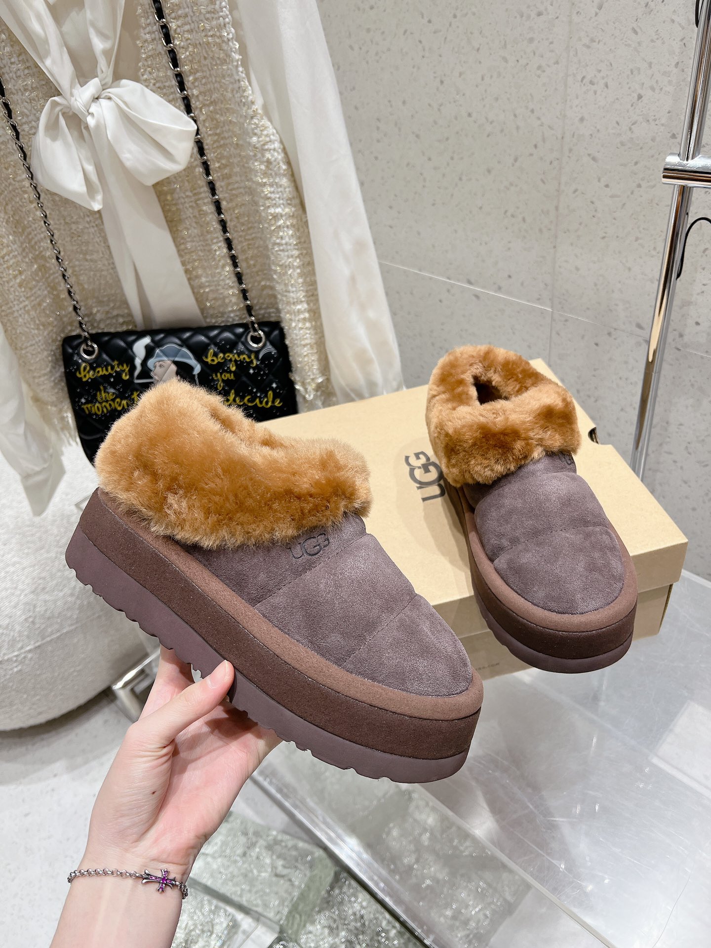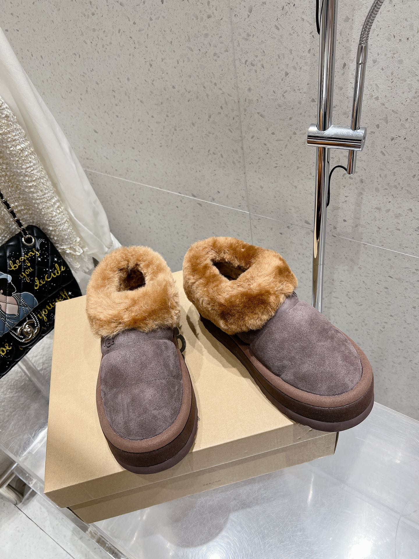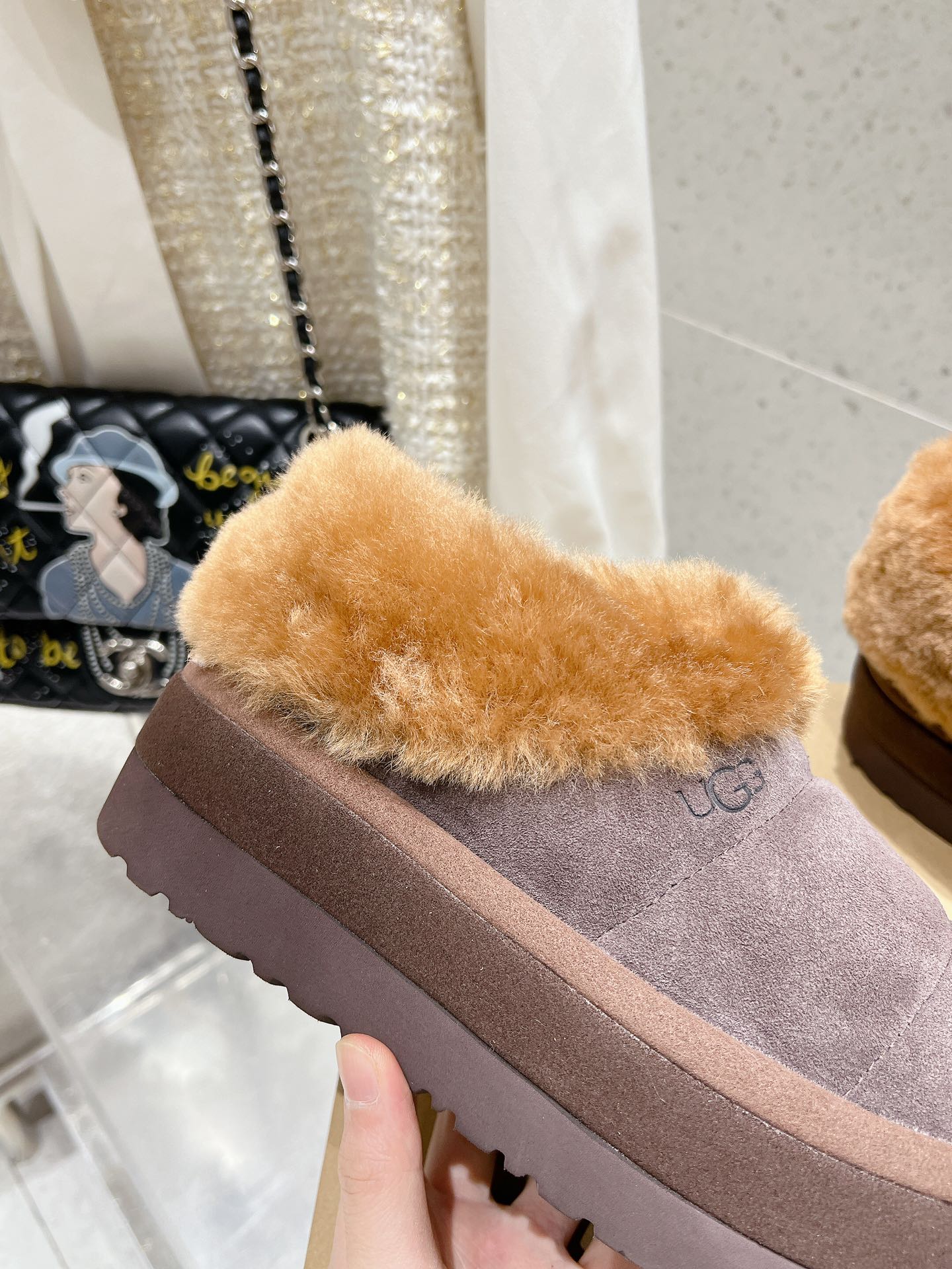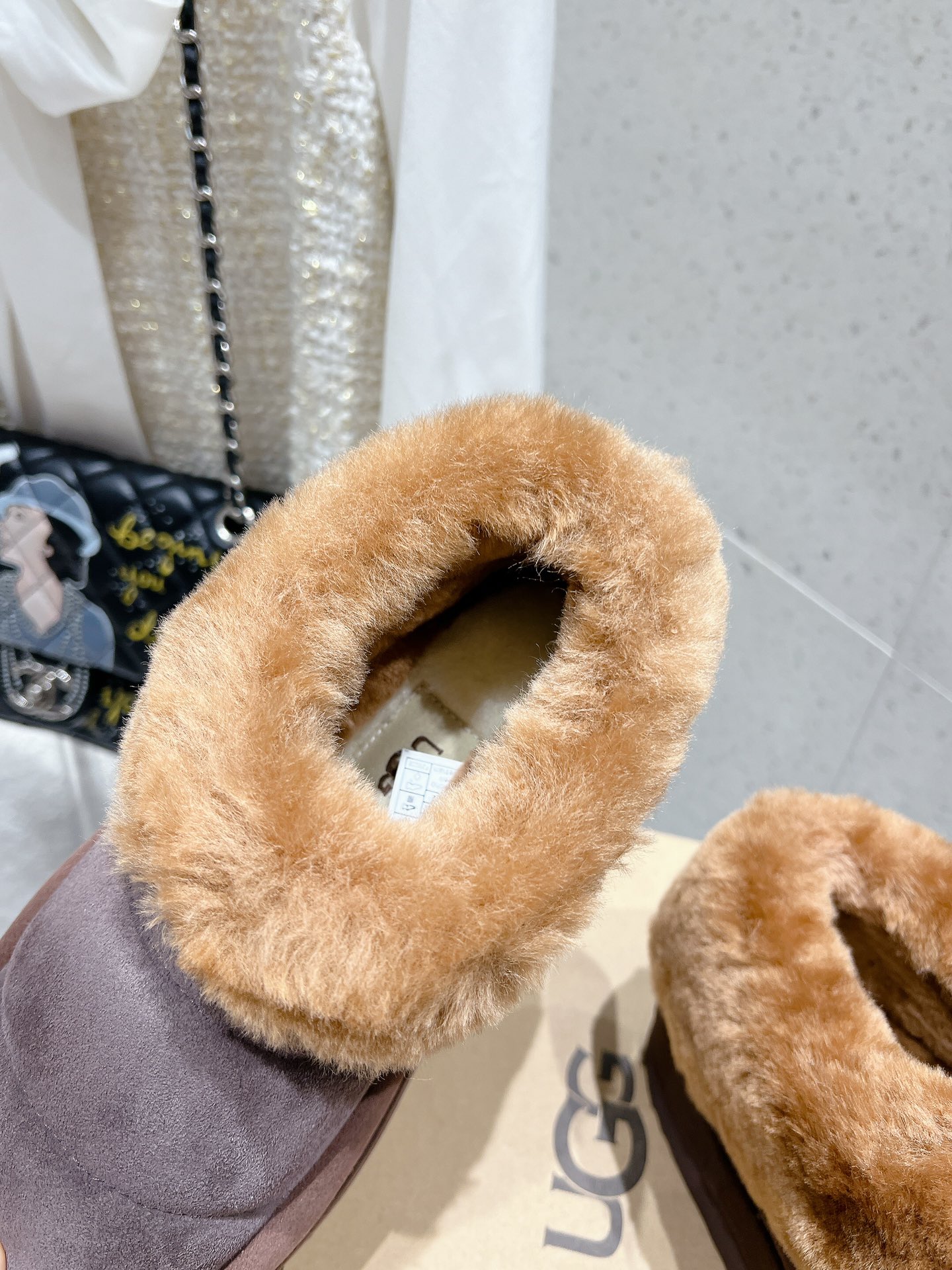 这款鞋子是AAAAA 1:1 质量 (非常棒). 使用了和原版一模一样的材料. 商标部分也保持了和UGG雪地靴一样. 图片拍摄是实物鞋子拍摄, 您所收到的实物保证和我们图片一模一样.