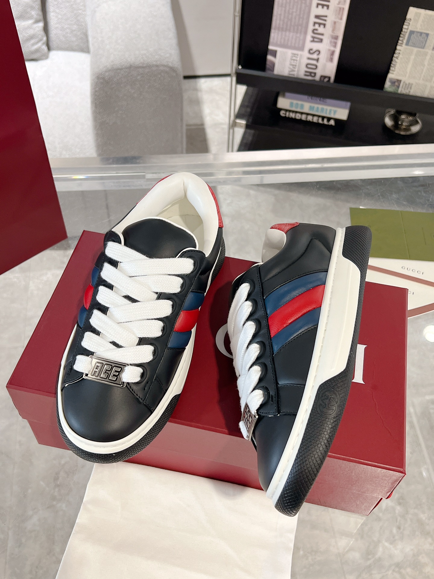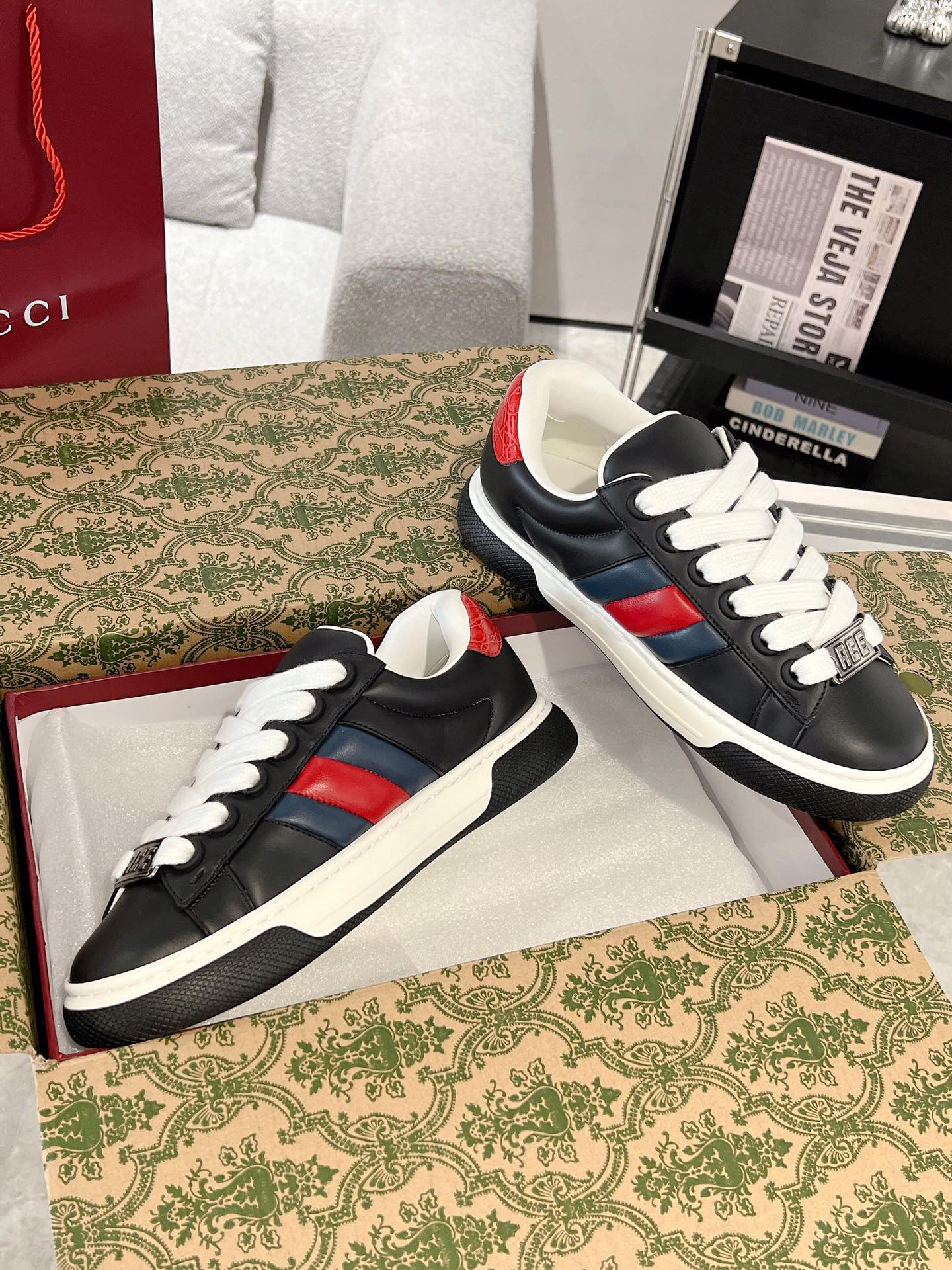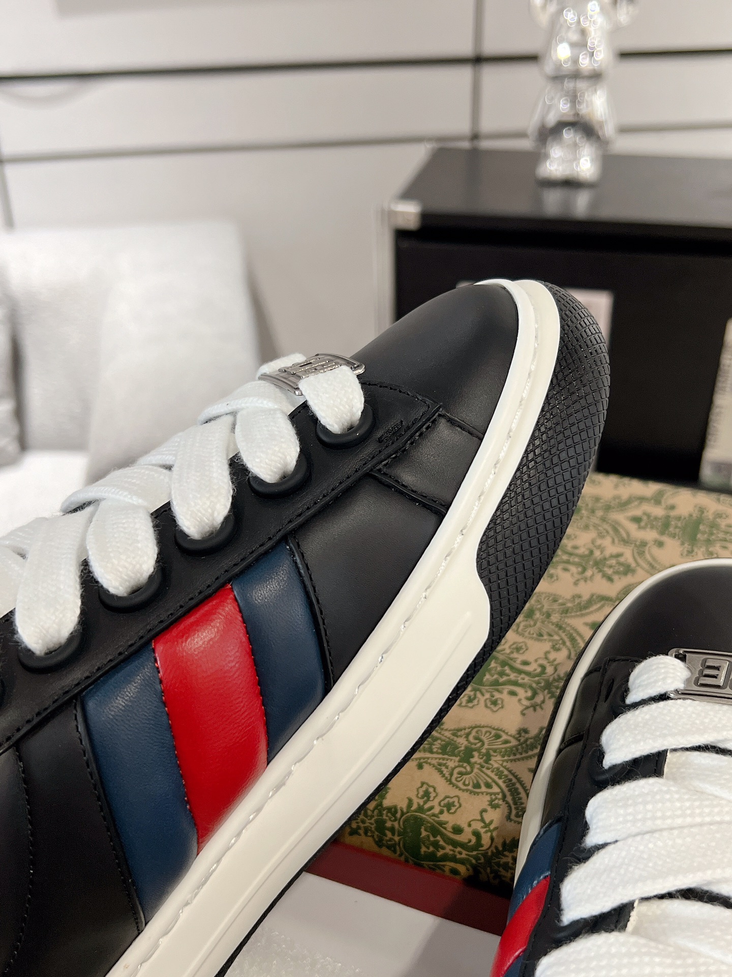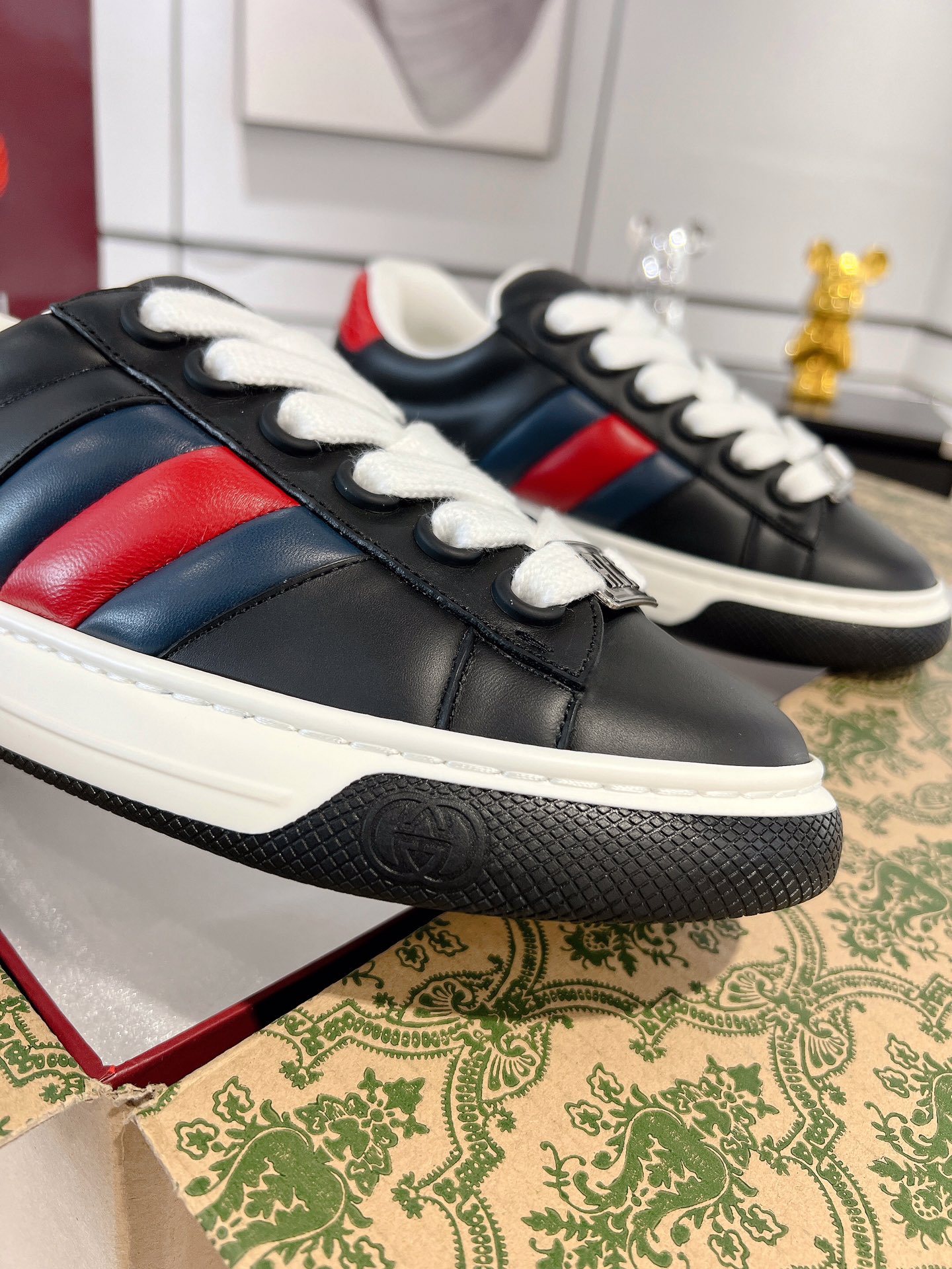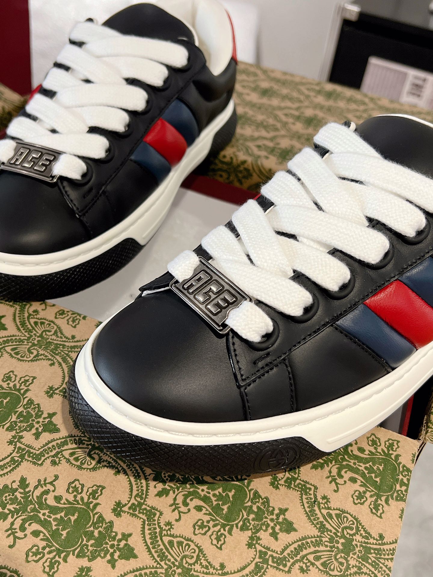 这款鞋子是AAAAA 1:1 质量 (非常棒). 使用了和原版一模一样的材料. 商标部分也保持了和古奇/Gucci一样. 图片拍摄是实物鞋子拍摄, 您所收到的实物保证和我们图片一模一样.