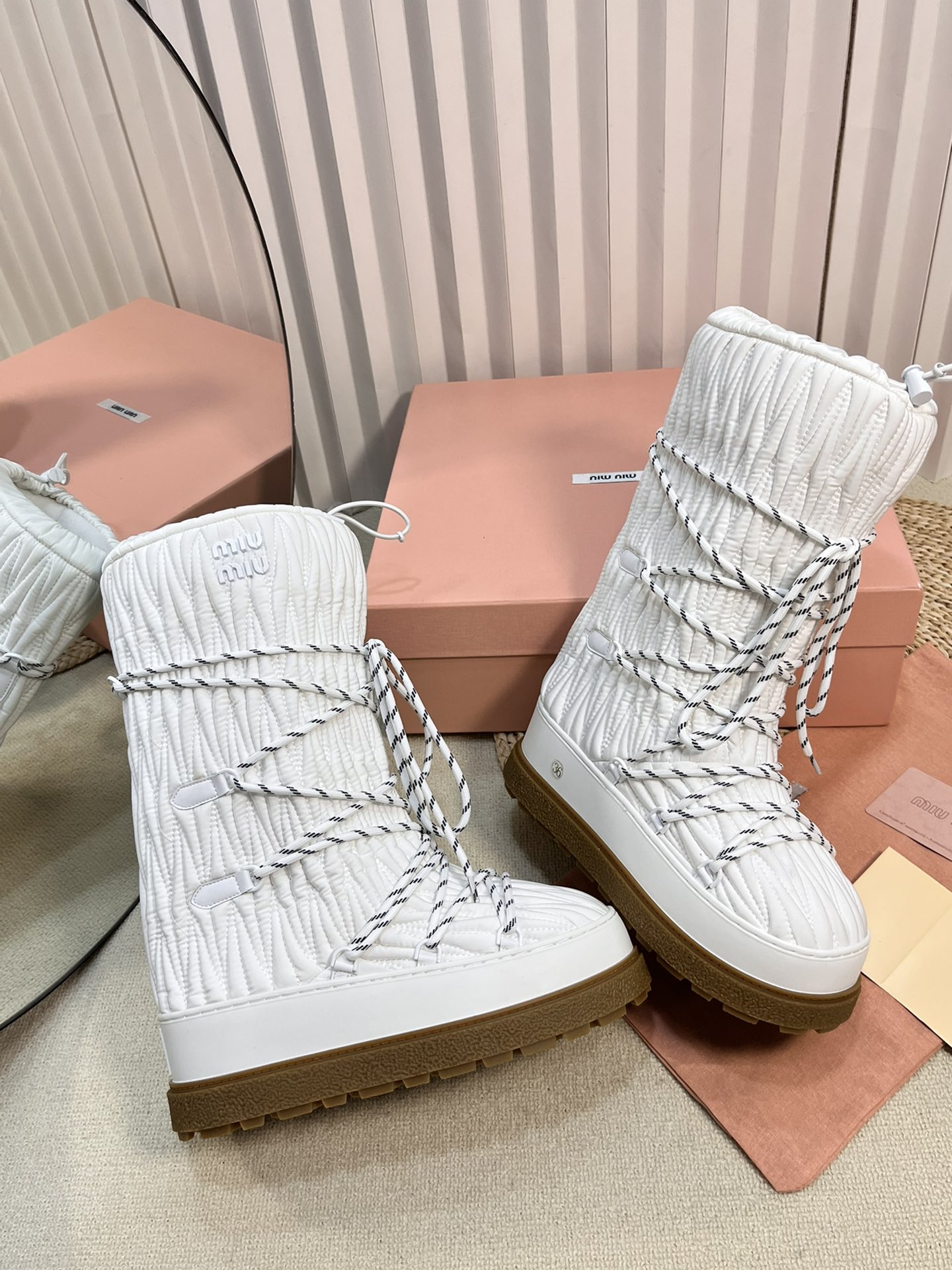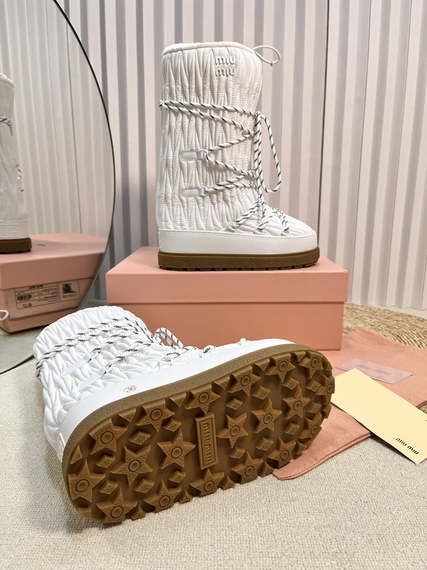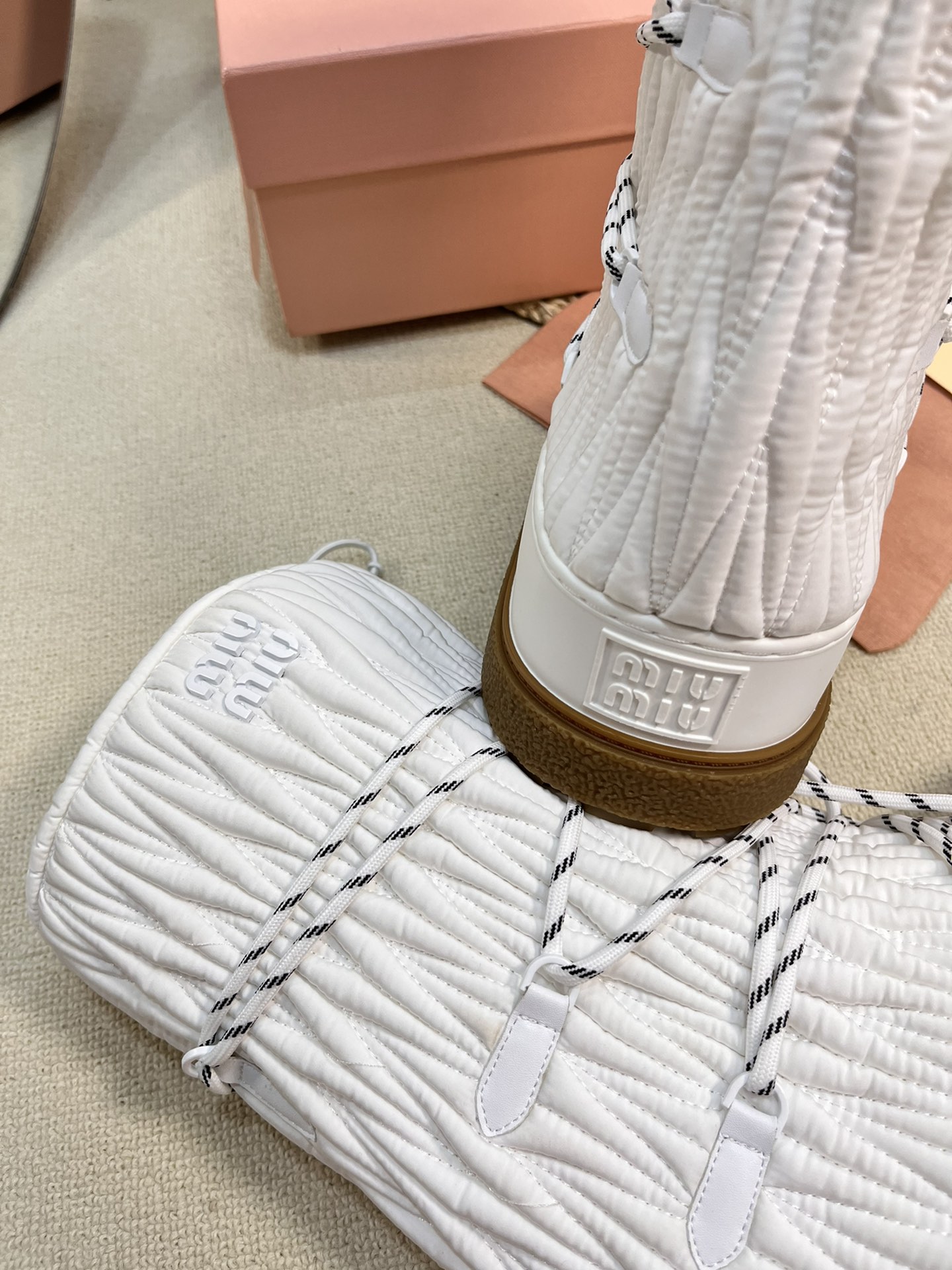 这款鞋子是AAAAA 1:1 质量 (非常棒). 使用了和原版一模一样的材料. 商标部分也保持了和缪缪/Miu Miu一样. 图片拍摄是实物鞋子拍摄, 您所收到的实物保证和我们图片一模一样.