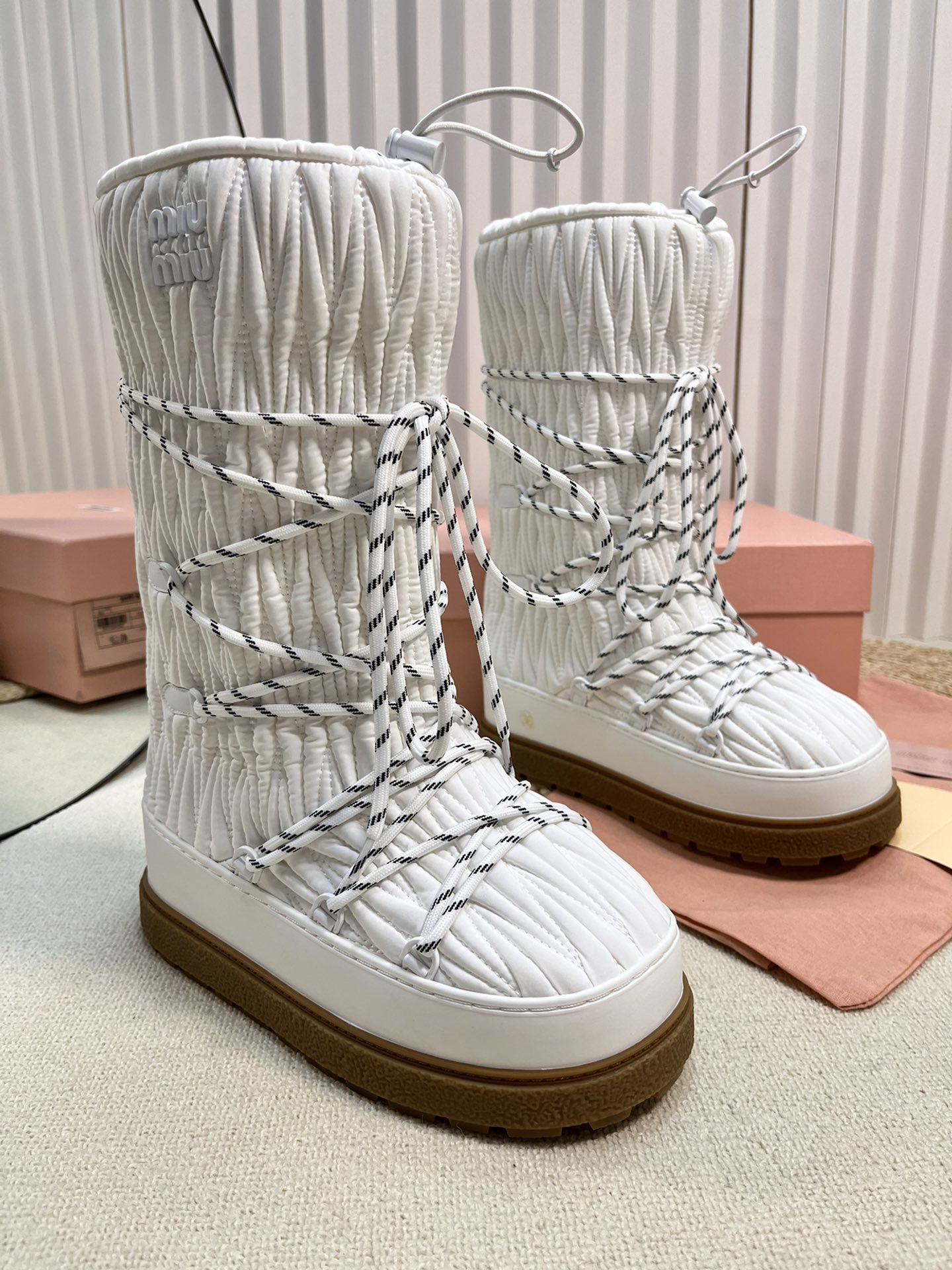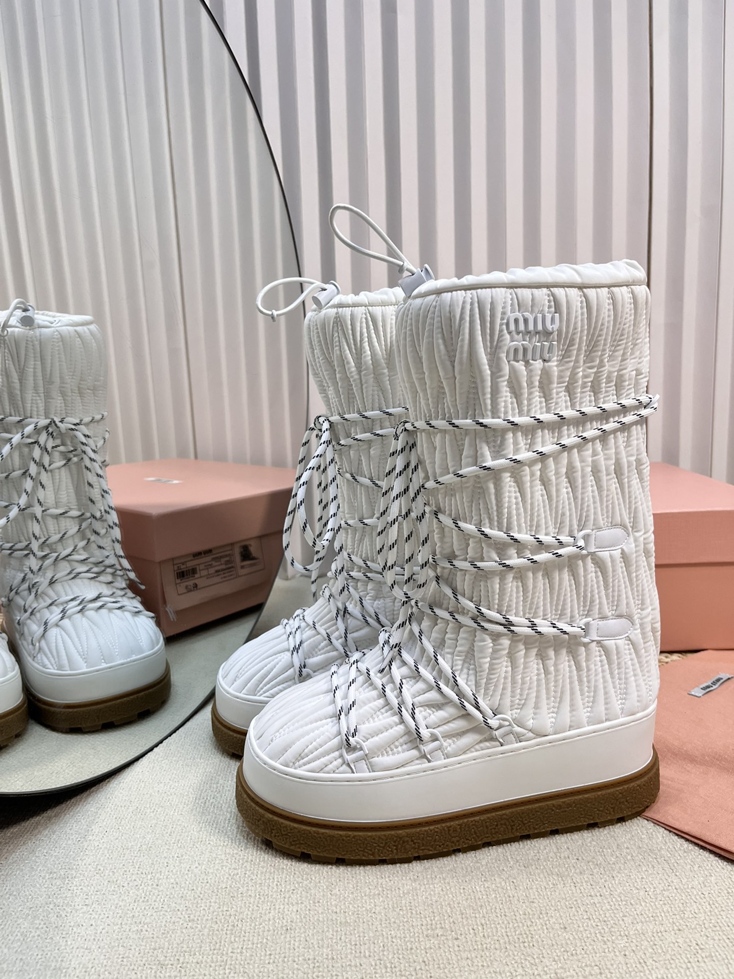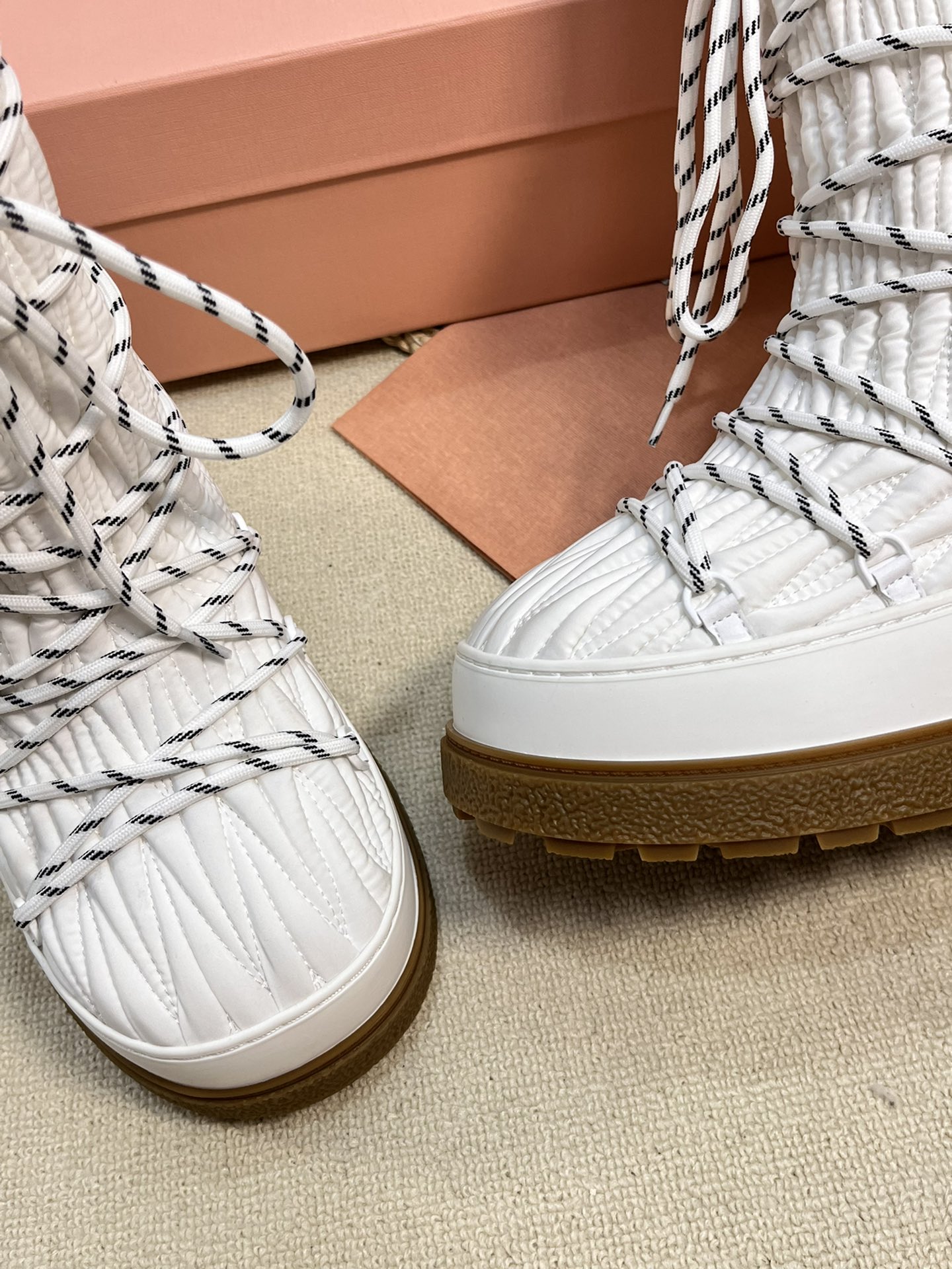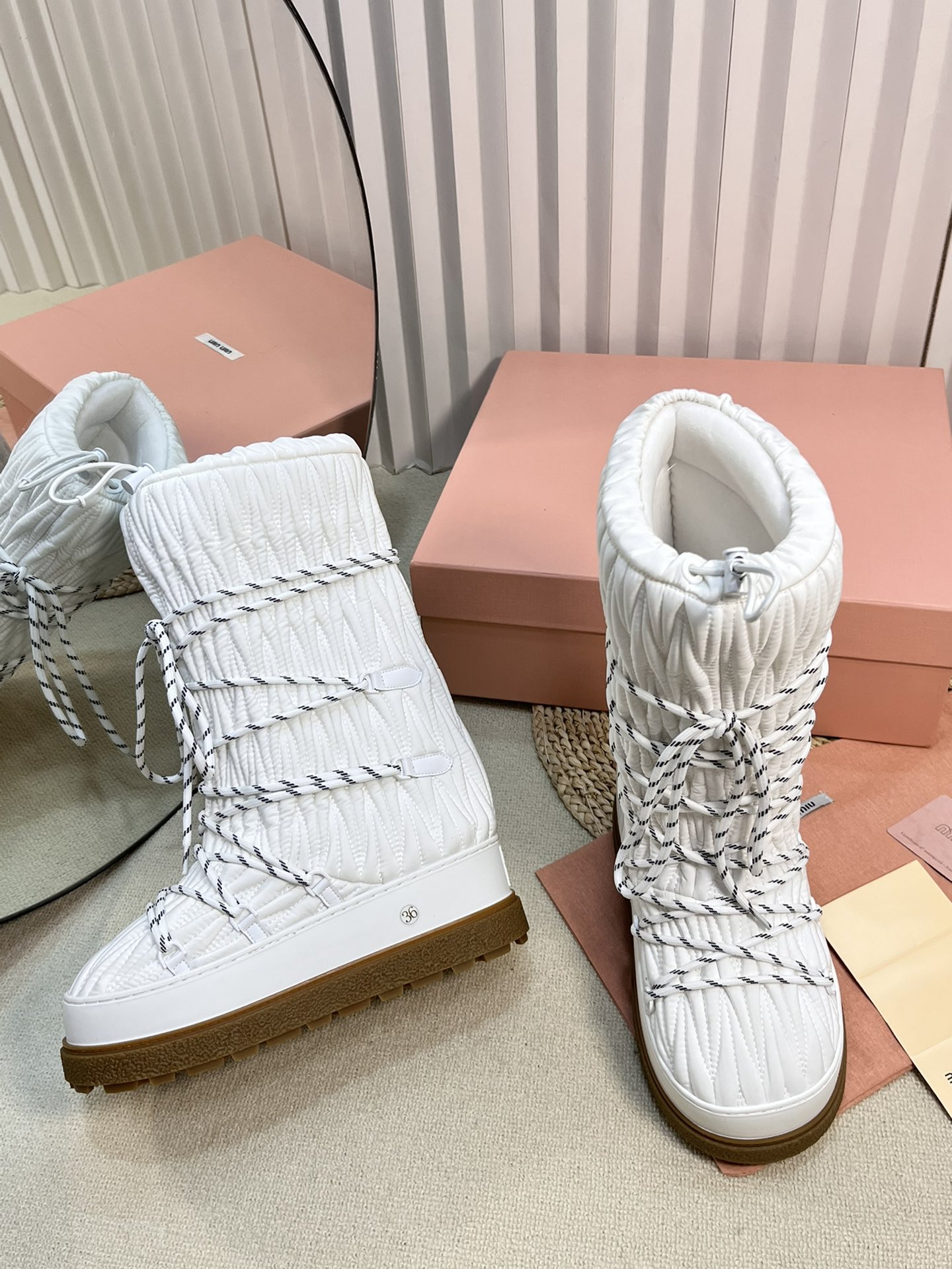 这款鞋子是AAAAA 1:1 质量 (非常棒). 使用了和原版一模一样的材料. 商标部分也保持了和缪缪/Miu Miu一样. 图片拍摄是实物鞋子拍摄, 您所收到的实物保证和我们图片一模一样.