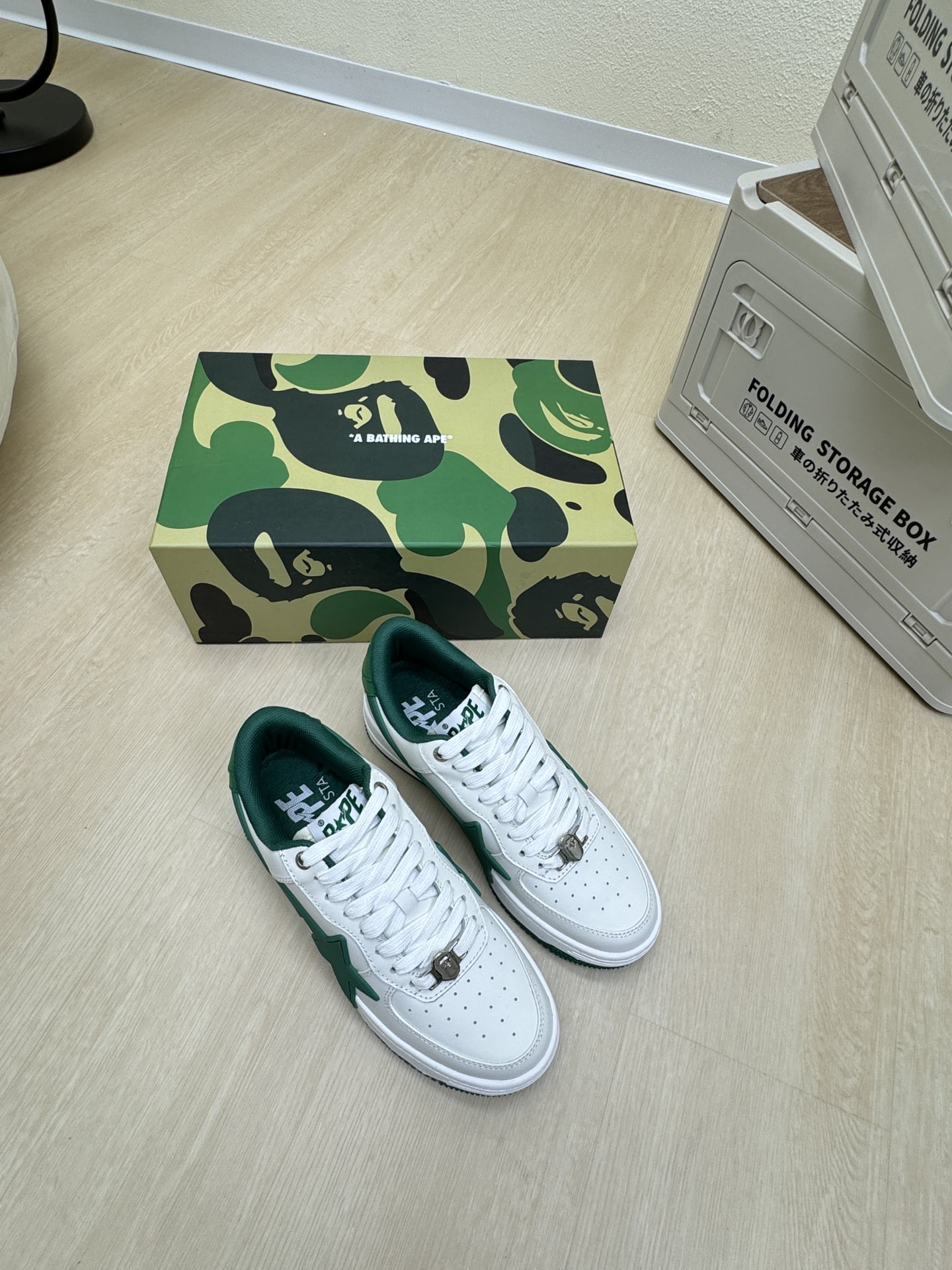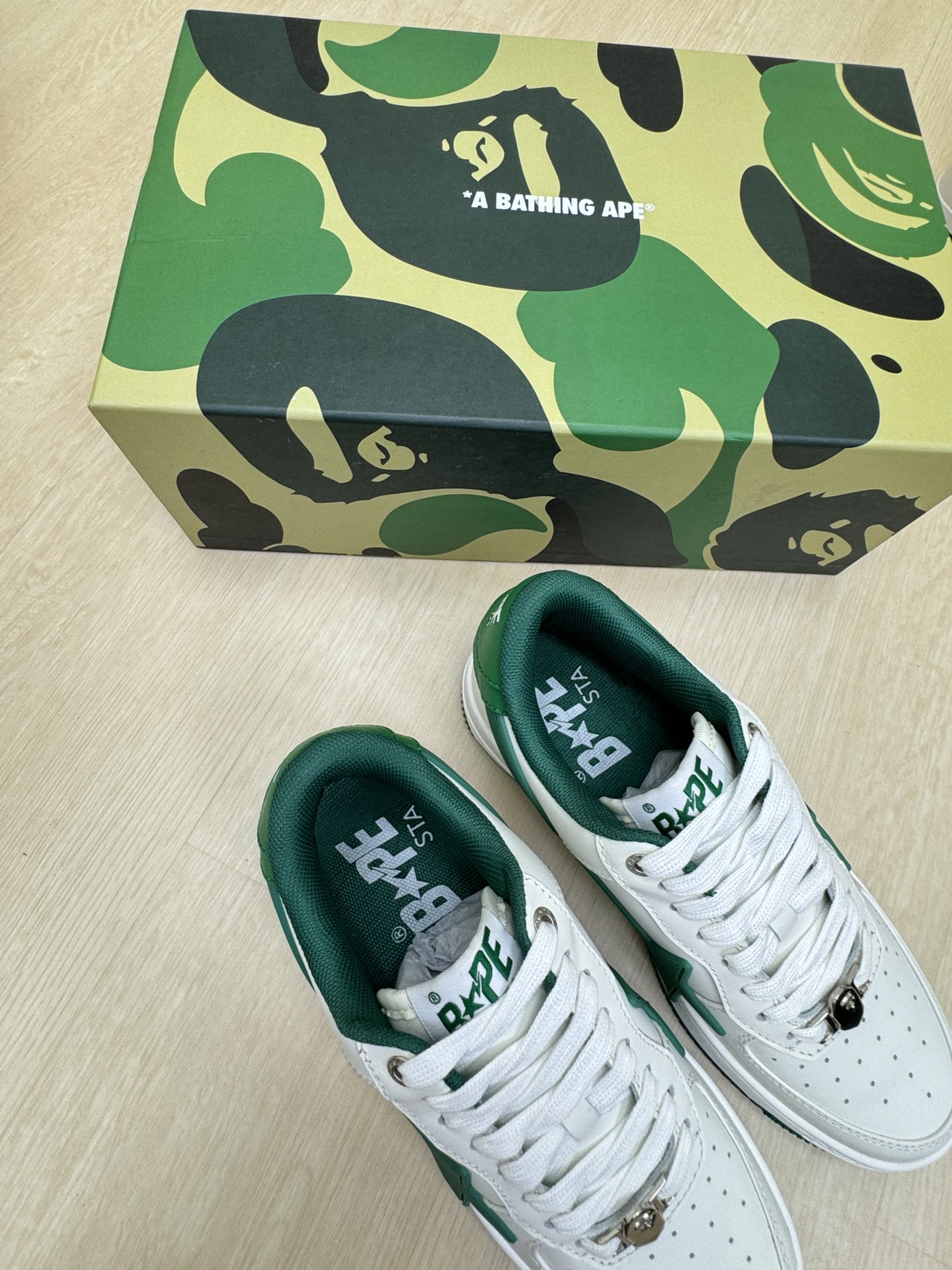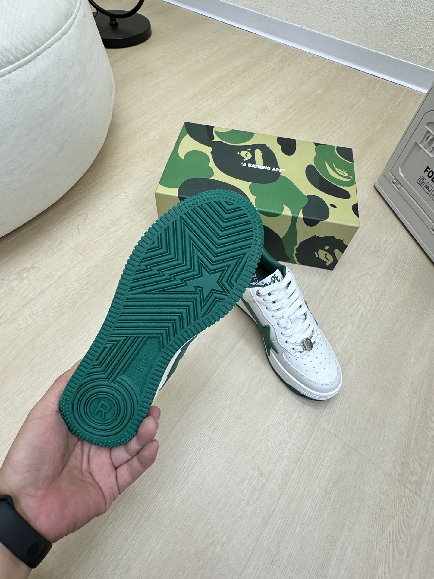 这款鞋子是AAAAA 1:1 质量 (非常棒). 使用了和原版一模一样的材料. 商标部分也保持了和Bape一样. 图片拍摄是实物鞋子拍摄, 您所收到的实物保证和我们图片一模一样.