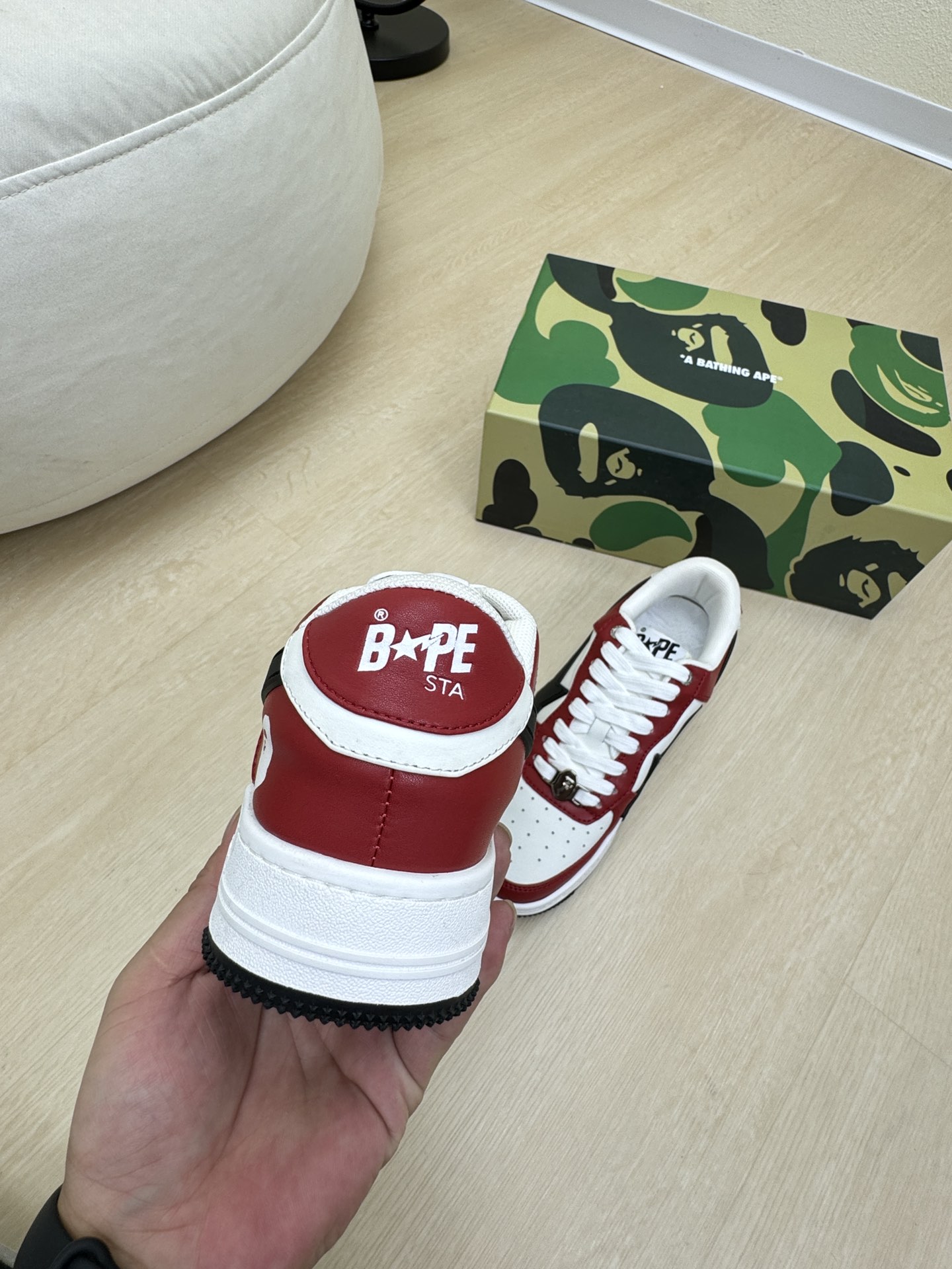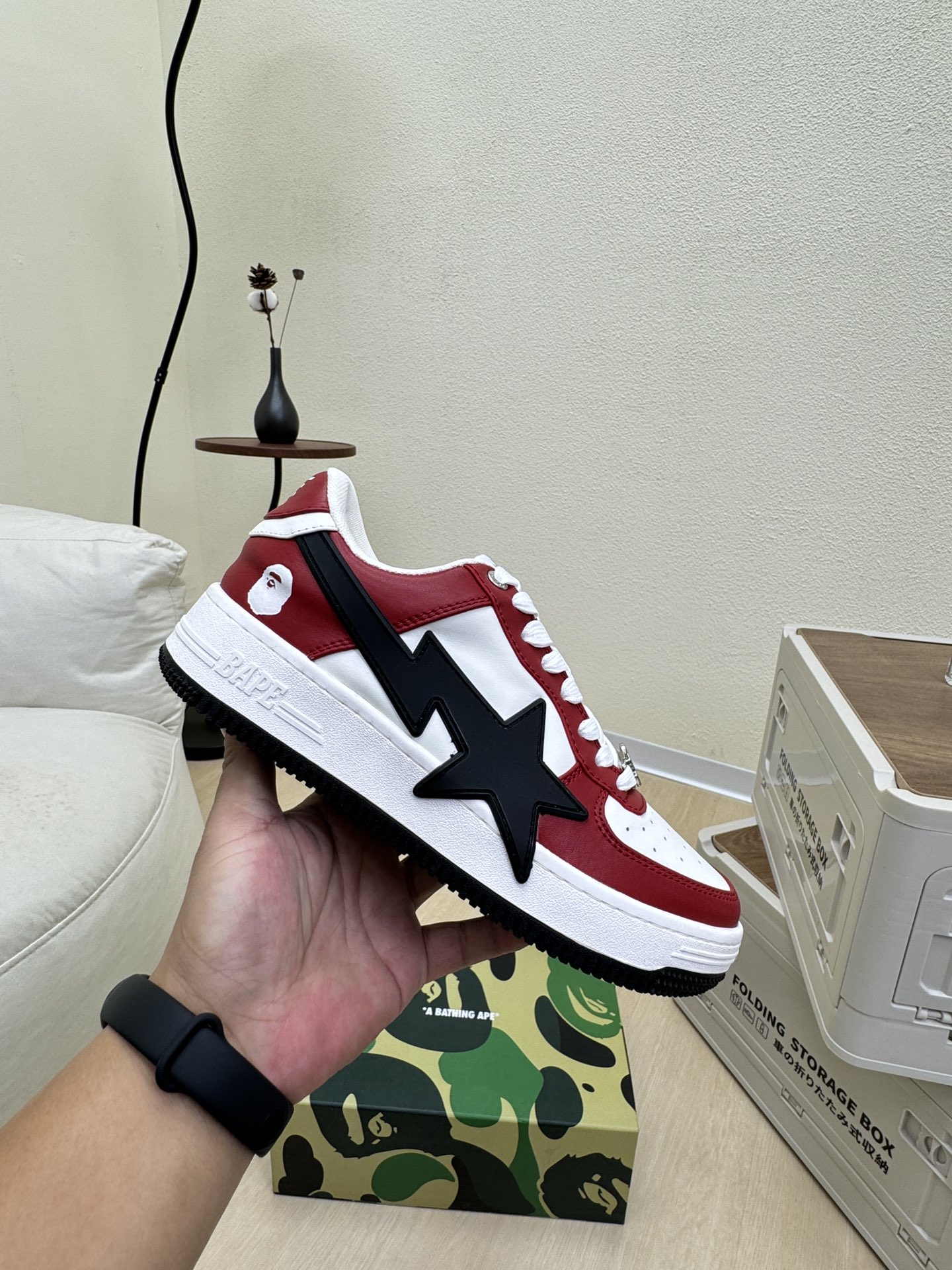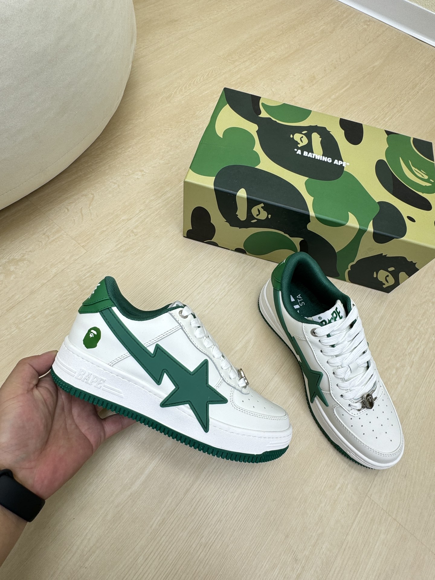 这款鞋子是AAAAA 1:1 质量 (非常棒). 使用了和原版一模一样的材料. 商标部分也保持了和Bape一样. 图片拍摄是实物鞋子拍摄, 您所收到的实物保证和我们图片一模一样.