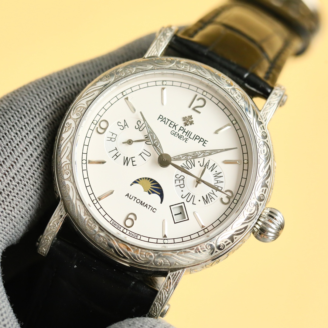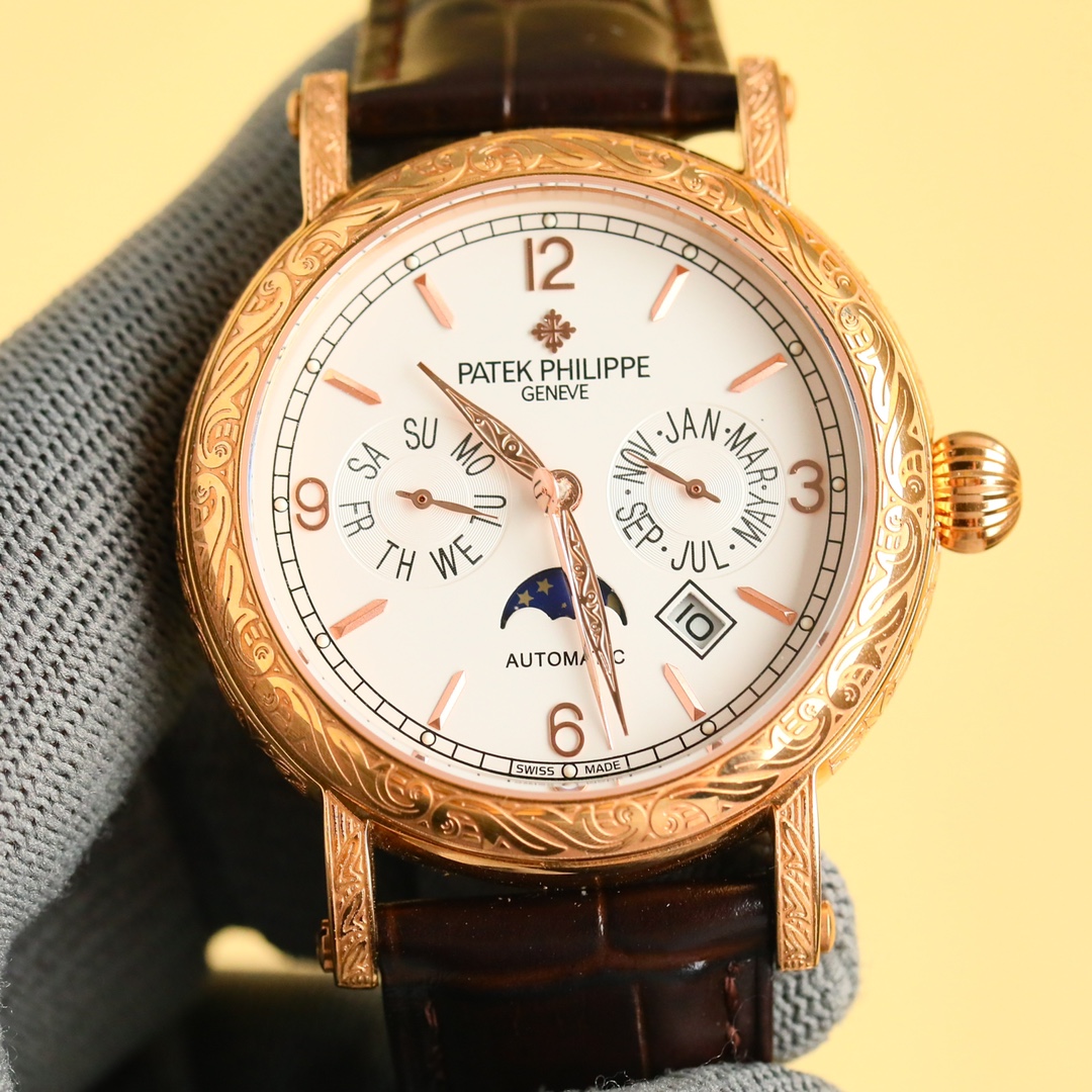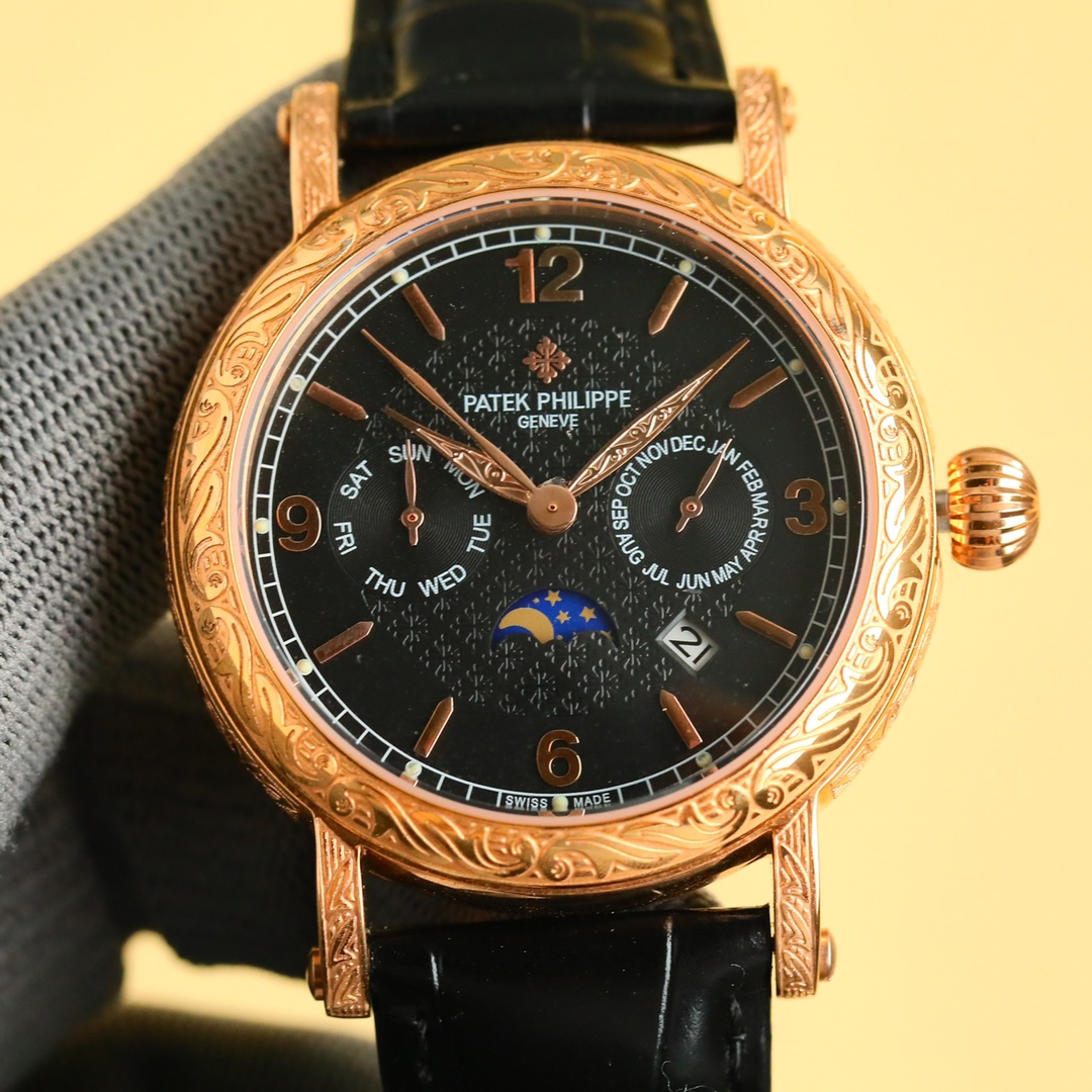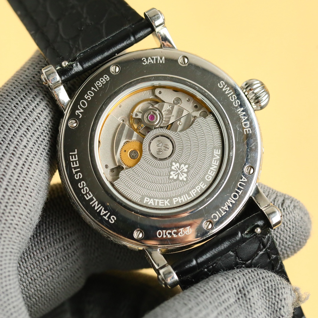 这款手表是AAAAA 1:1 质量 (非常棒). 使用了和原版一模一样的材料. 商标部分也保持了和百达翡丽/Patek Philippe一样. 图片拍摄是实物手表拍摄, 您所收到的实物保证和我们图片一模一样.