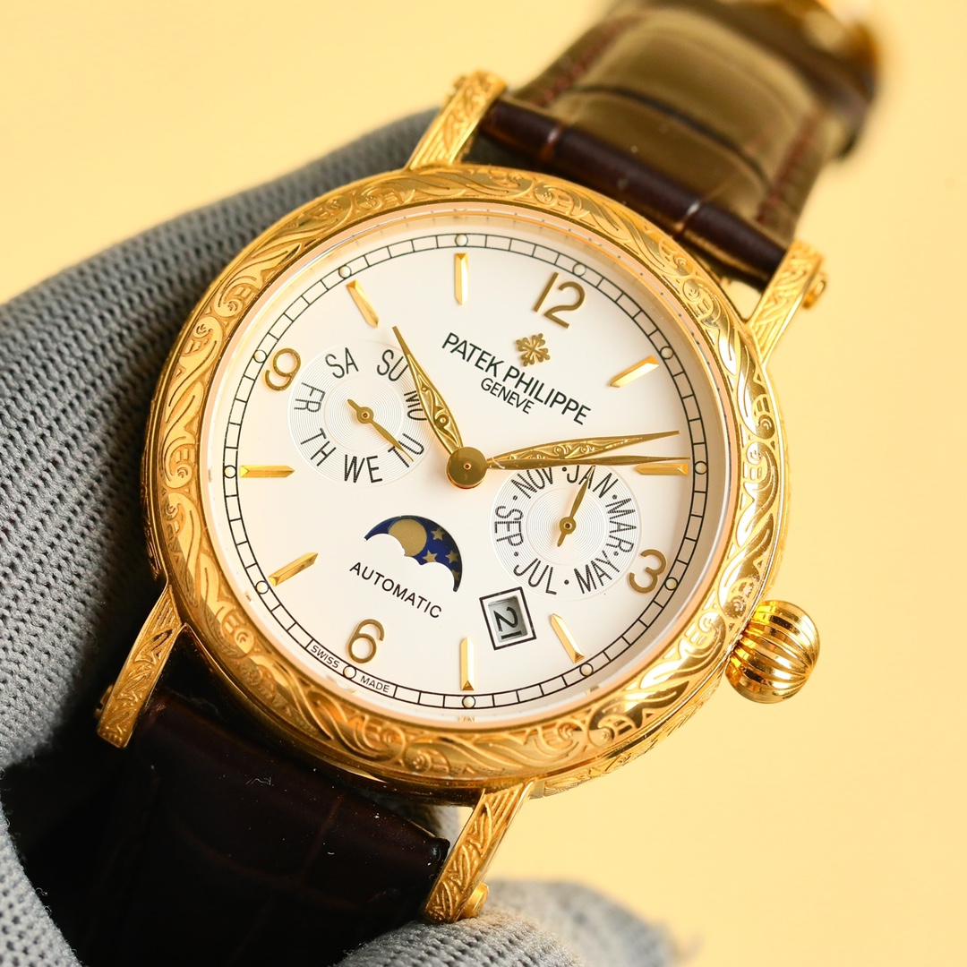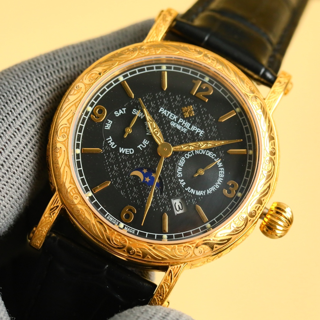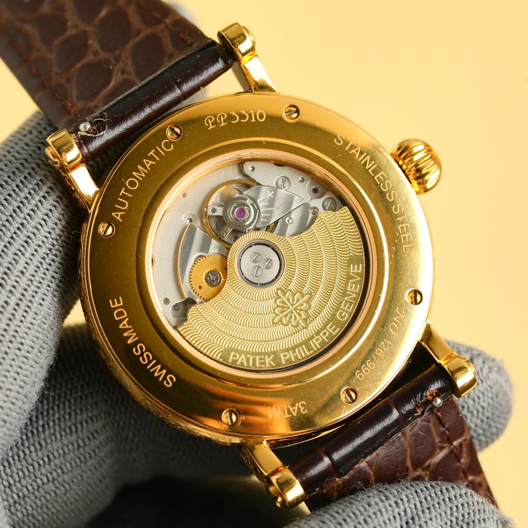这款手表是AAAAA 1:1 质量 (非常棒). 使用了和原版一模一样的材料. 商标部分也保持了和百达翡丽/Patek Philippe一样. 图片拍摄是实物手表拍摄, 您所收到的实物保证和我们图片一模一样.