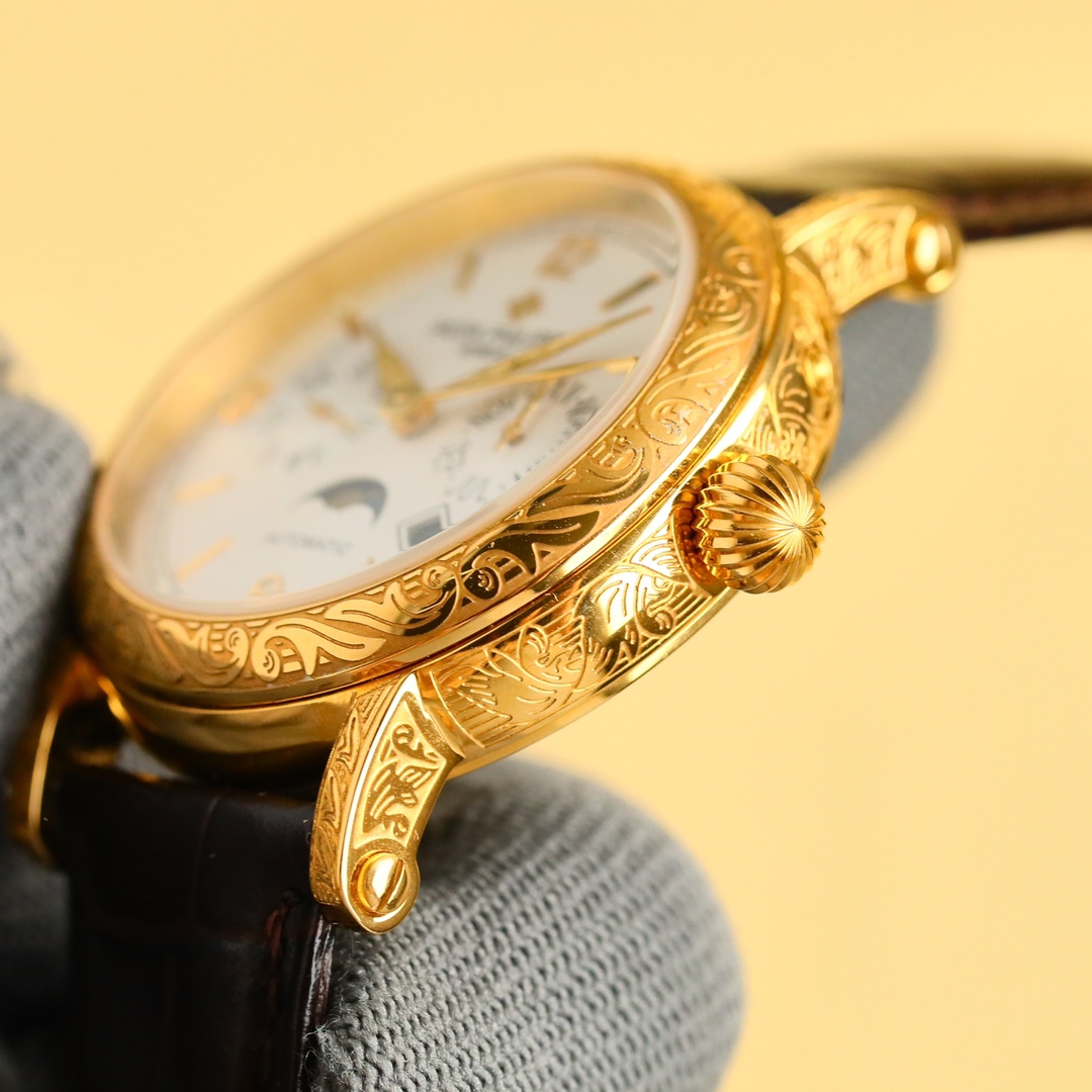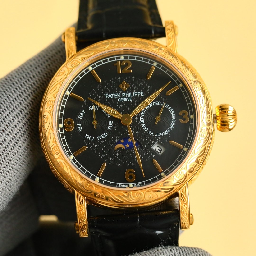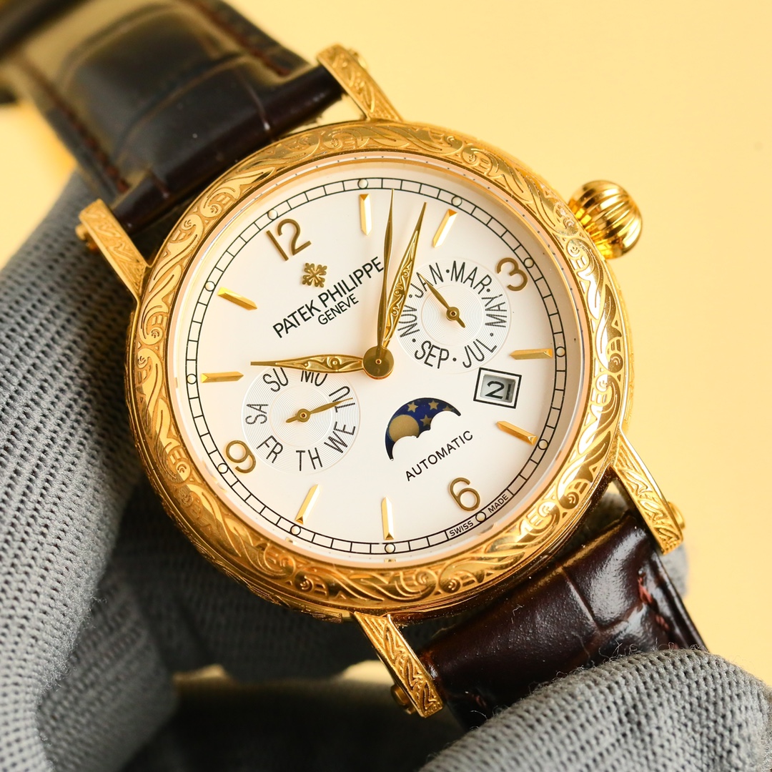 这款手表是AAAAA 1:1 质量 (非常棒). 使用了和原版一模一样的材料. 商标部分也保持了和百达翡丽/Patek Philippe一样. 图片拍摄是实物手表拍摄, 您所收到的实物保证和我们图片一模一样.