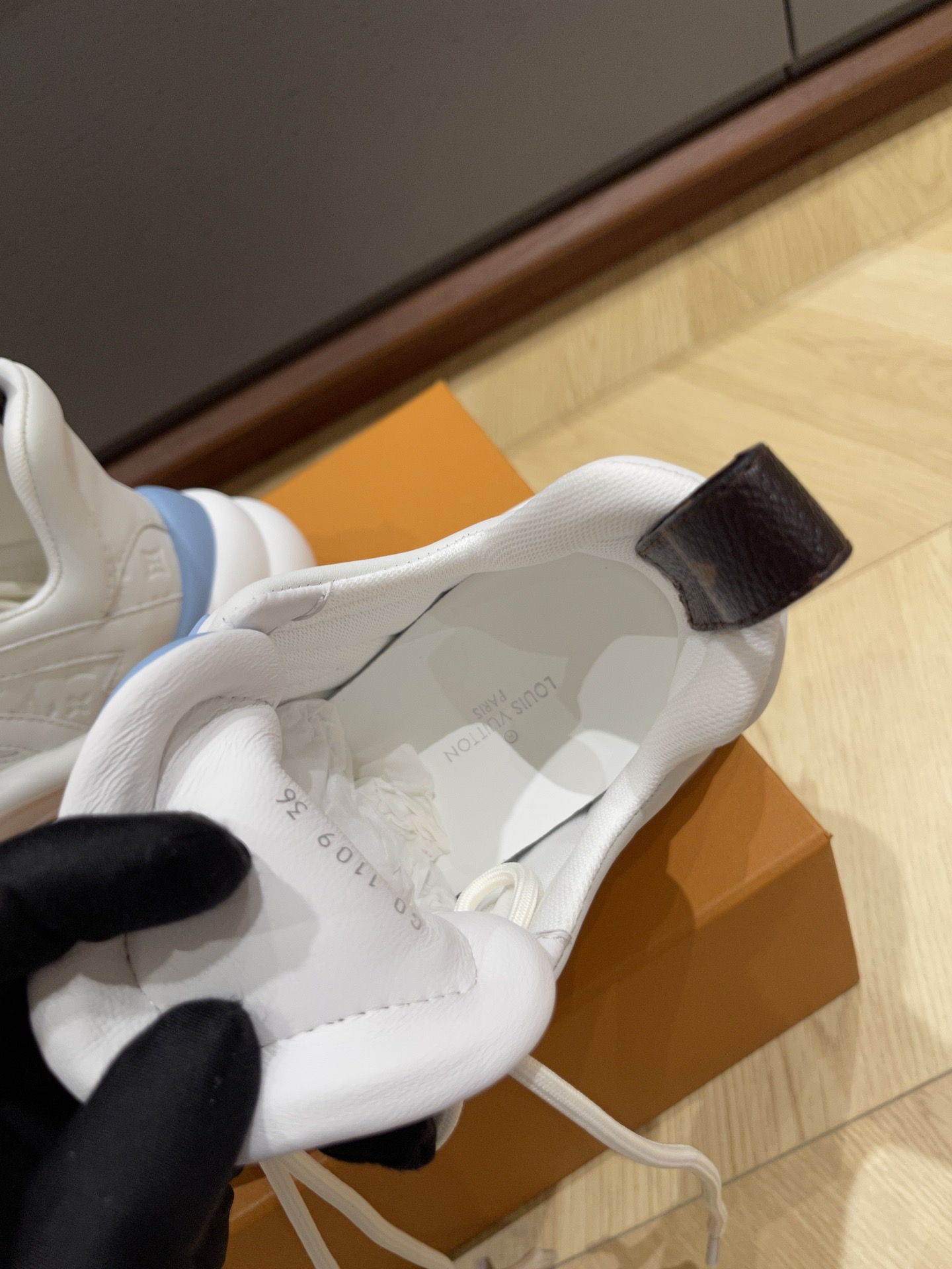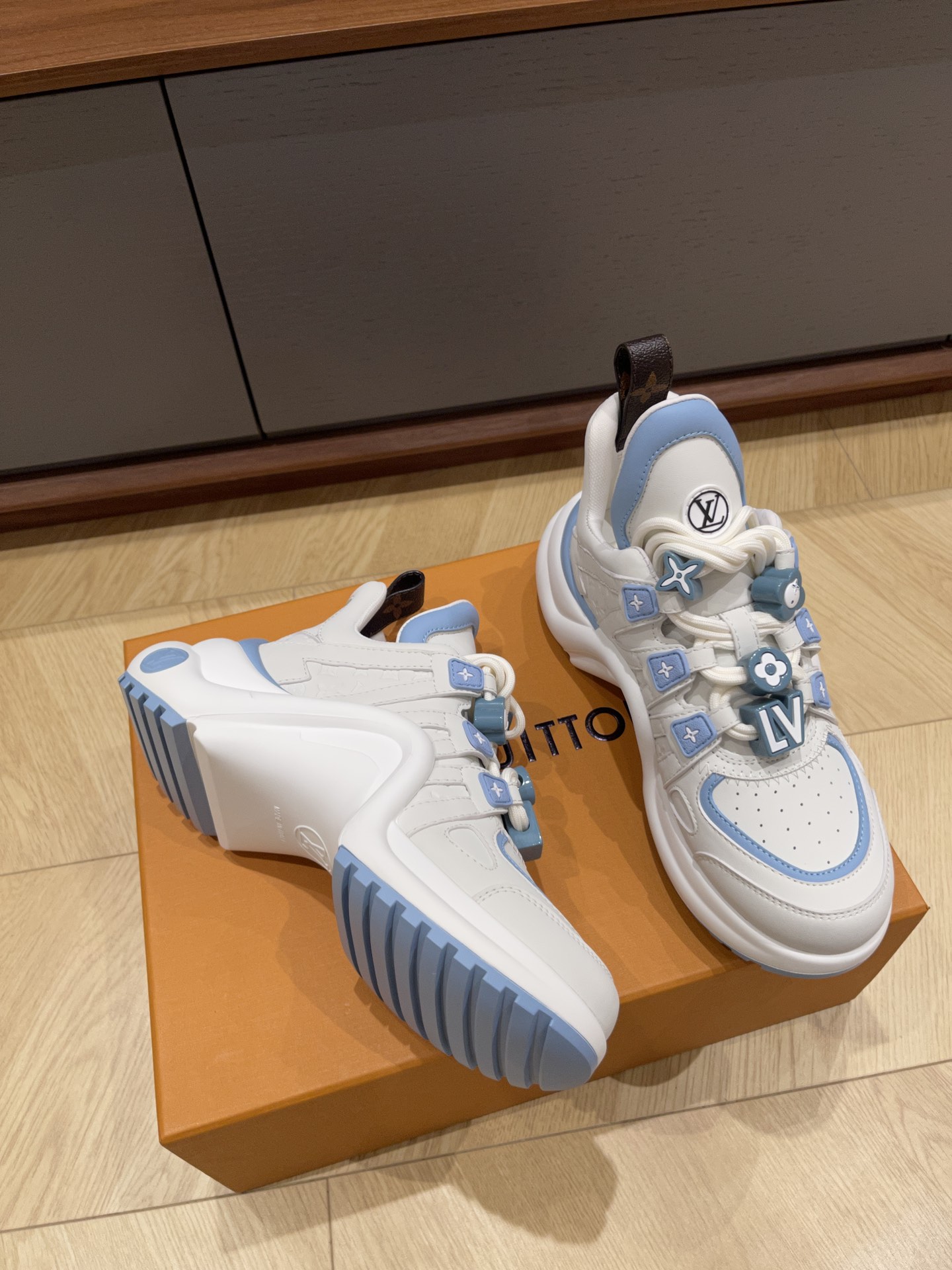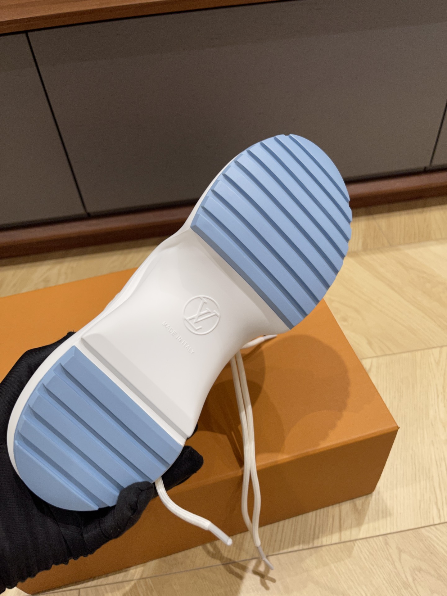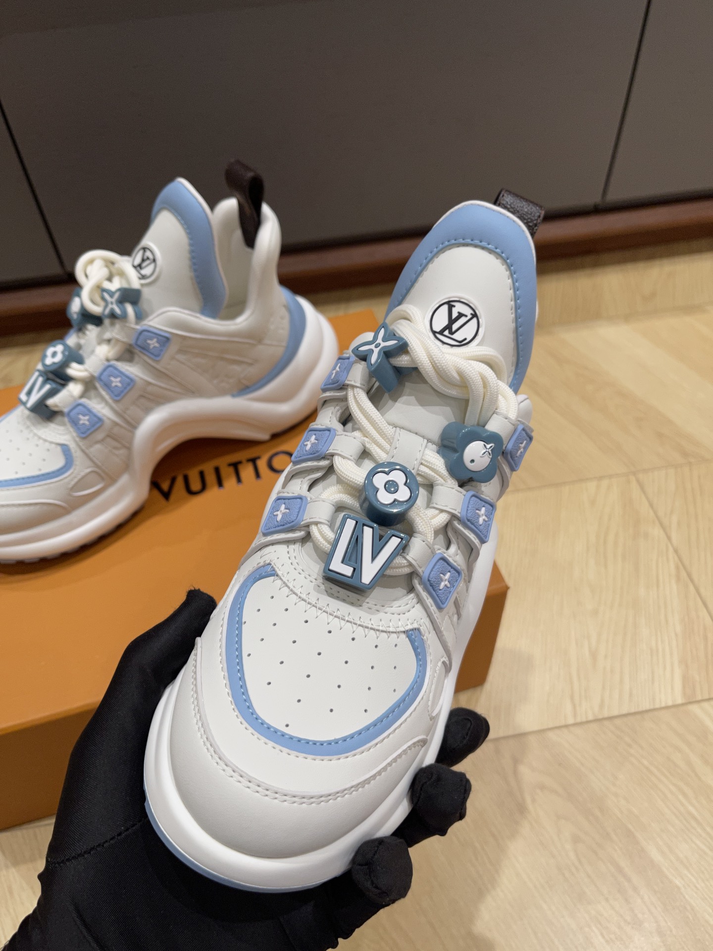这款鞋子是AAAAA 1:1 质量 (非常棒). 使用了和原版一模一样的材料. 商标部分也保持了和路易威登/Louis Vuitton一样. 图片拍摄是实物鞋子拍摄, 您所收到的实物保证和我们图片一模一样.