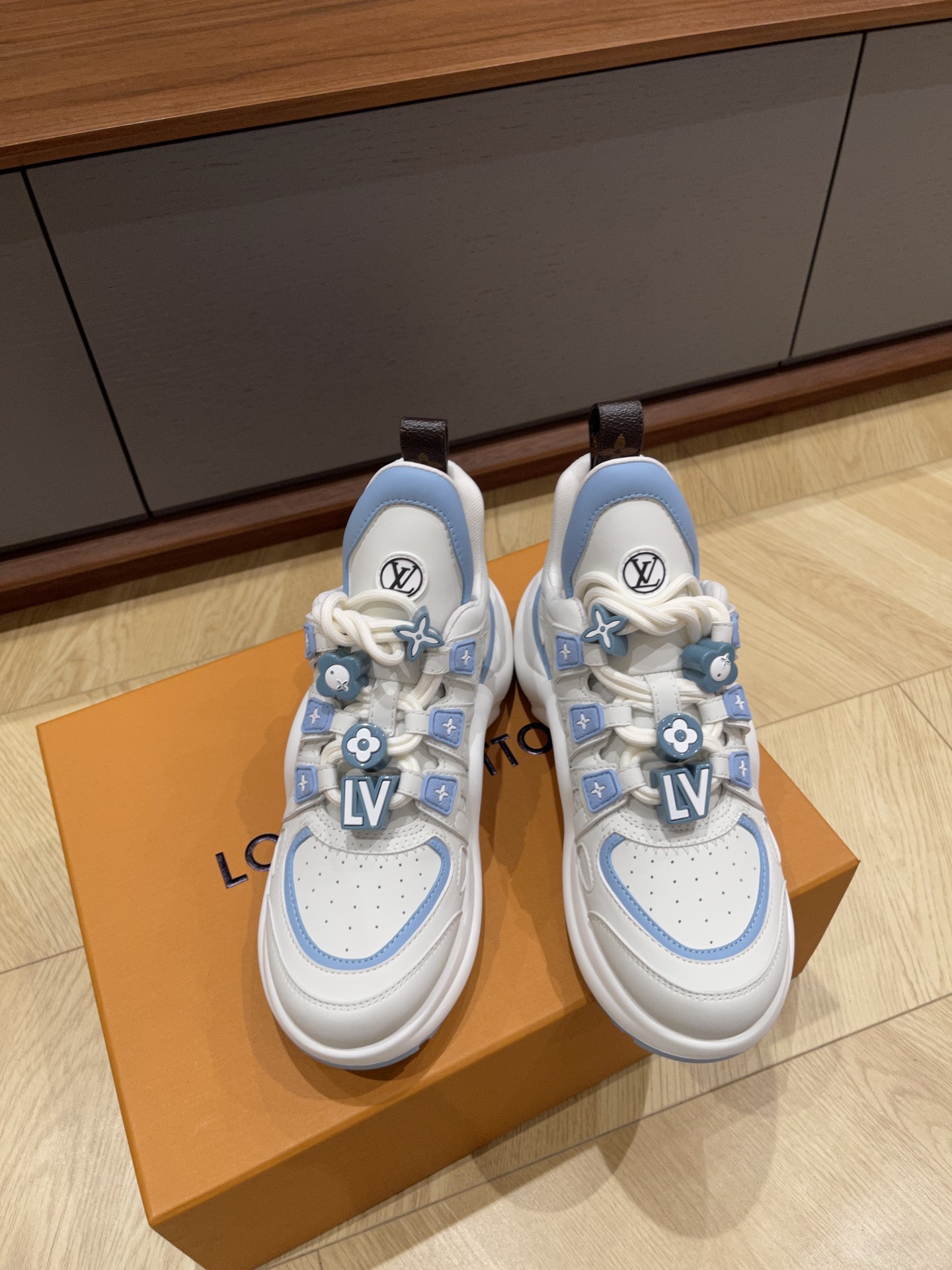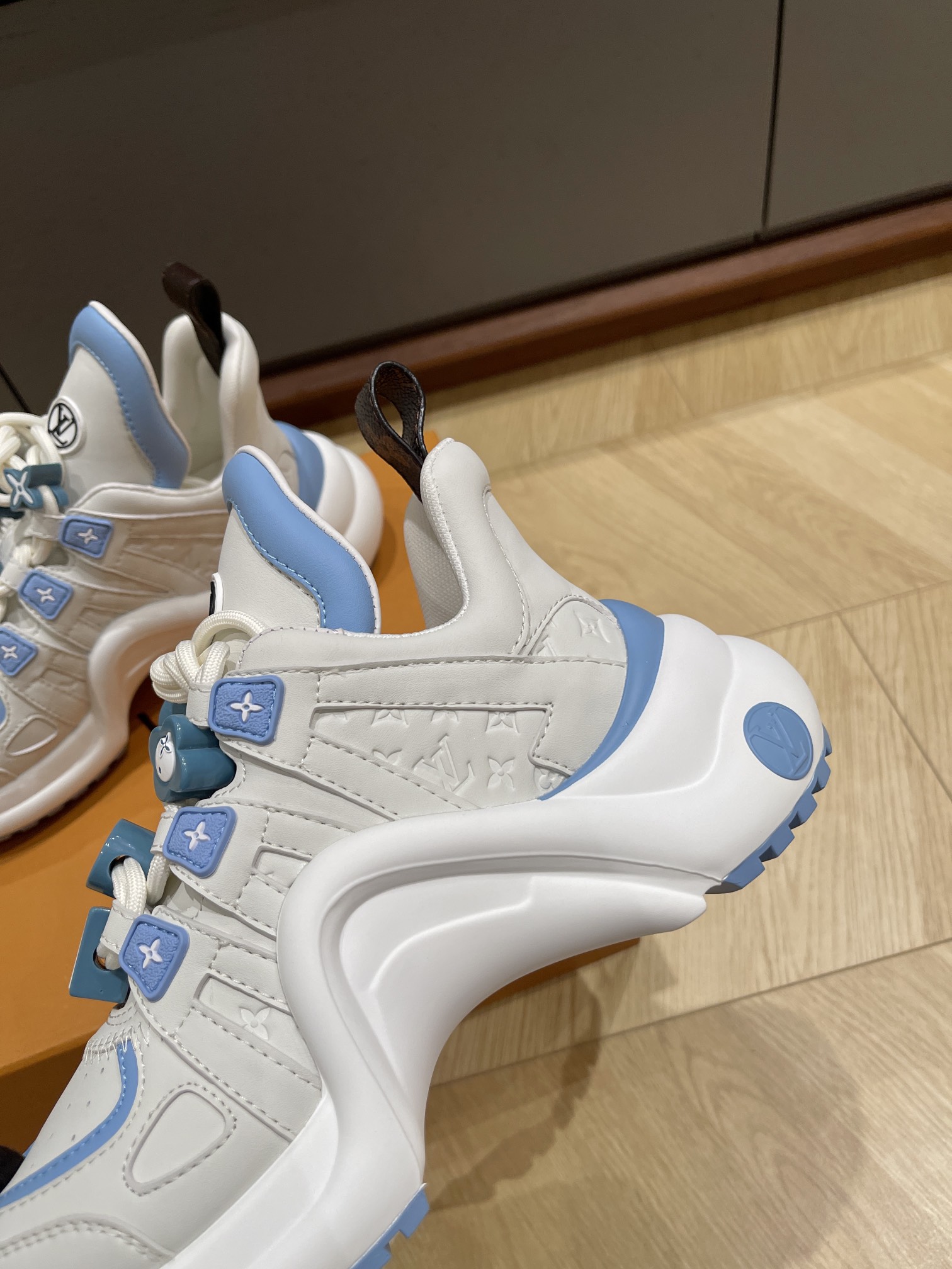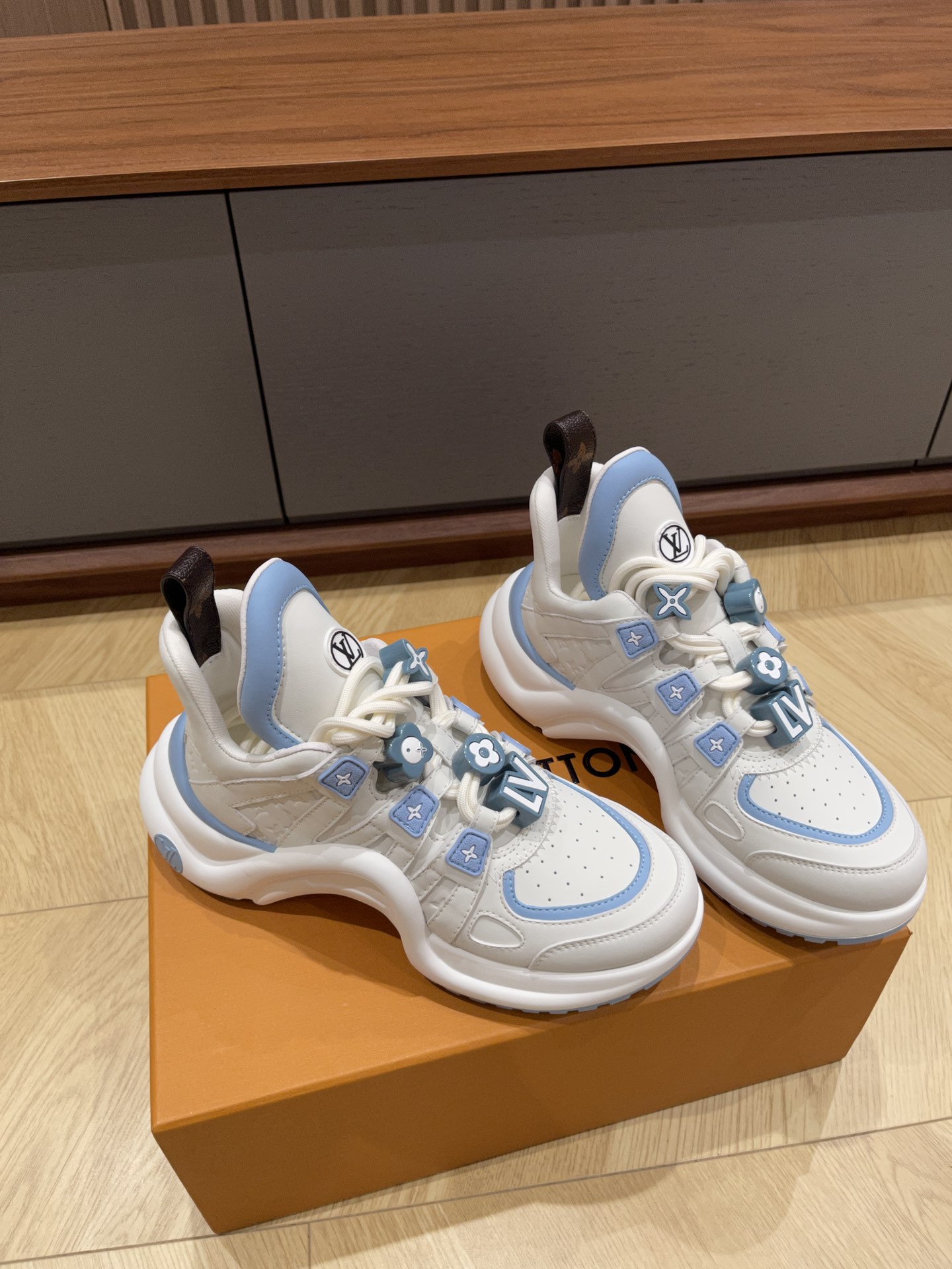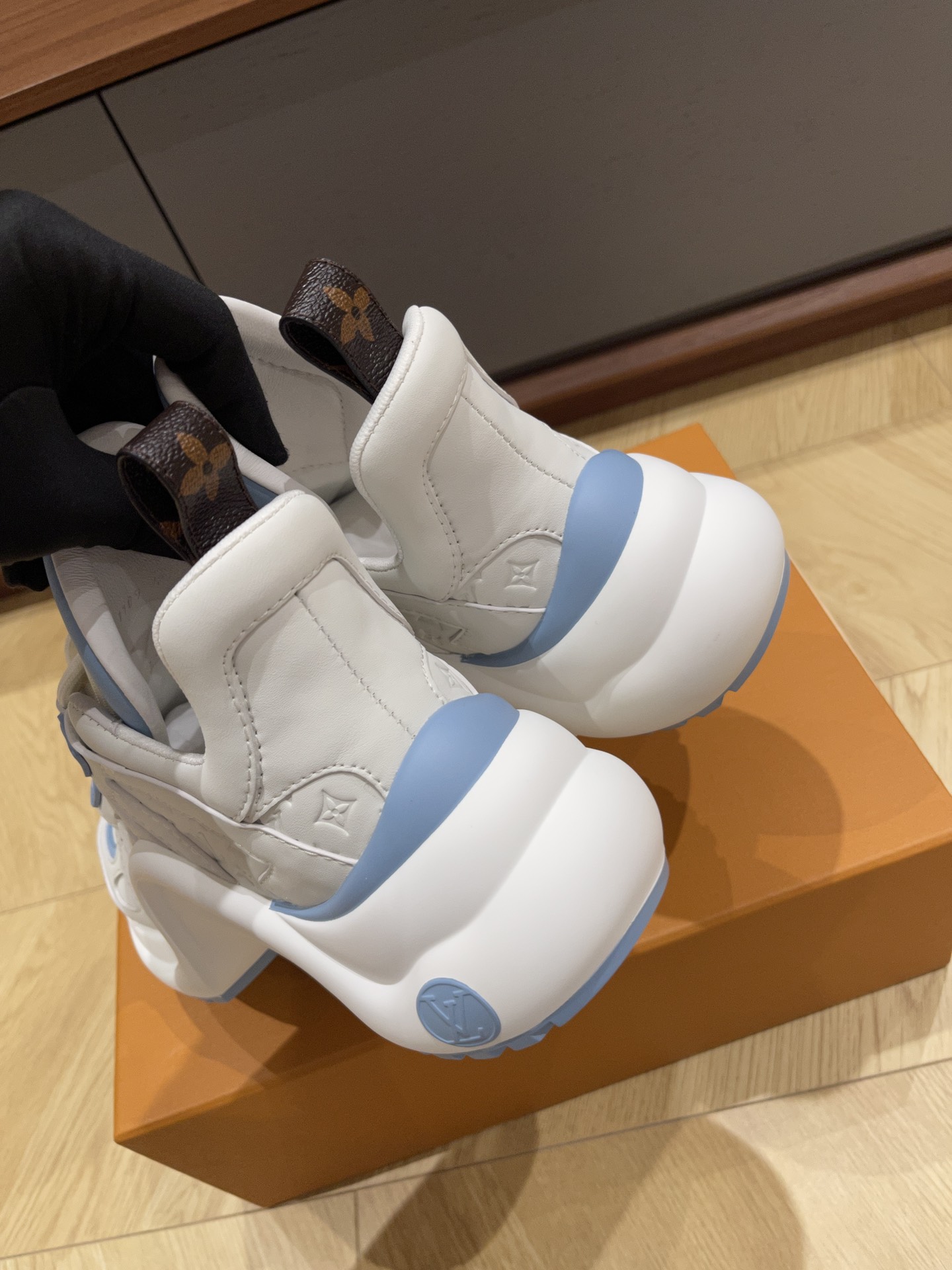 这款鞋子是AAAAA 1:1 质量 (非常棒). 使用了和原版一模一样的材料. 商标部分也保持了和路易威登/Louis Vuitton一样. 图片拍摄是实物鞋子拍摄, 您所收到的实物保证和我们图片一模一样.