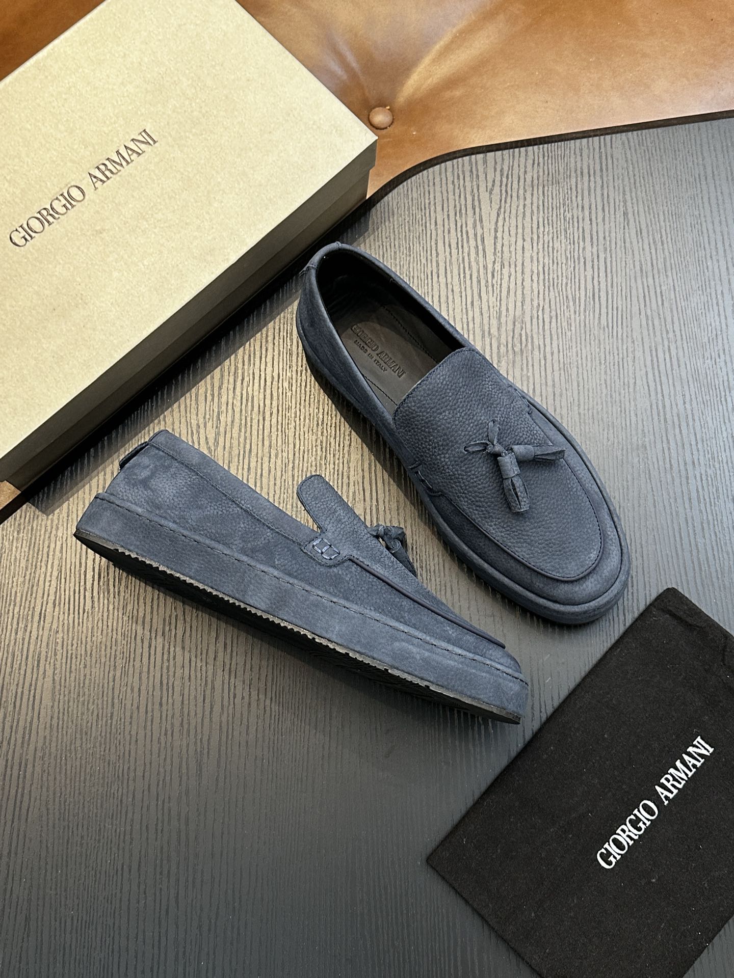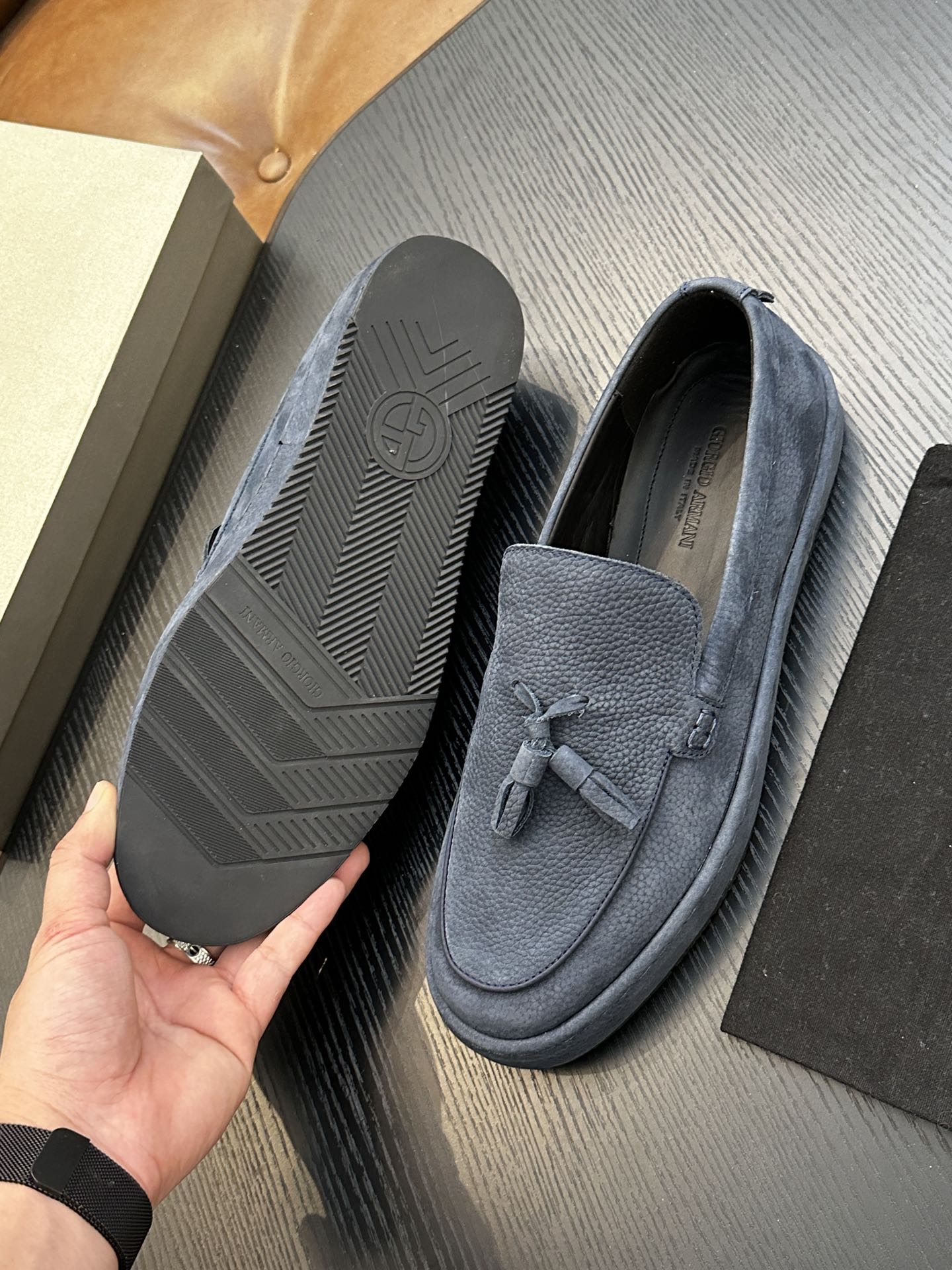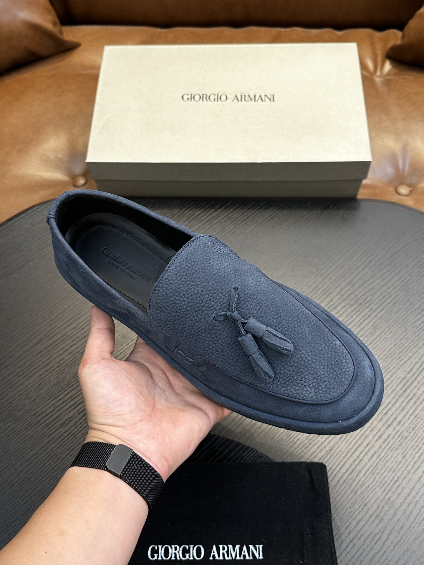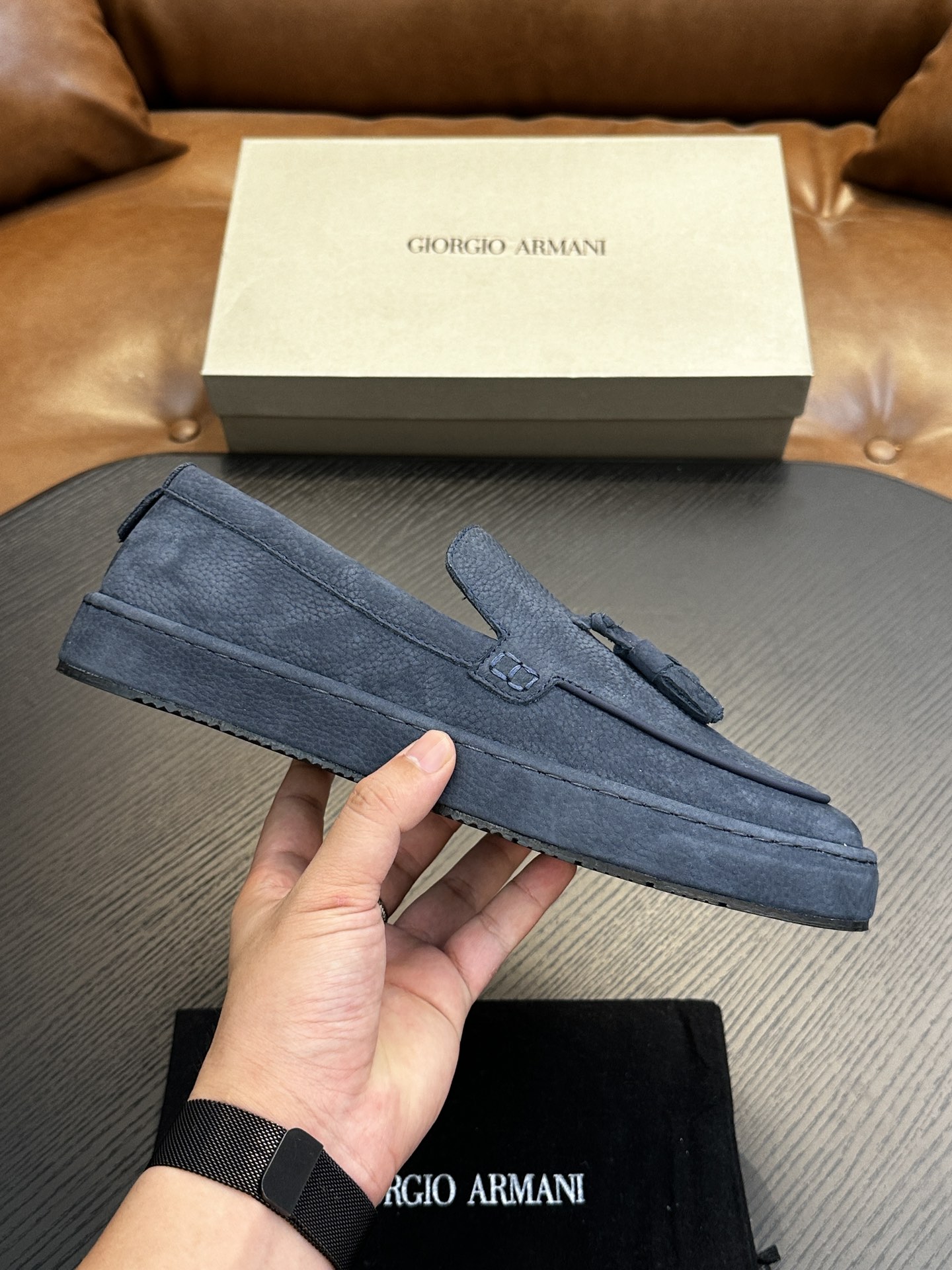 这款鞋子是AAAAA 1:1 质量 (非常棒). 使用了和原版一模一样的材料. 商标部分也保持了和阿玛尼/Armani一样. 图片拍摄是实物鞋子拍摄, 您所收到的实物保证和我们图片一模一样.