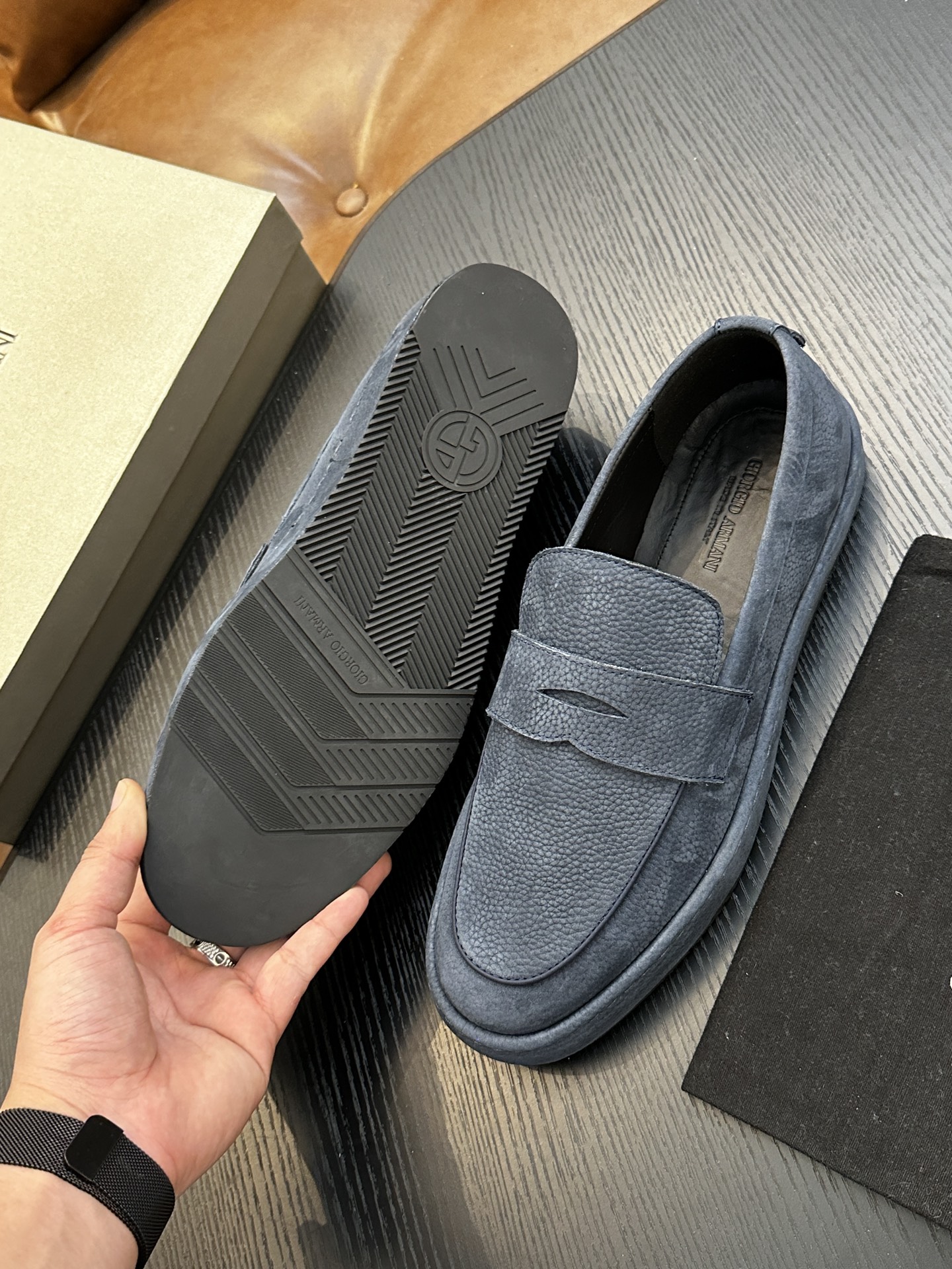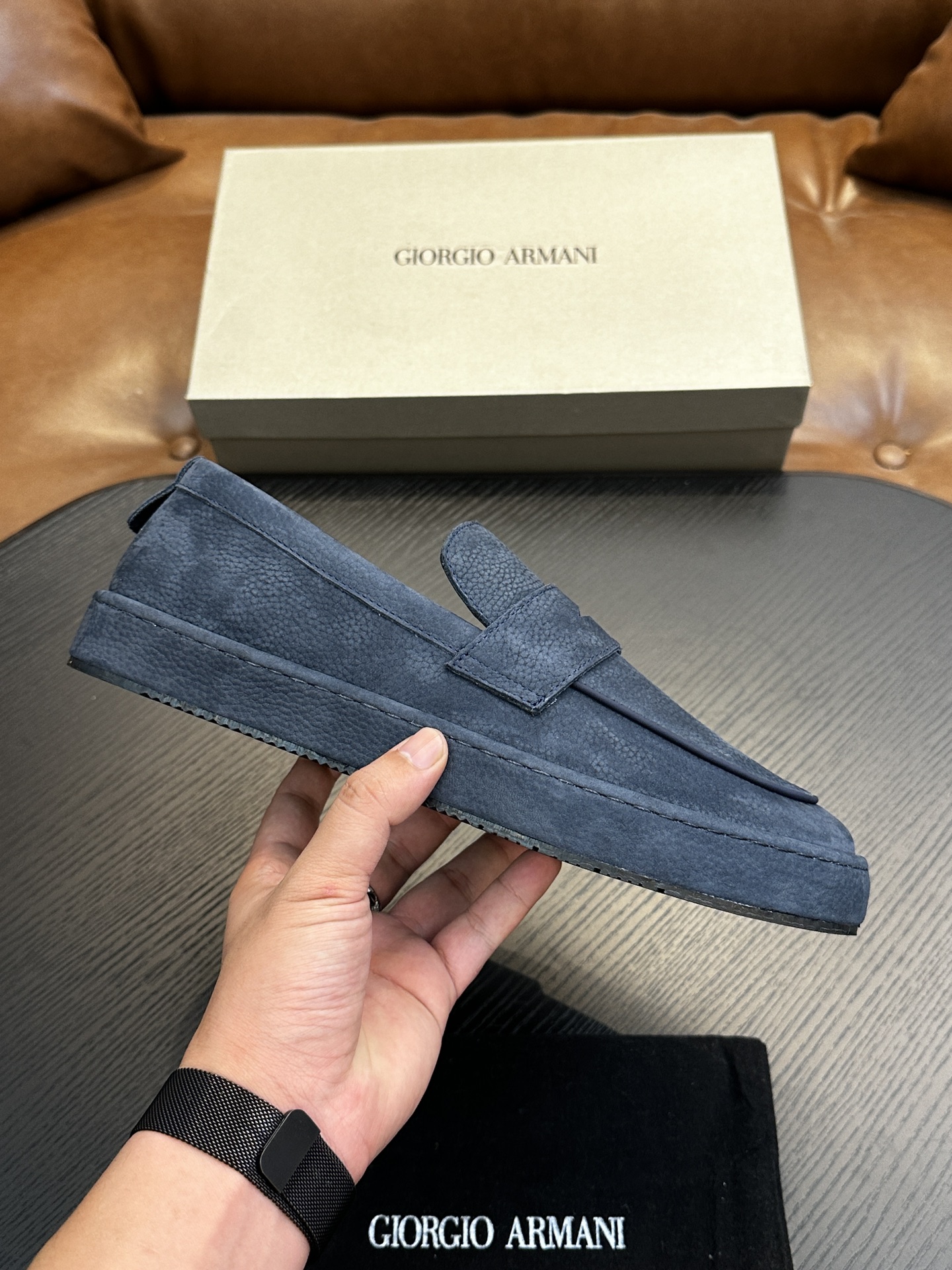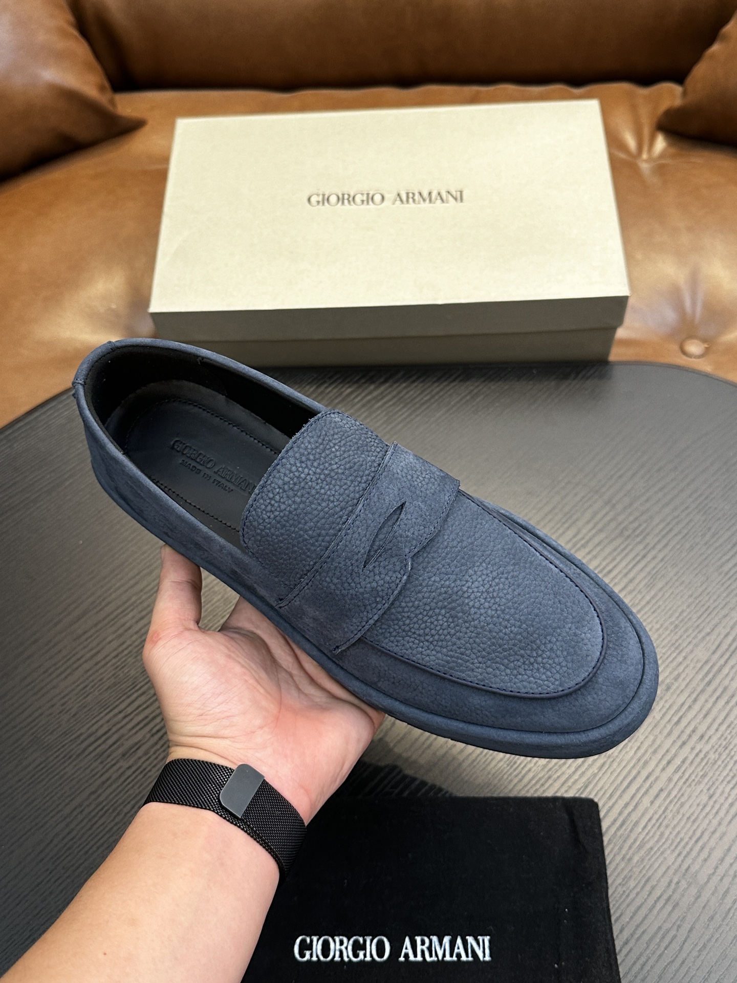 这款鞋子是AAAAA 1:1 质量 (非常棒). 使用了和原版一模一样的材料. 商标部分也保持了和阿玛尼/Armani一样. 图片拍摄是实物鞋子拍摄, 您所收到的实物保证和我们图片一模一样.