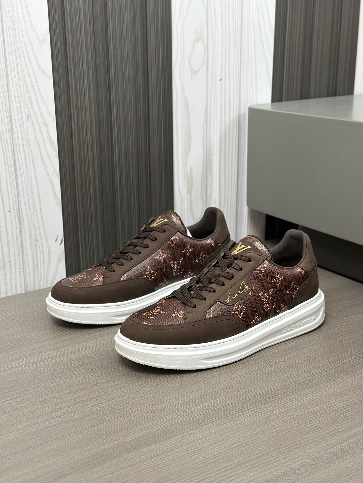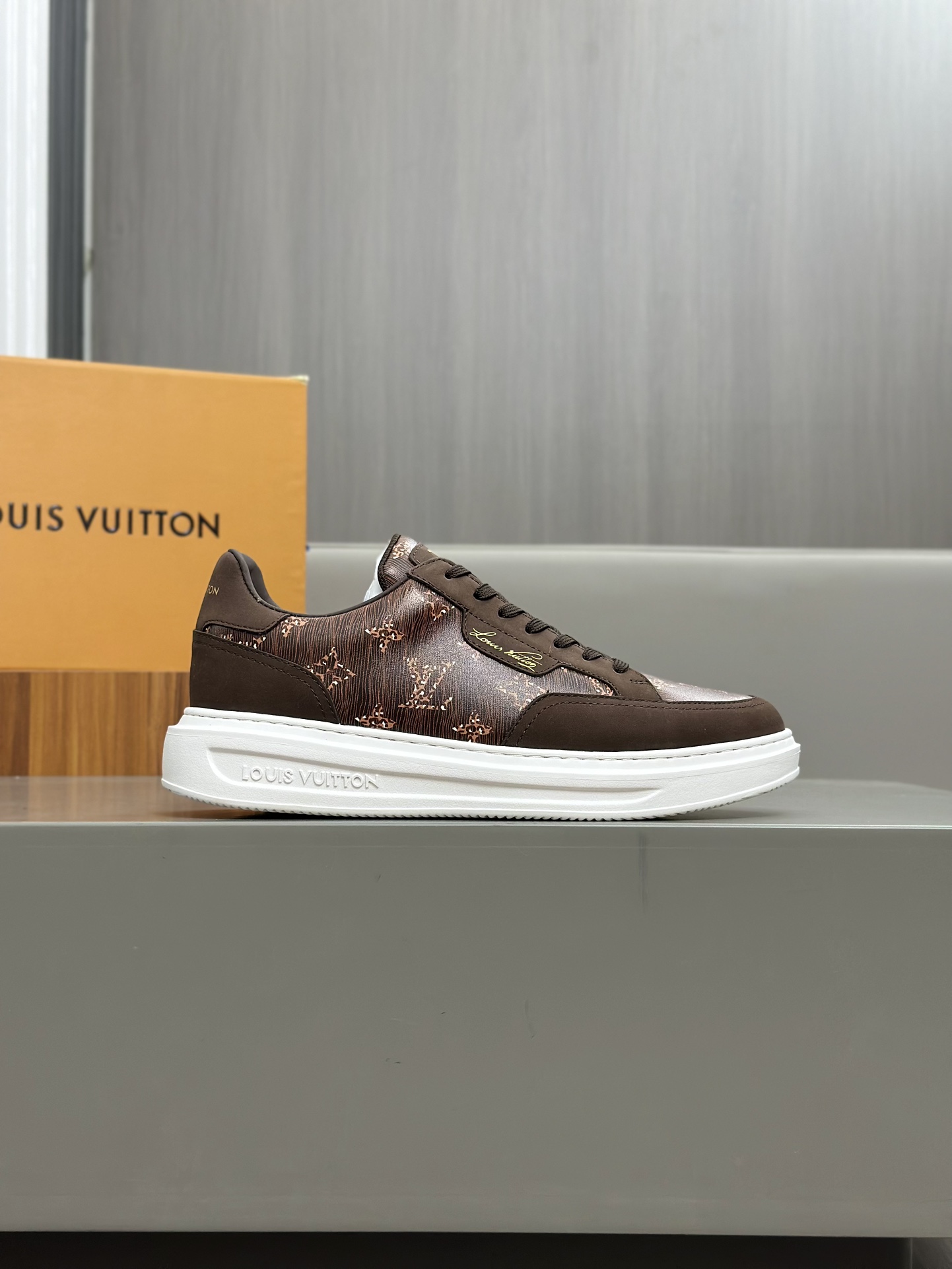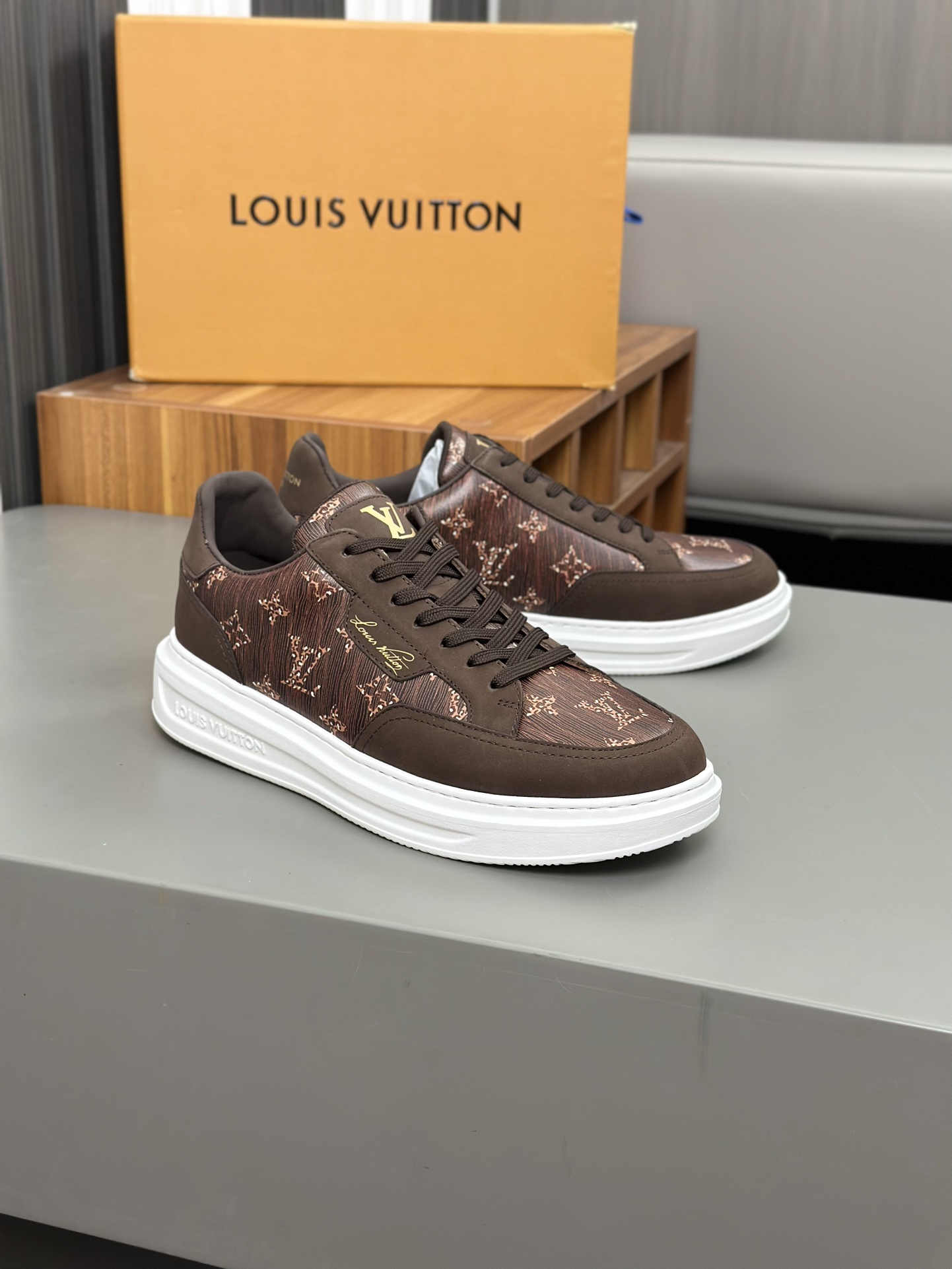 这款鞋子是AAAAA 1:1 质量 (非常棒). 使用了和原版一模一样的材料. 商标部分也保持了和路易威登/Louis Vuitton一样. 图片拍摄是实物鞋子拍摄, 您所收到的实物保证和我们图片一模一样.