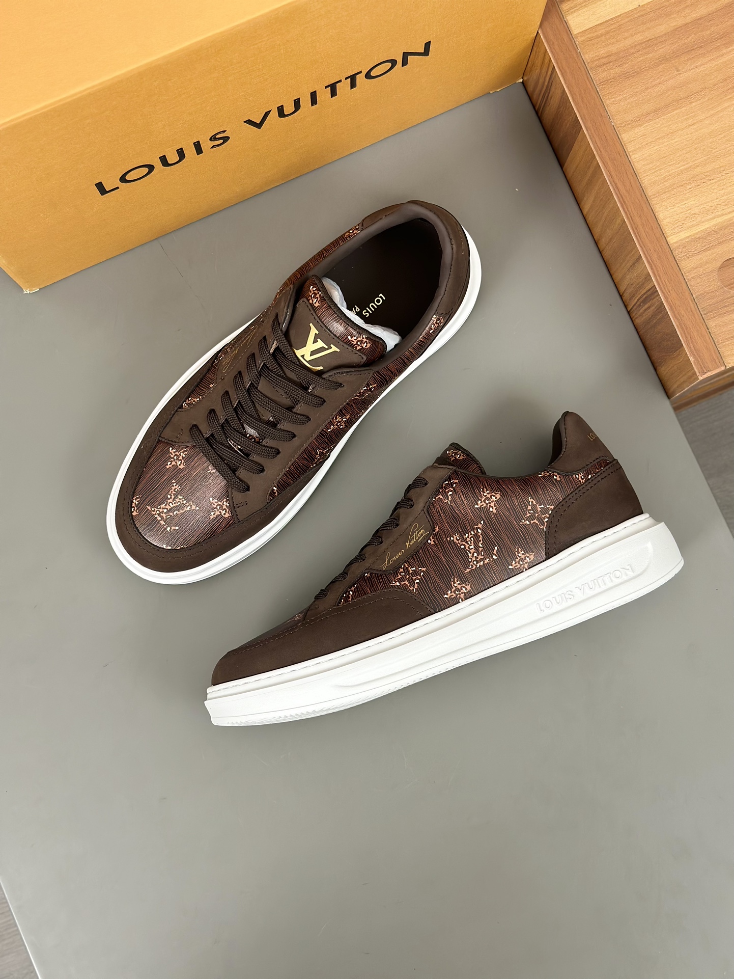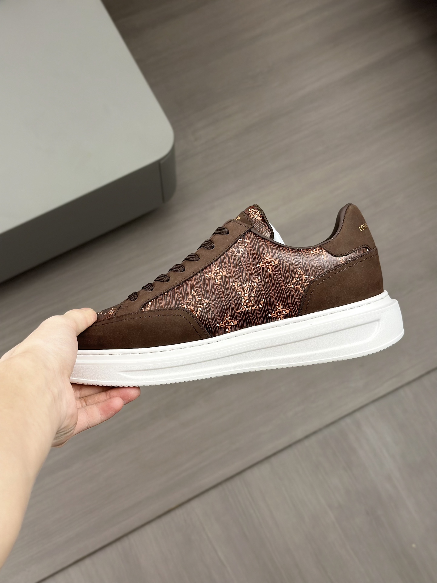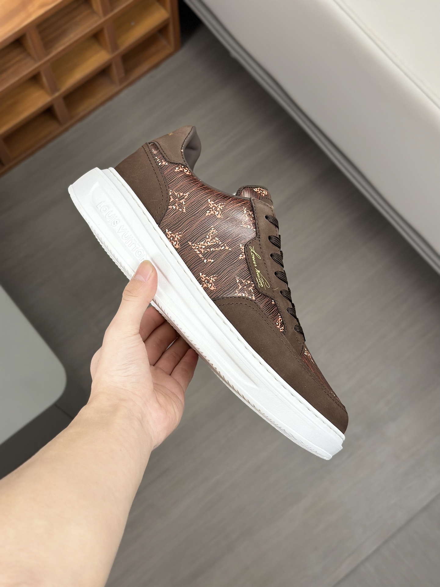 这款鞋子是AAAAA 1:1 质量 (非常棒). 使用了和原版一模一样的材料. 商标部分也保持了和路易威登/Louis Vuitton一样. 图片拍摄是实物鞋子拍摄, 您所收到的实物保证和我们图片一模一样.