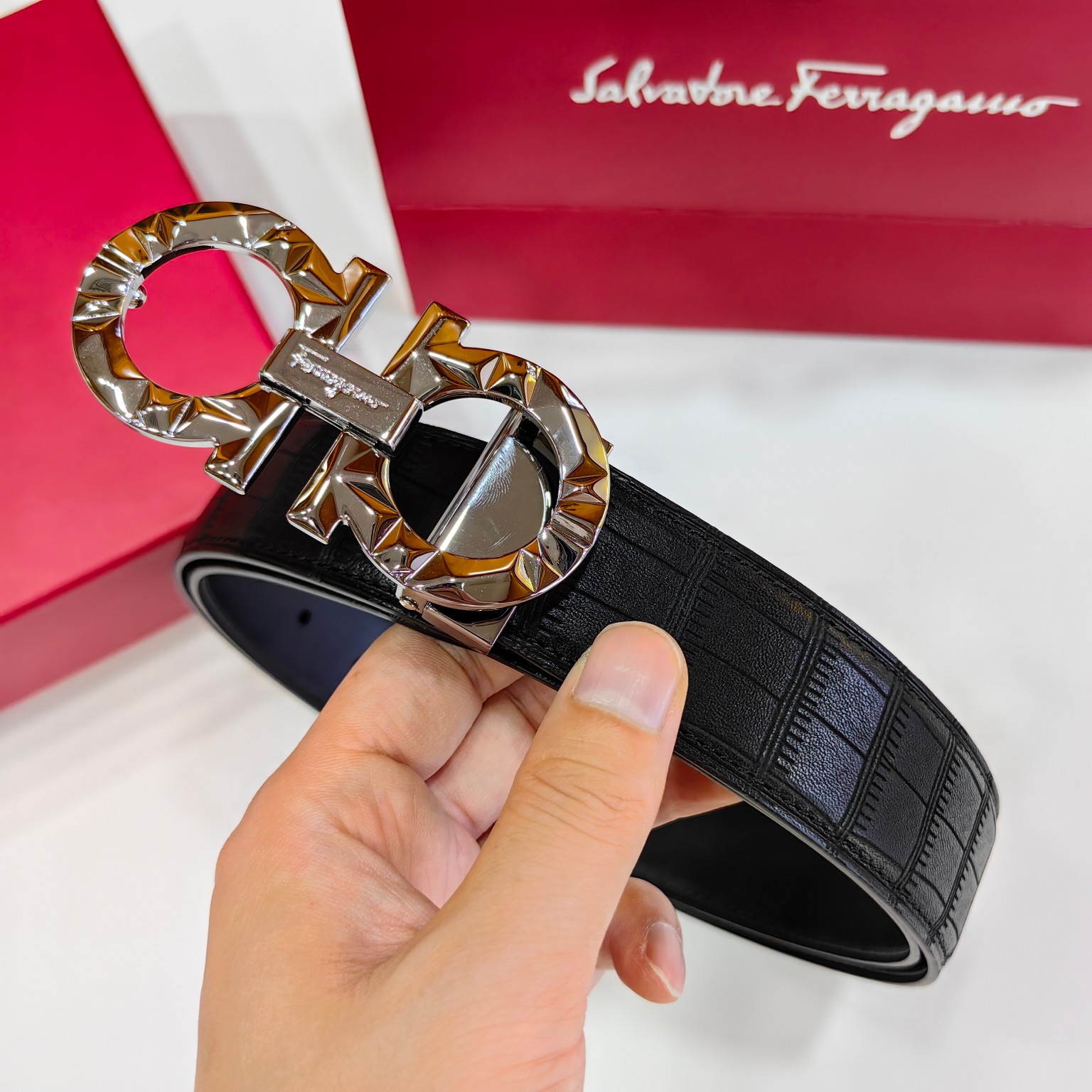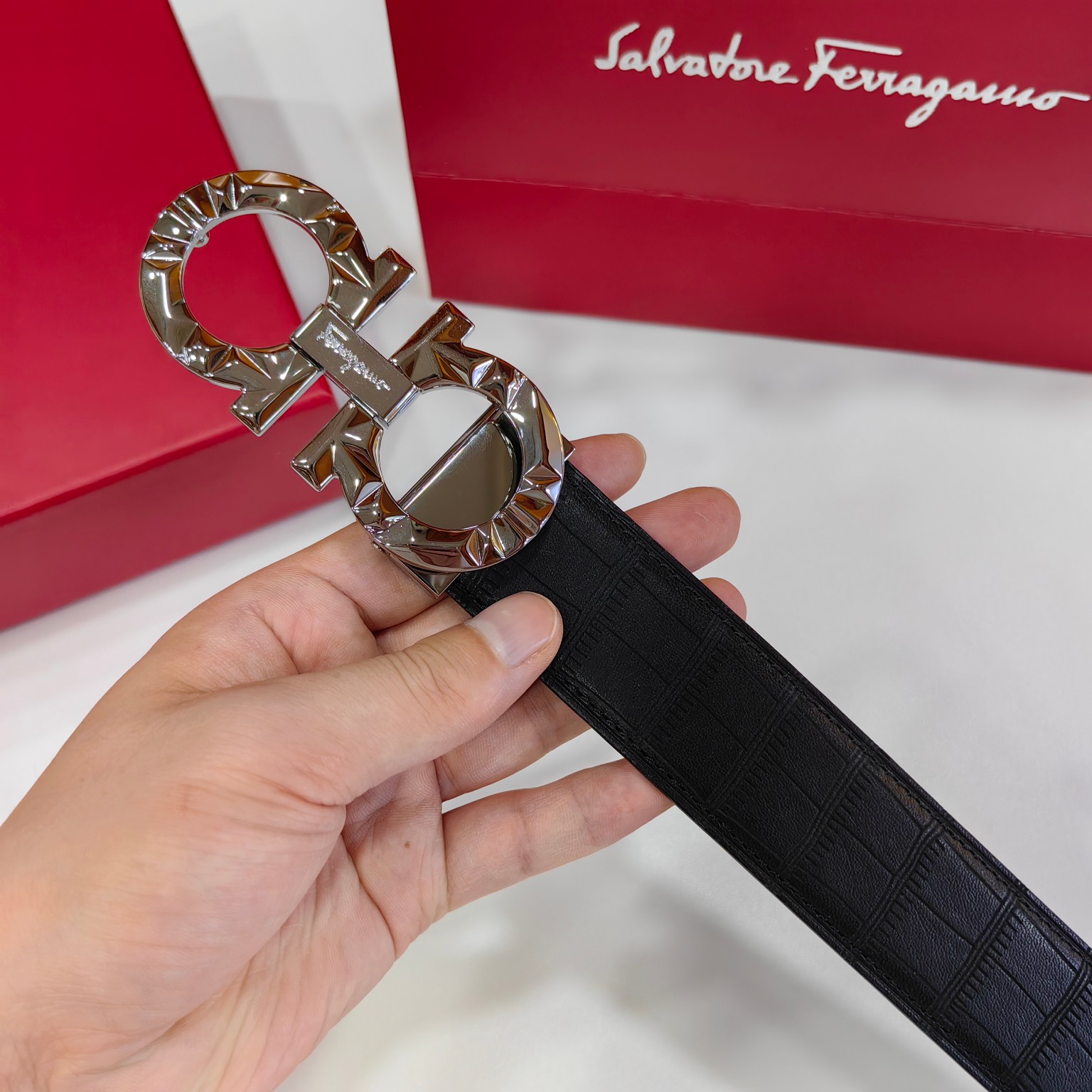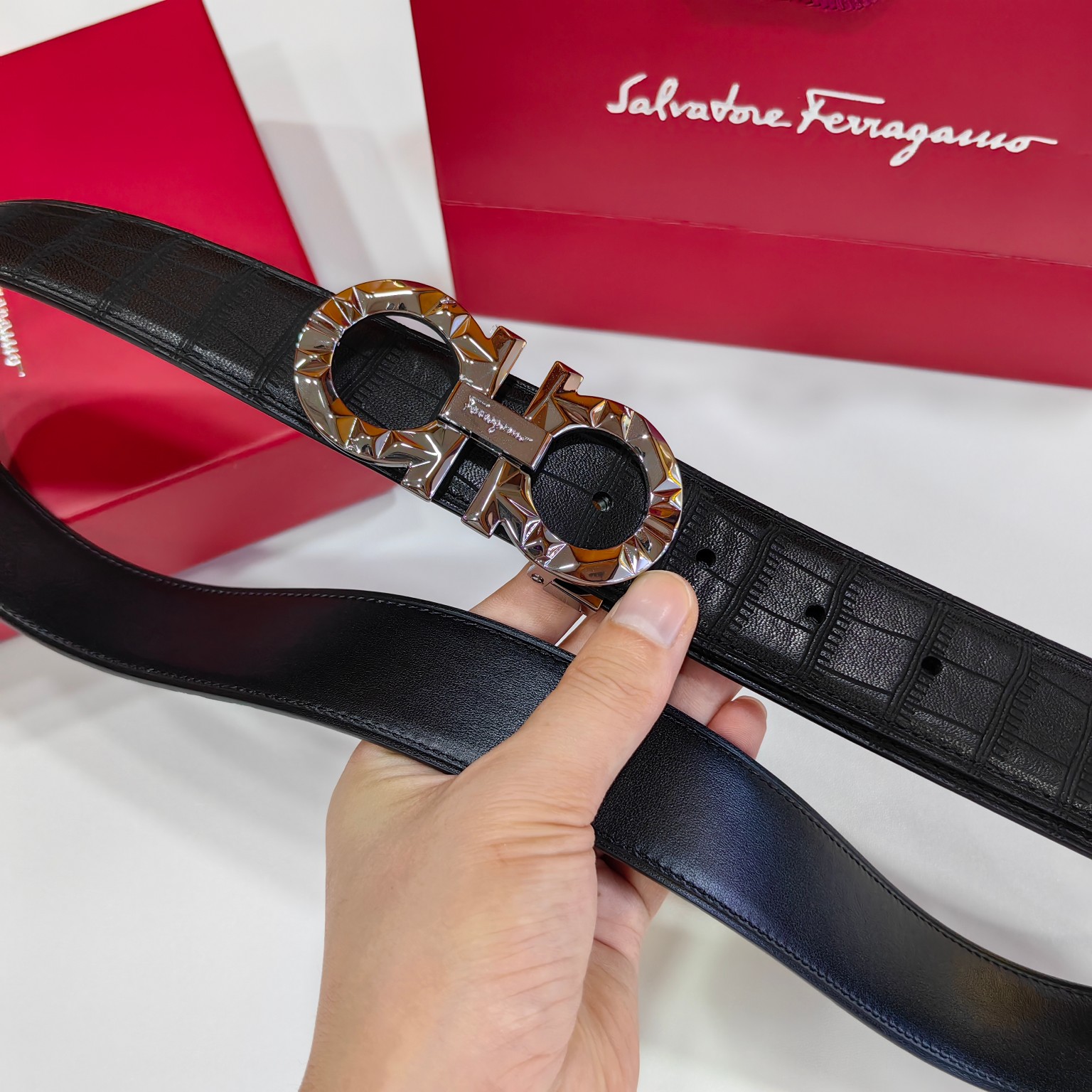 这款皮带是AAAAA 1:1 质量 (非常棒). 使用了和原版一模一样的材料. 商标部分也保持了和菲拉格慕/Salvatore Ferragamo一样. 图片拍摄是实物皮带拍摄, 您所收到的实物保证和我们图片一模一样.