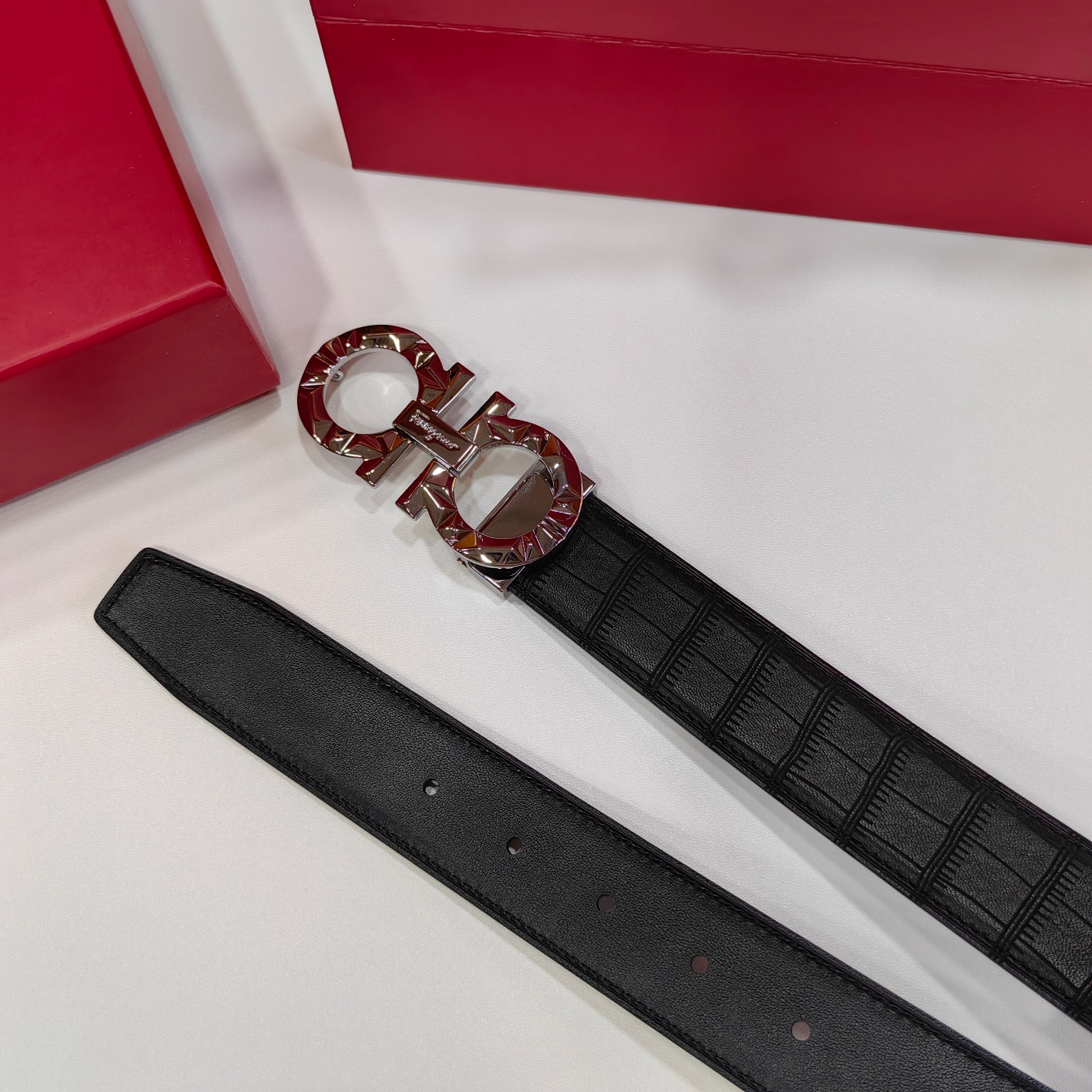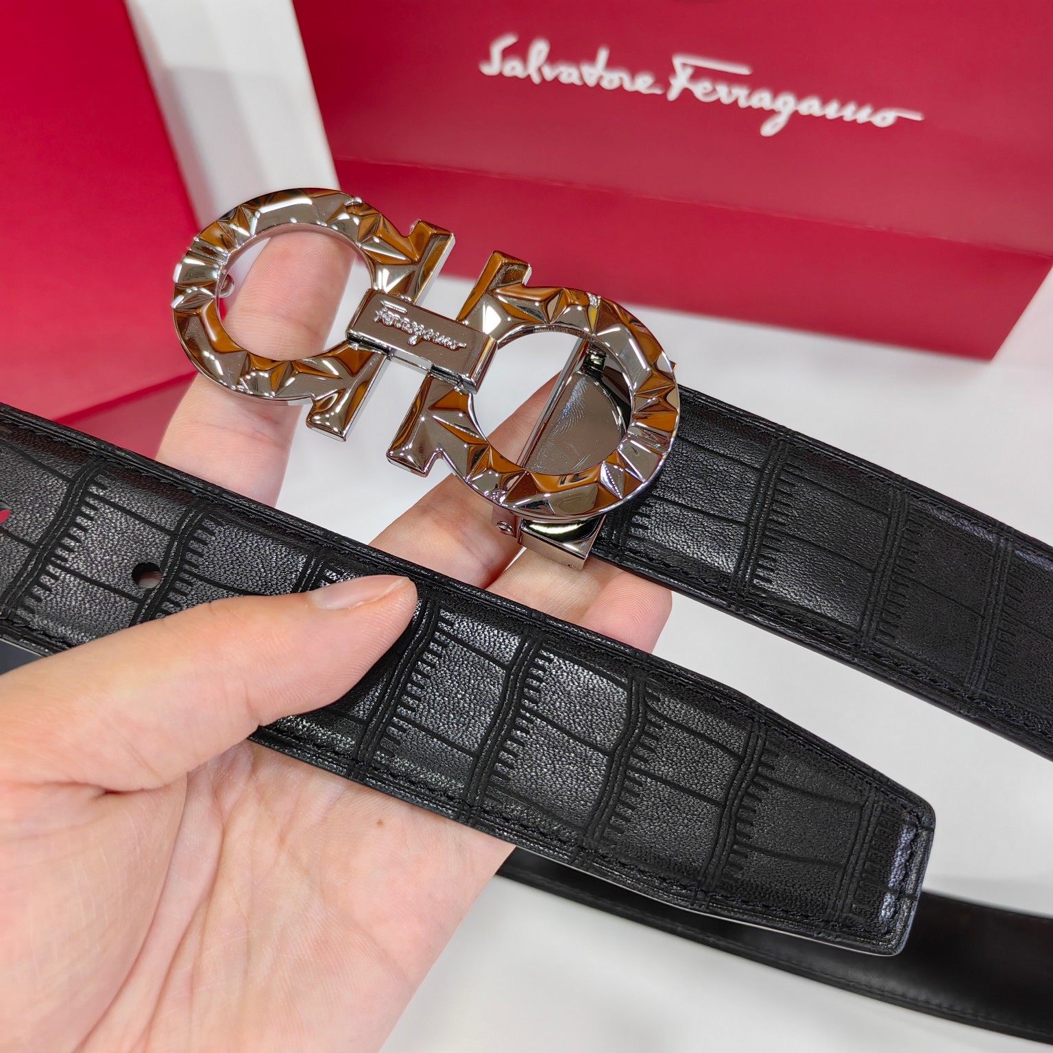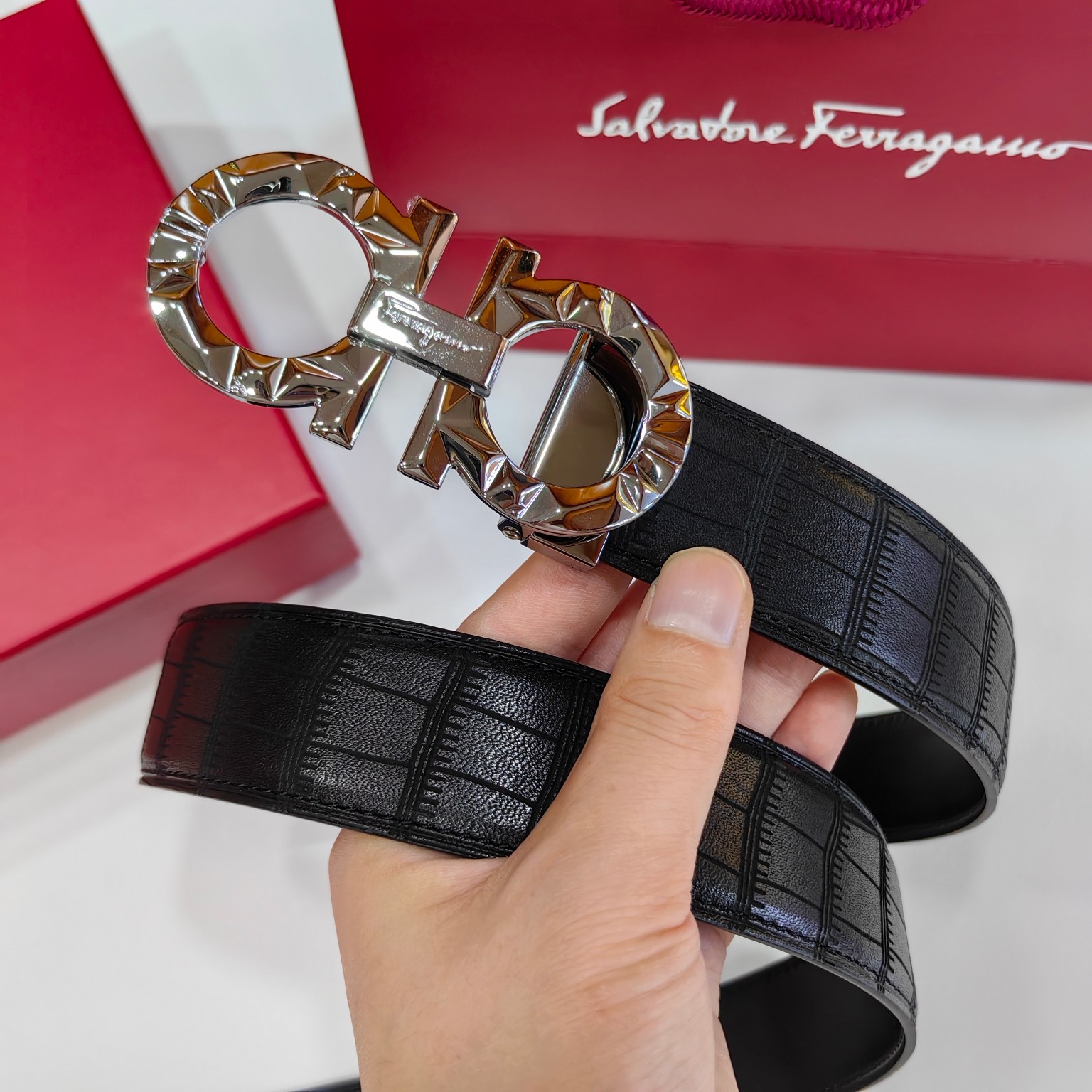 这款皮带是AAAAA 1:1 质量 (非常棒). 使用了和原版一模一样的材料. 商标部分也保持了和菲拉格慕/Salvatore Ferragamo一样. 图片拍摄是实物皮带拍摄, 您所收到的实物保证和我们图片一模一样.