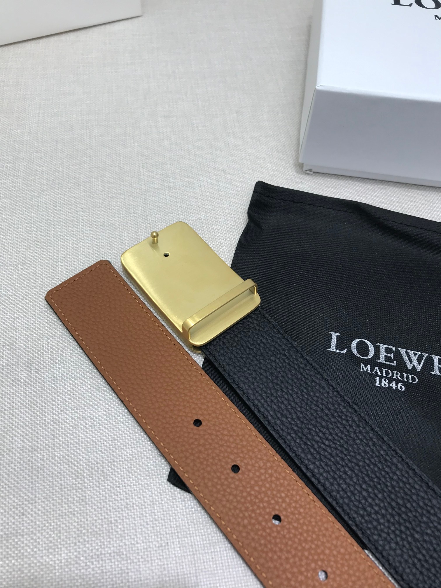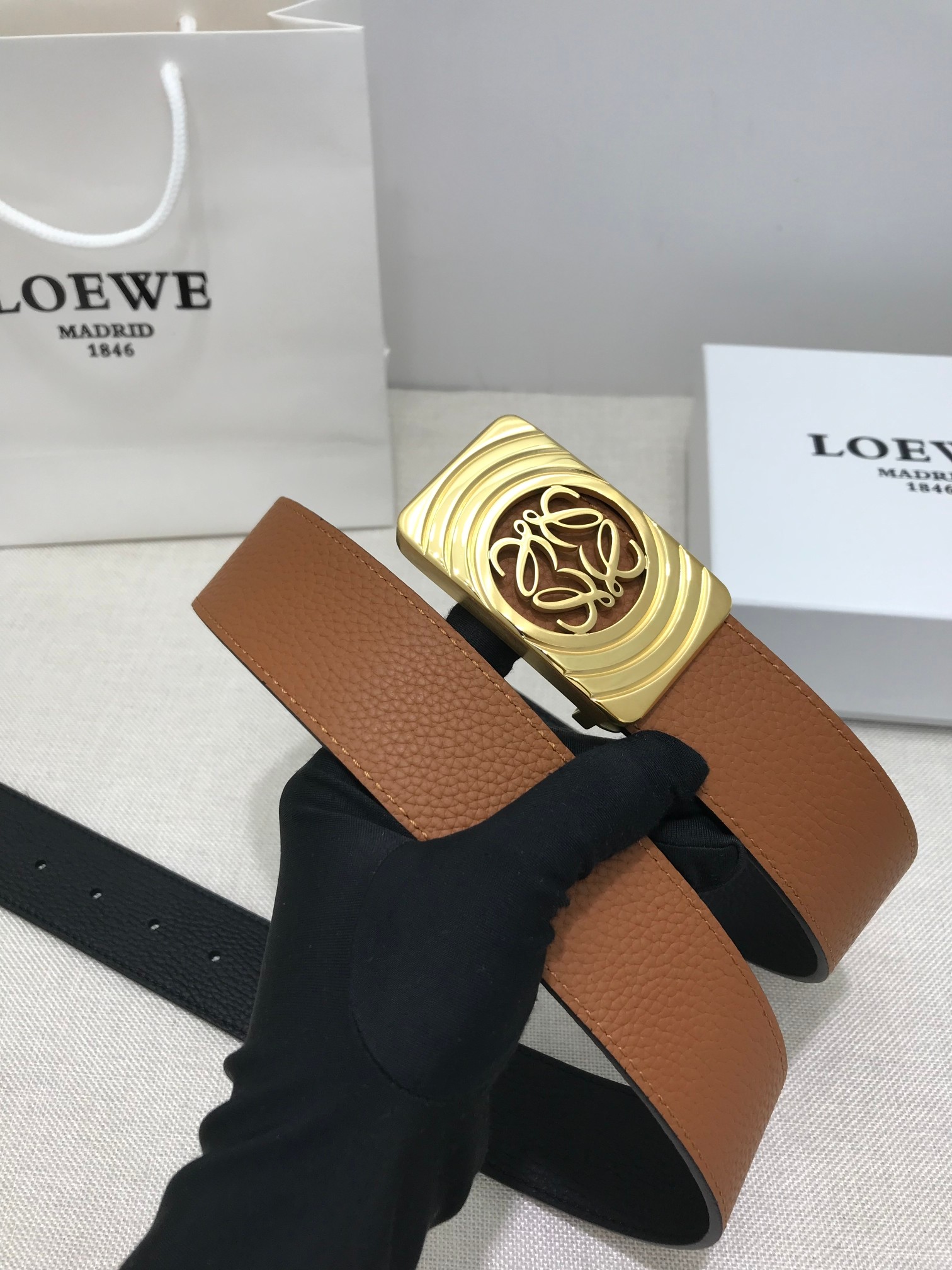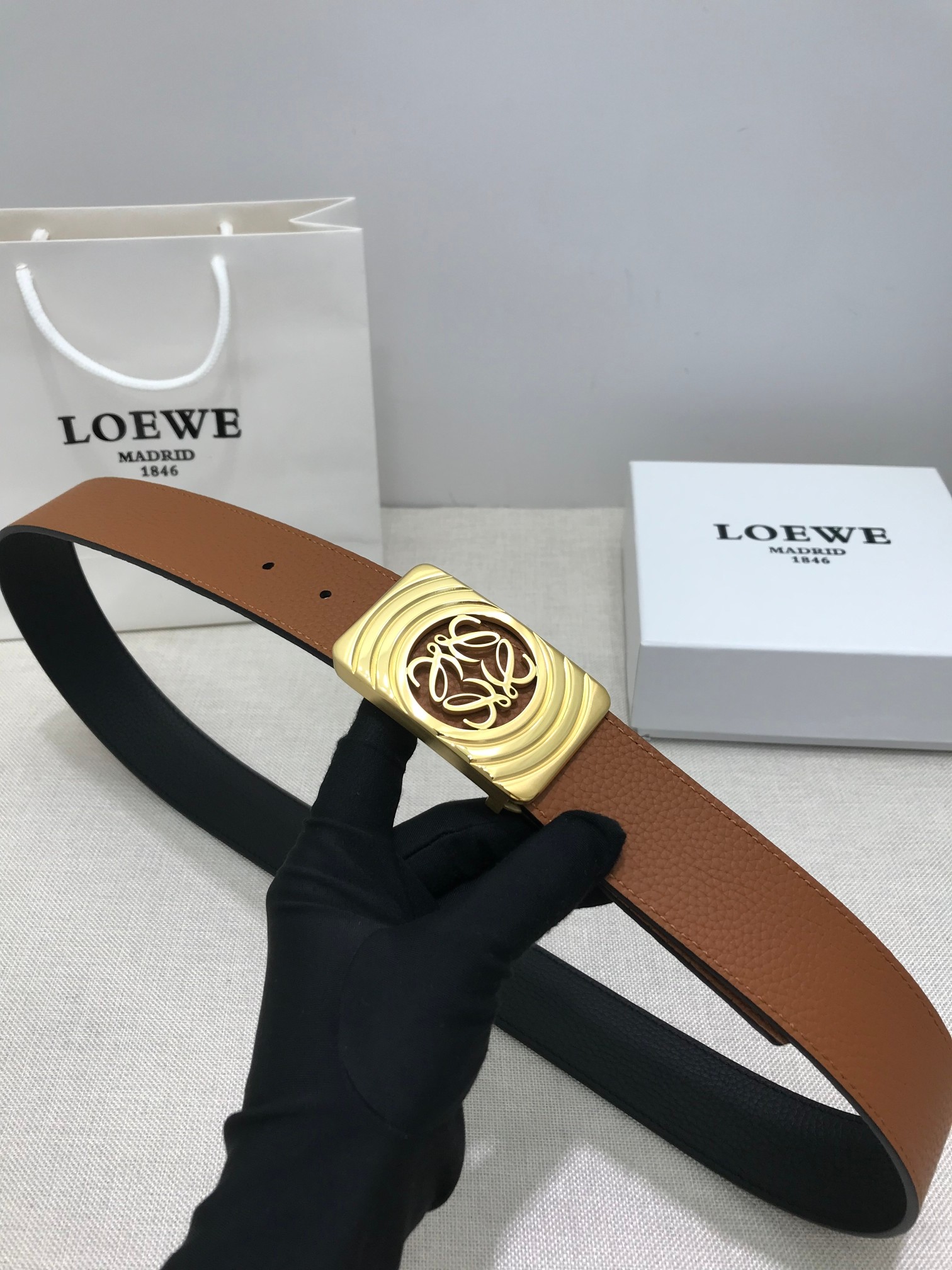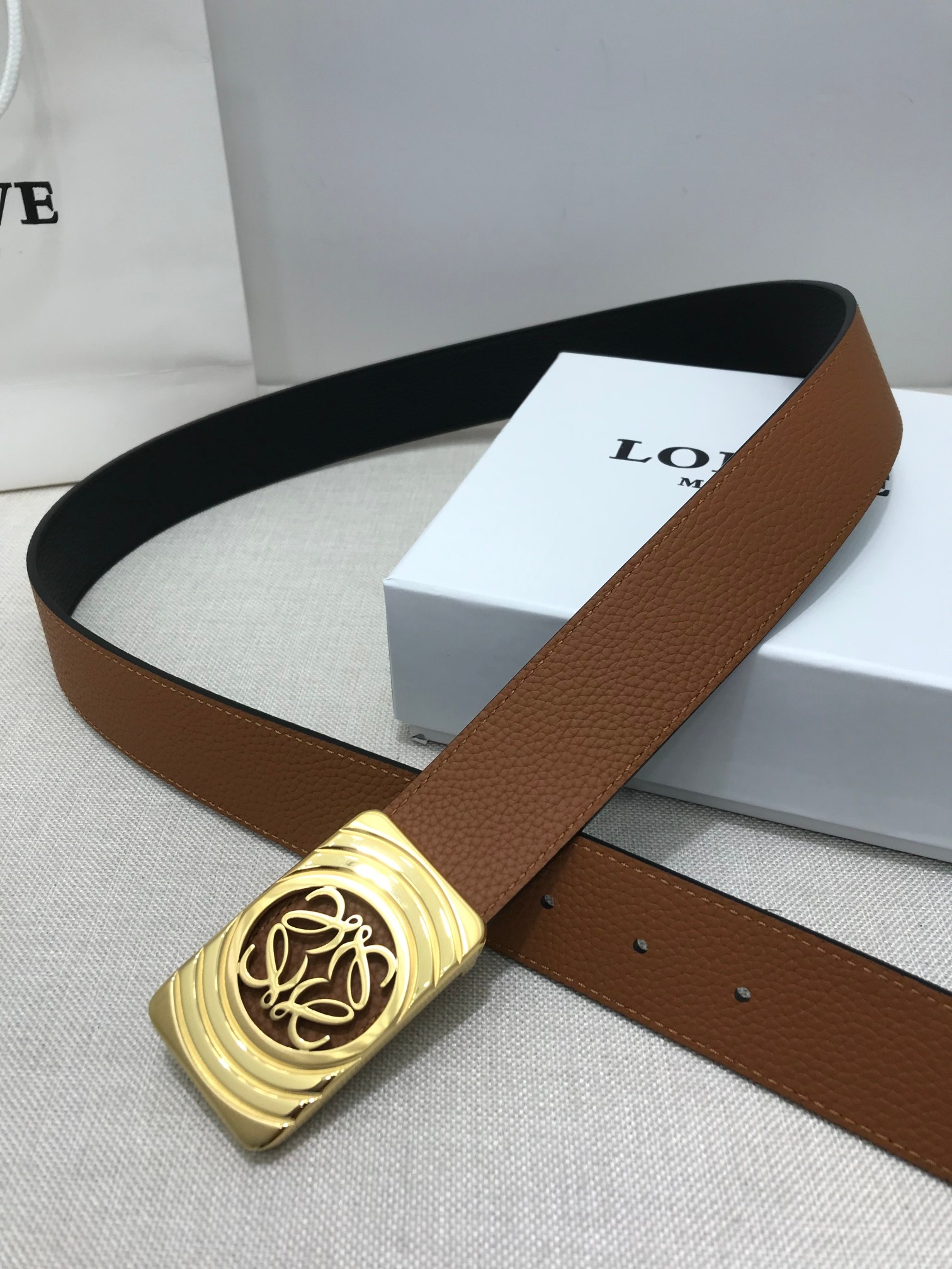 这款皮带是AAAAA 1:1 质量 (非常棒). 使用了和原版一模一样的材料. 商标部分也保持了和罗意威/Loewe一样. 图片拍摄是实物皮带拍摄, 您所收到的实物保证和我们图片一模一样.