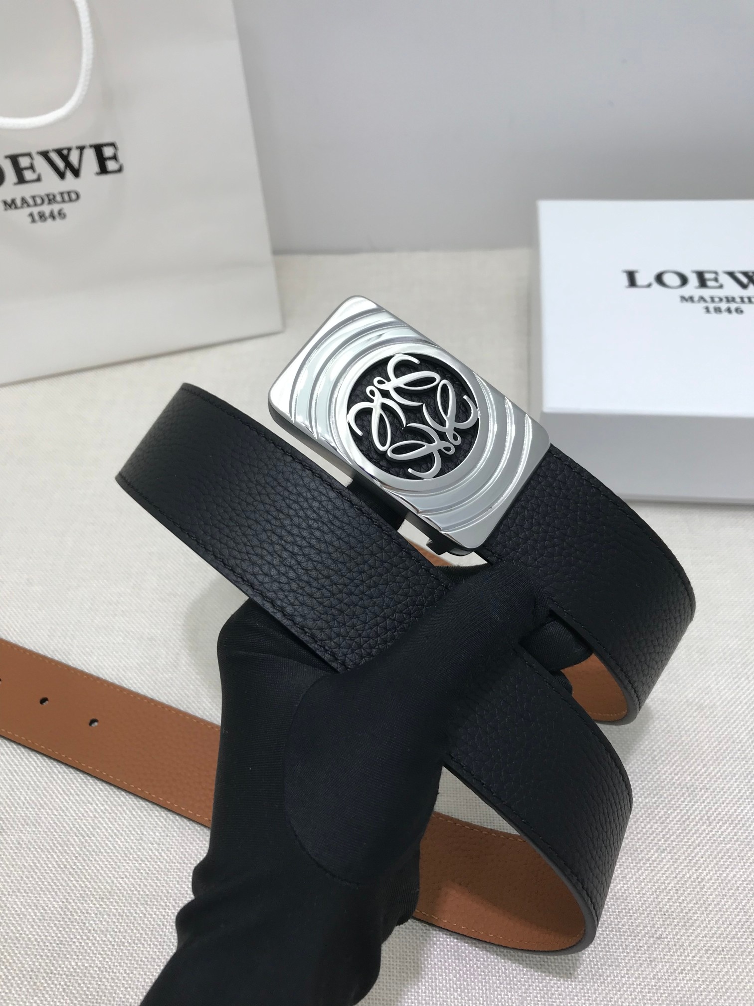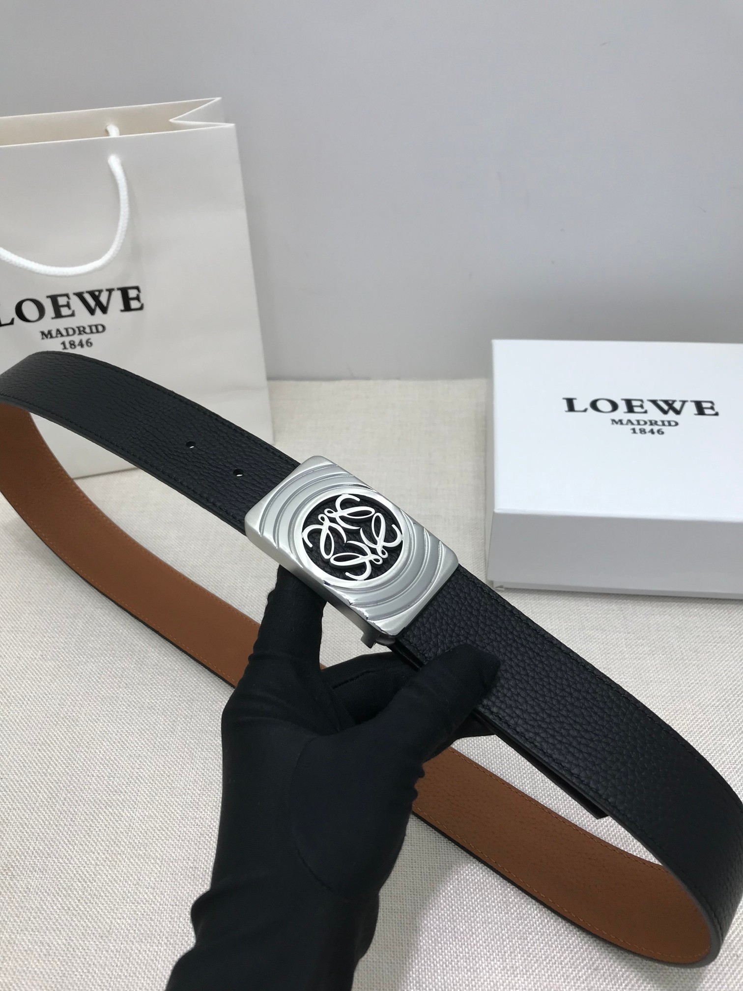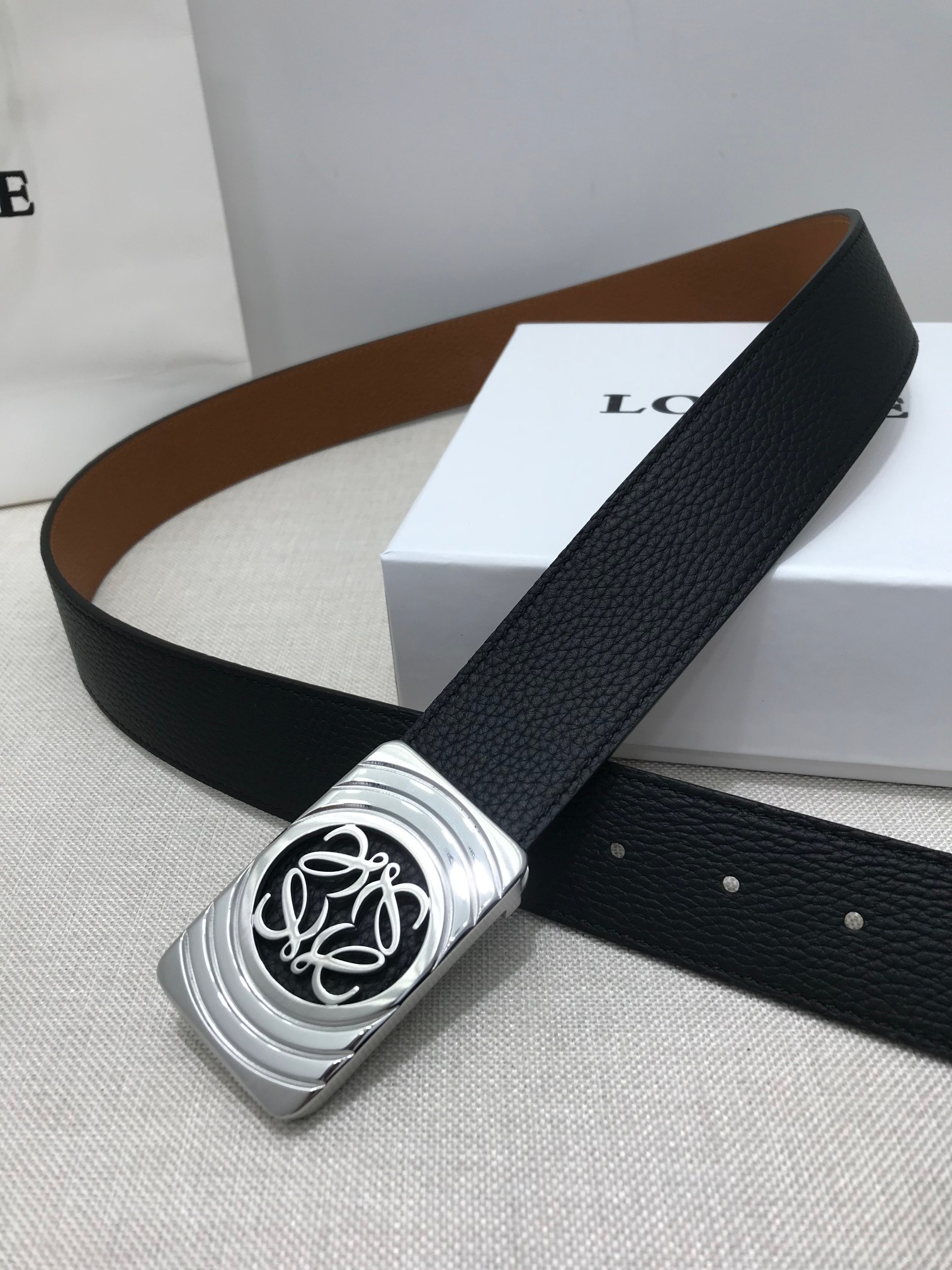 这款皮带是AAAAA 1:1 质量 (非常棒). 使用了和原版一模一样的材料. 商标部分也保持了和罗意威/Loewe一样. 图片拍摄是实物皮带拍摄, 您所收到的实物保证和我们图片一模一样.