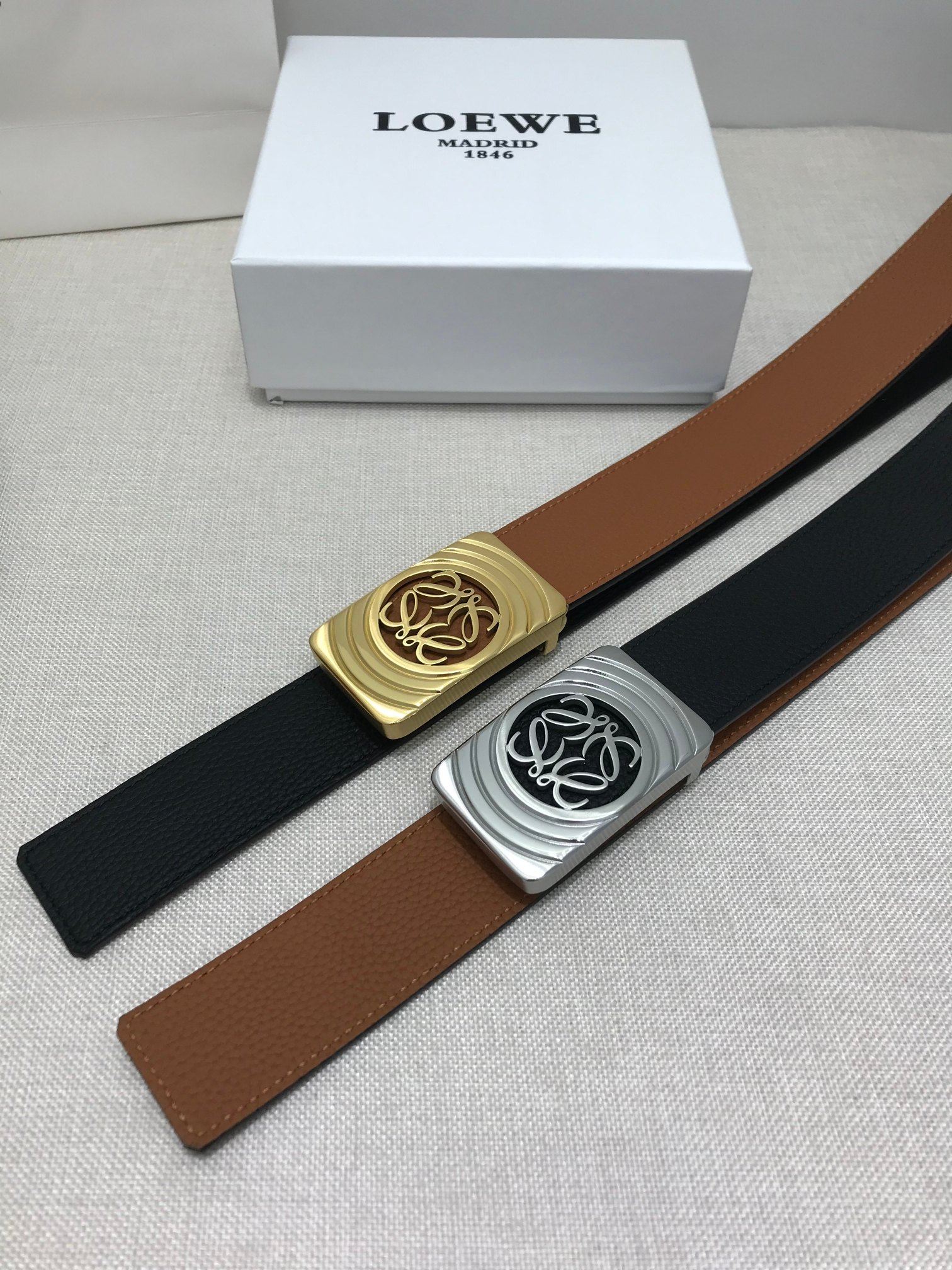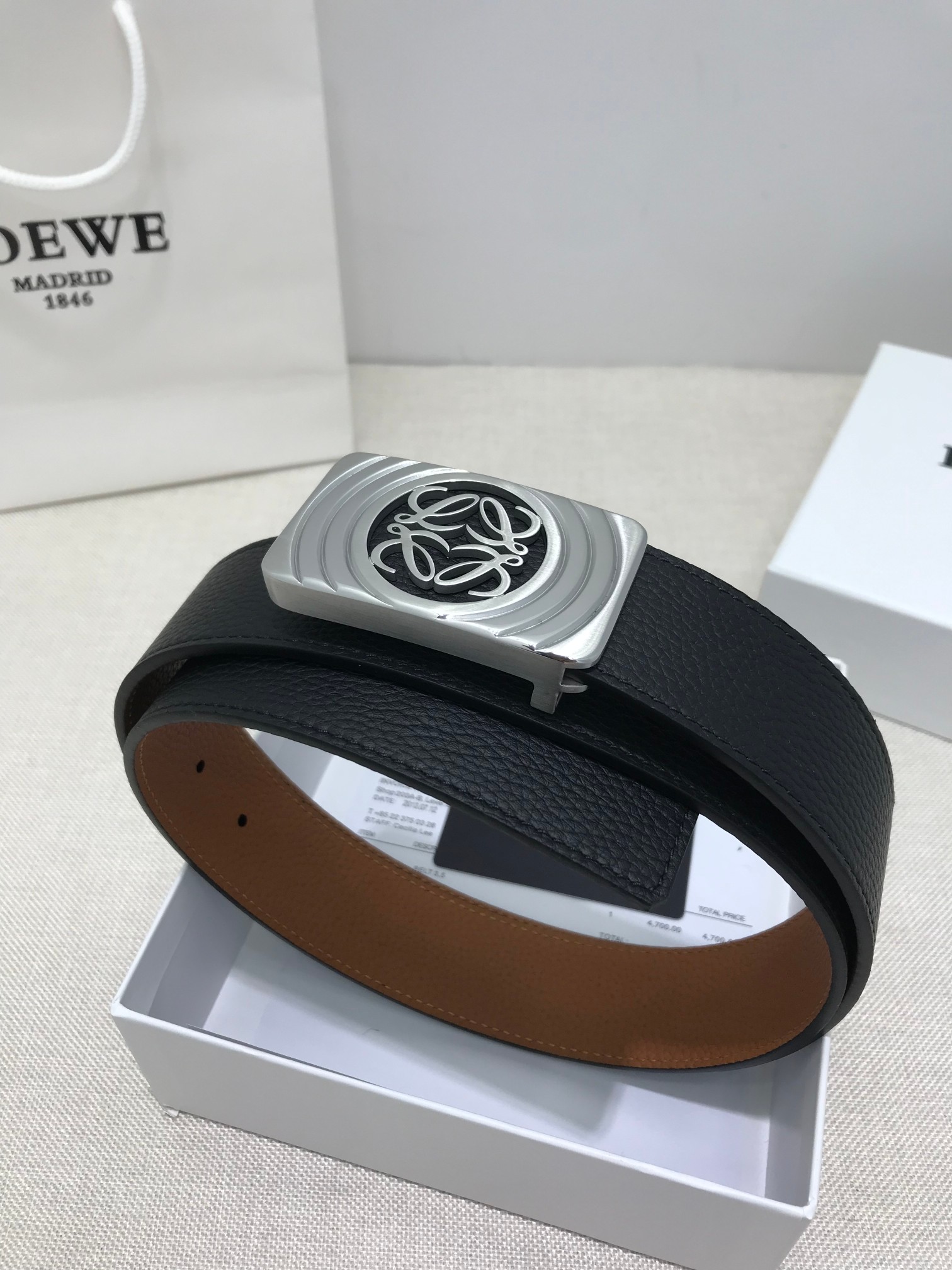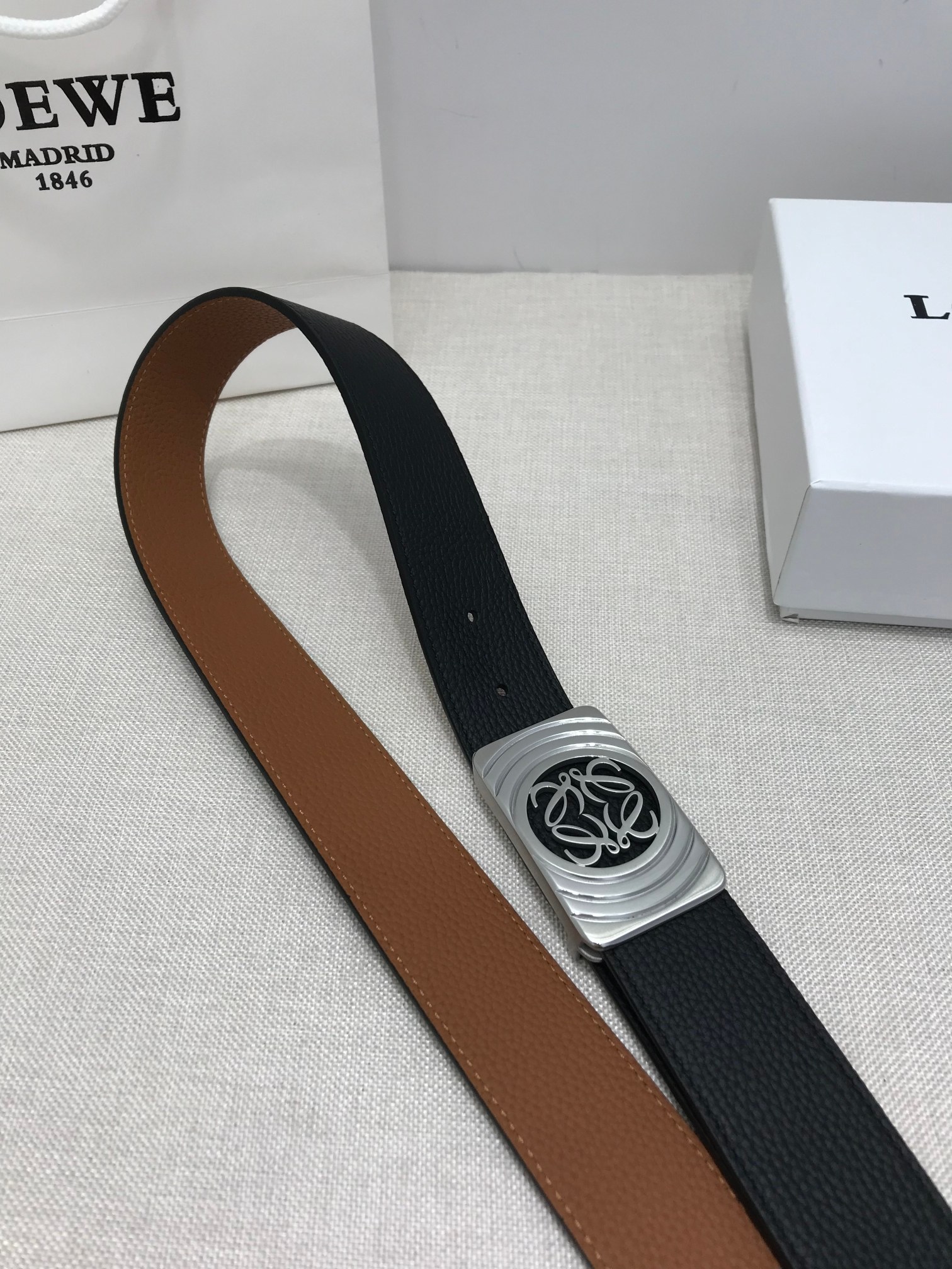 这款皮带是AAAAA 1:1 质量 (非常棒). 使用了和原版一模一样的材料. 商标部分也保持了和罗意威/Loewe一样. 图片拍摄是实物皮带拍摄, 您所收到的实物保证和我们图片一模一样.