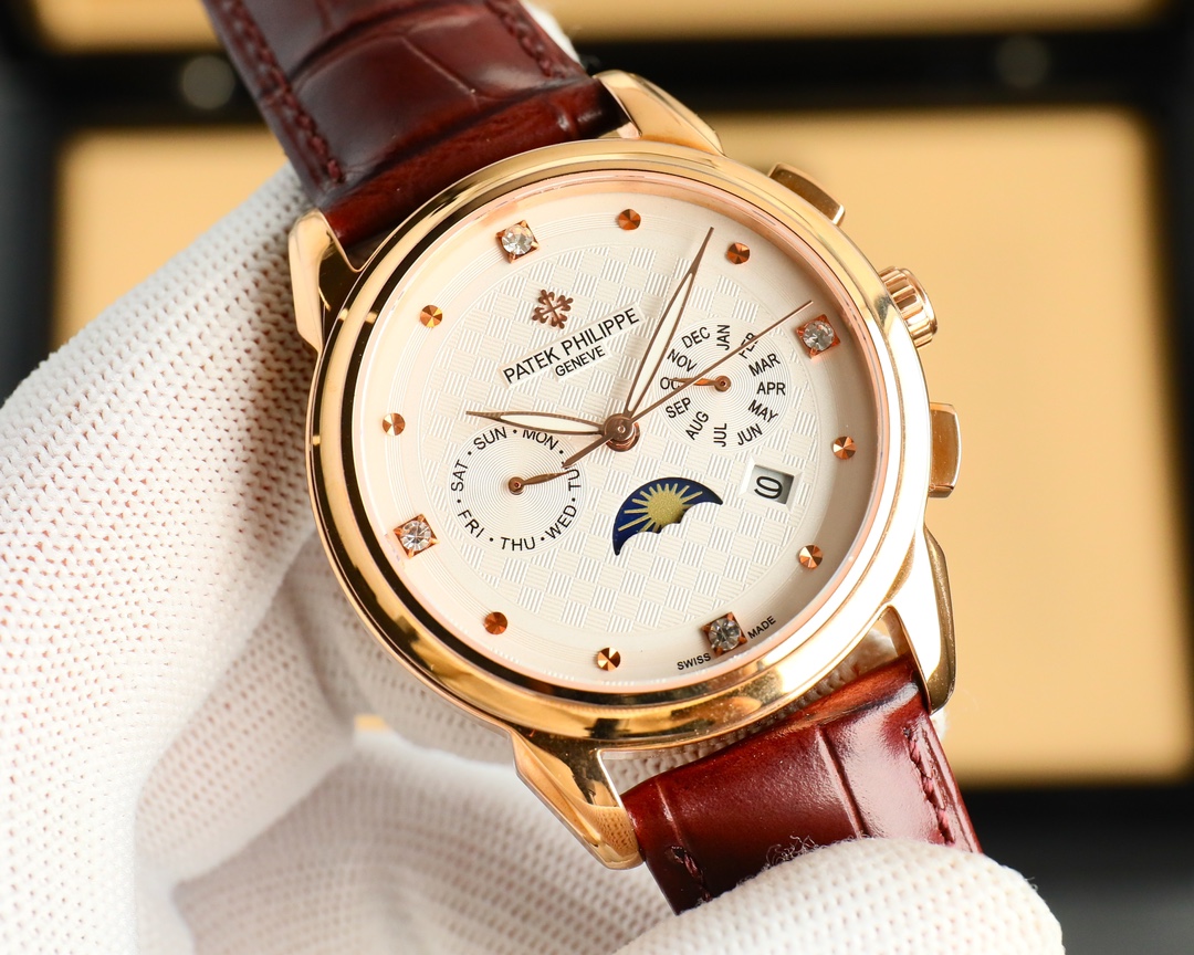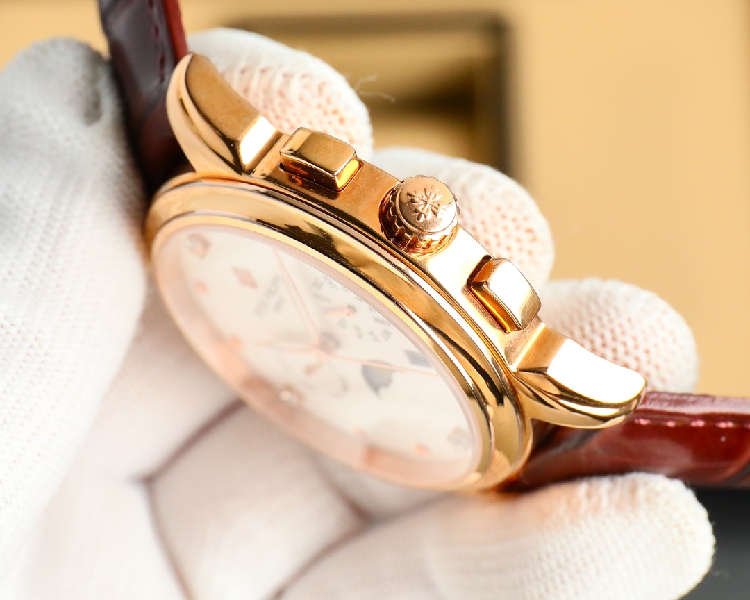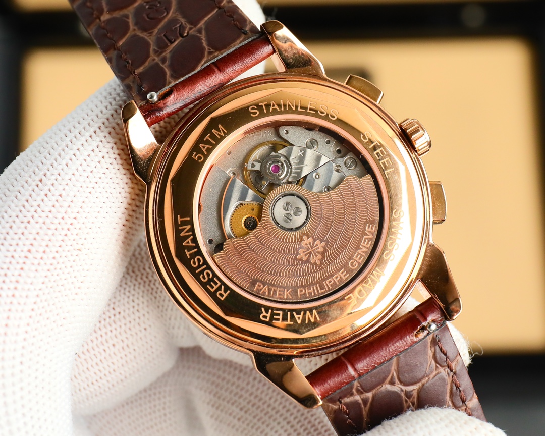 这款手表是AAAAA 1:1 质量 (非常棒). 使用了和原版一模一样的材料. 商标部分也保持了和百达翡丽/Patek Philippe一样. 图片拍摄是实物手表拍摄, 您所收到的实物保证和我们图片一模一样.