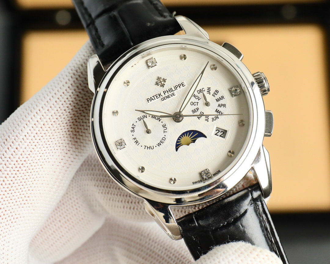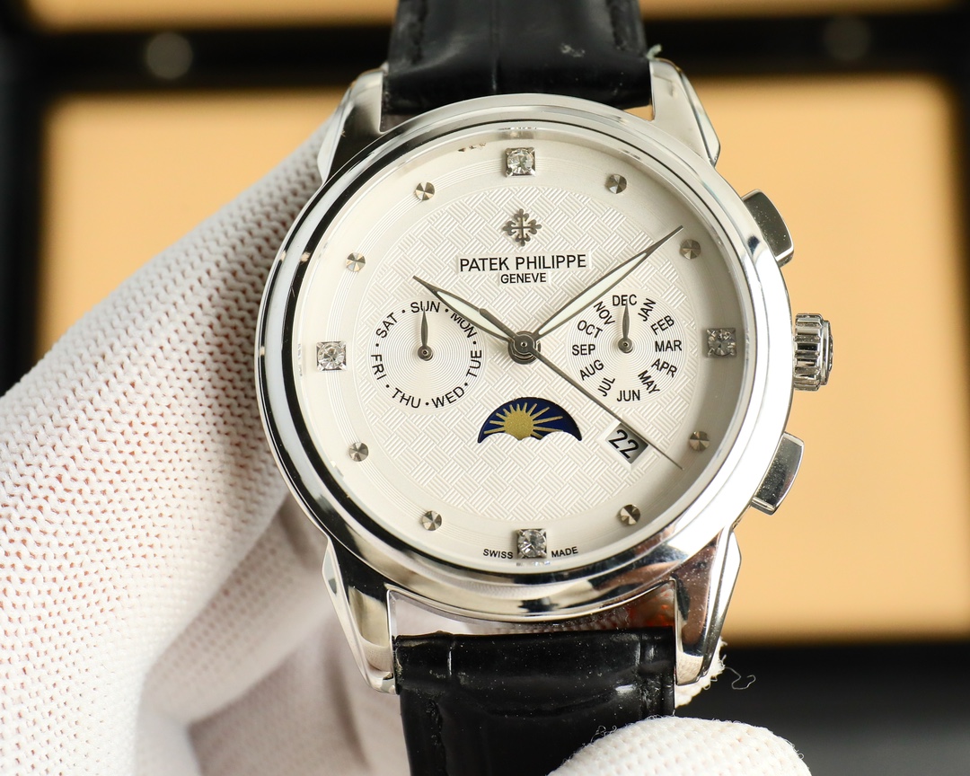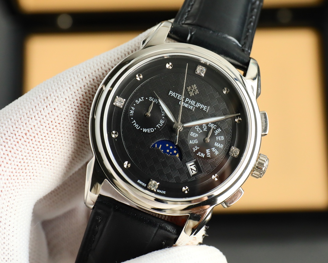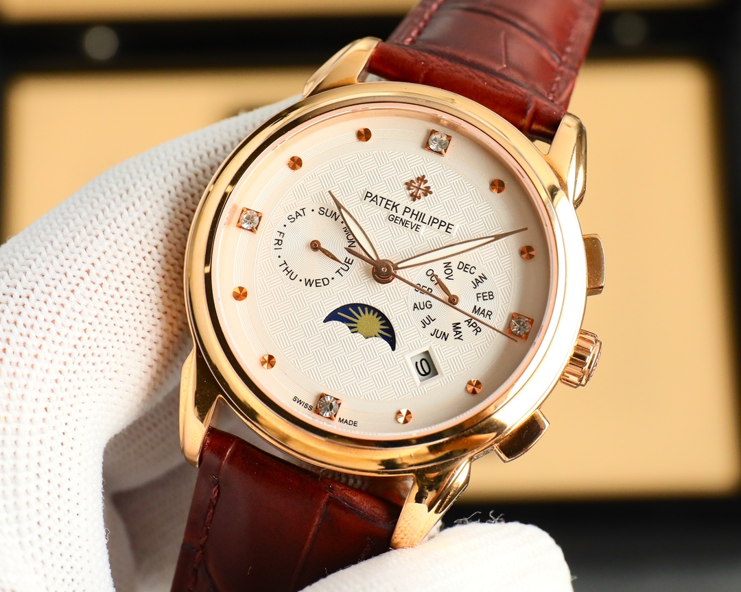这款手表是AAAAA 1:1 质量 (非常棒). 使用了和原版一模一样的材料. 商标部分也保持了和百达翡丽/Patek Philippe一样. 图片拍摄是实物手表拍摄, 您所收到的实物保证和我们图片一模一样.