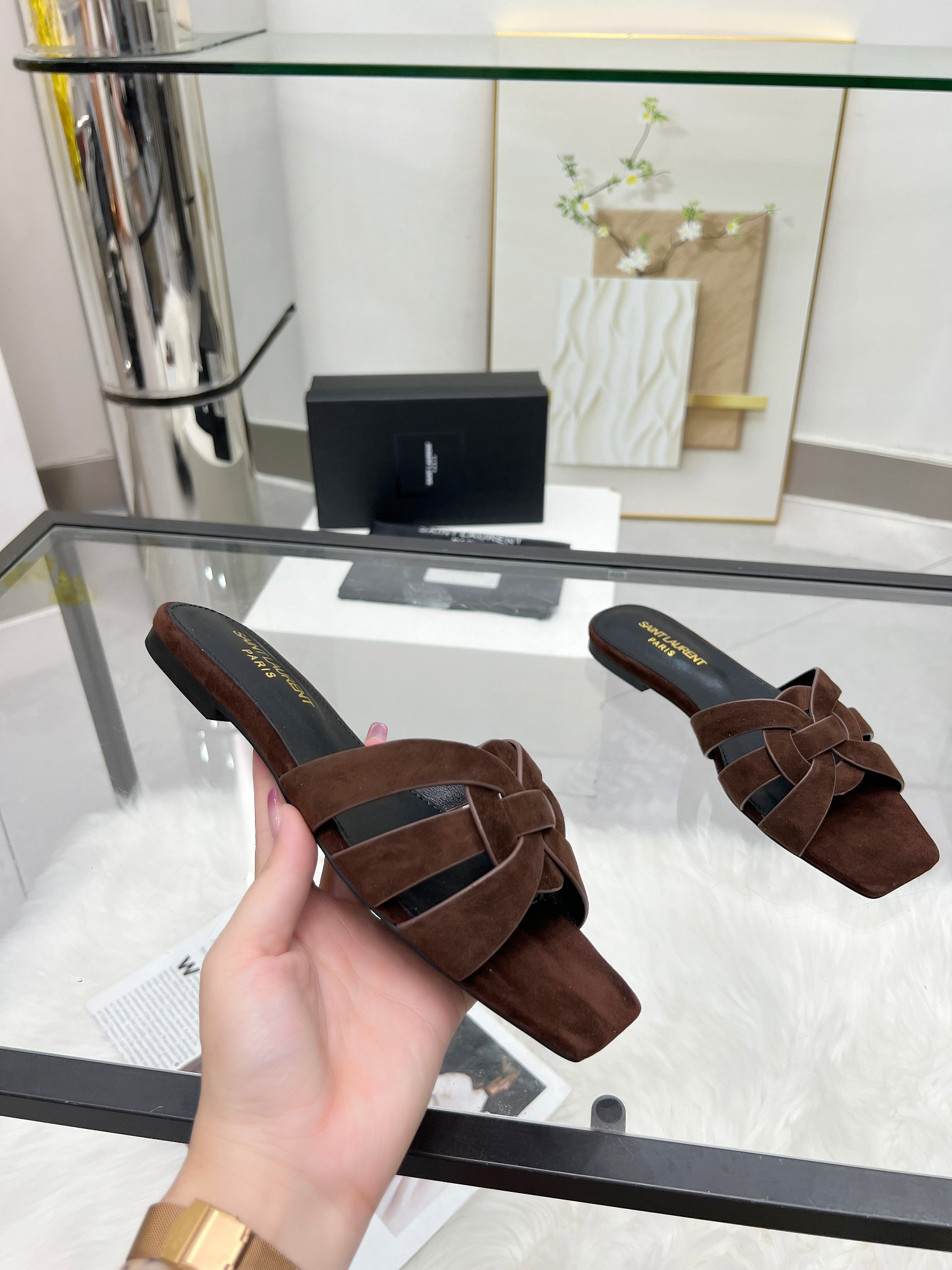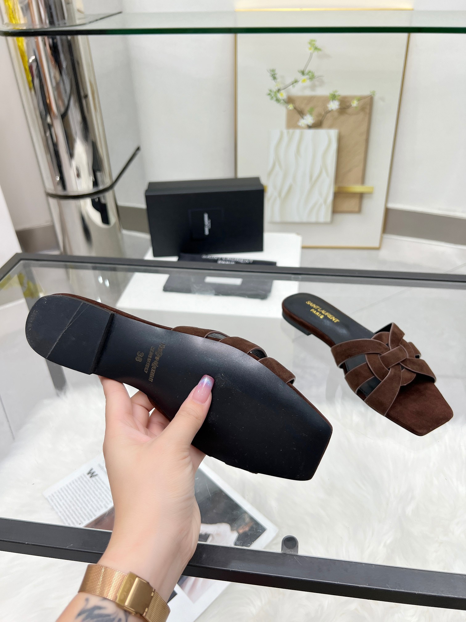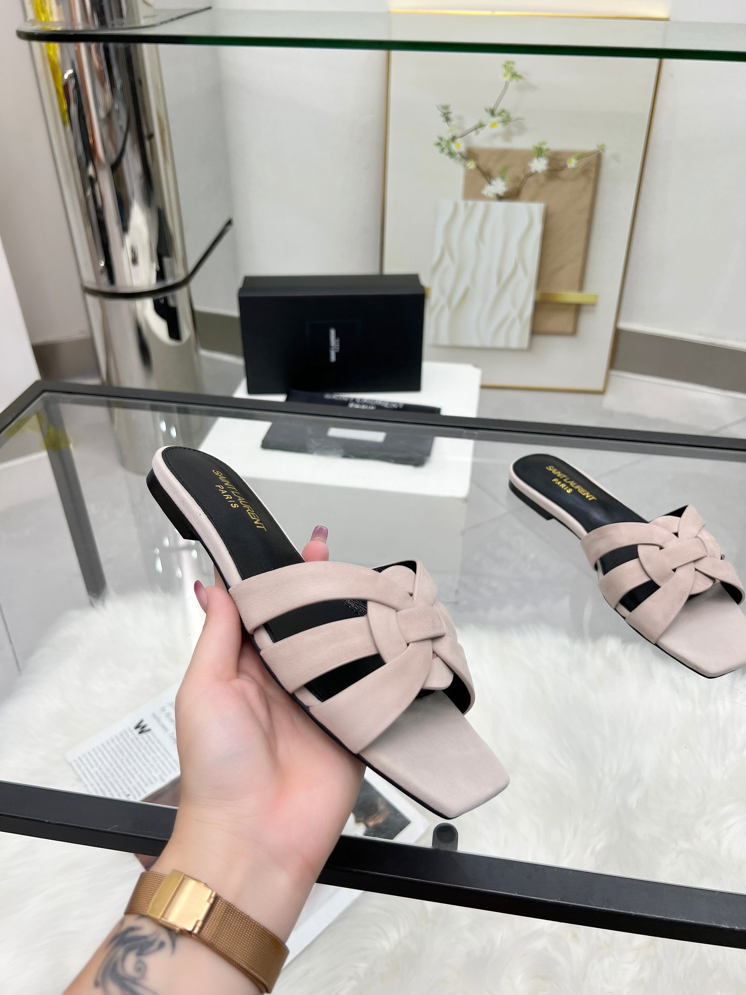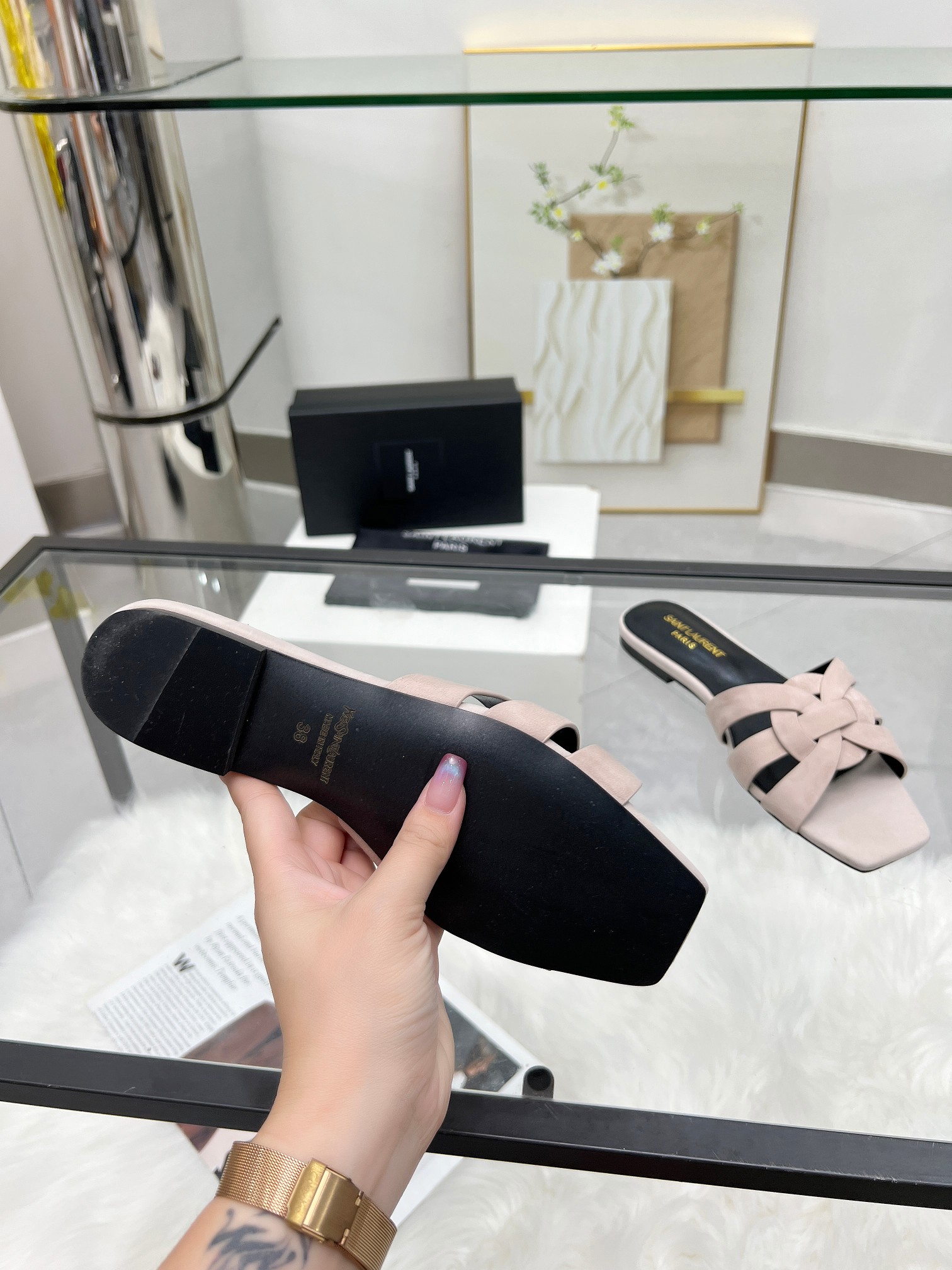 这款鞋子是AAAAA 1:1 质量 (非常棒). 使用了和原版一模一样的材料. 商标部分也保持了和圣罗兰/Saint Laurent一样. 图片拍摄是实物鞋子拍摄, 您所收到的实物保证和我们图片一模一样.