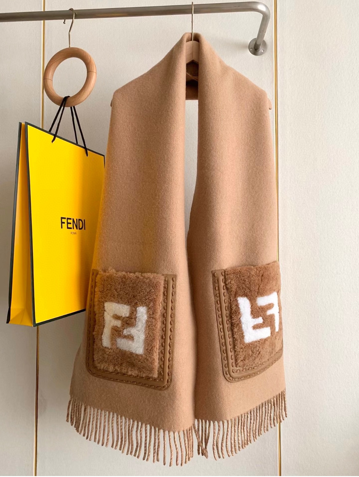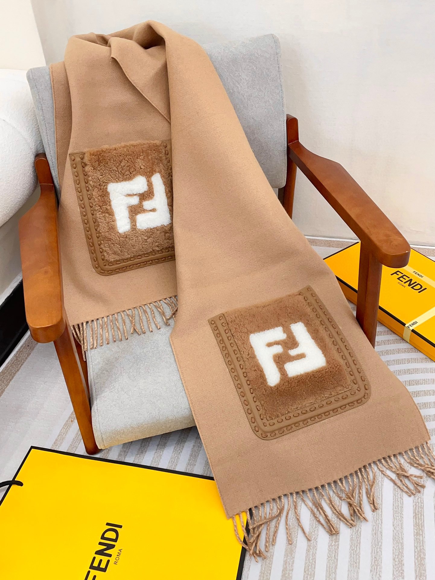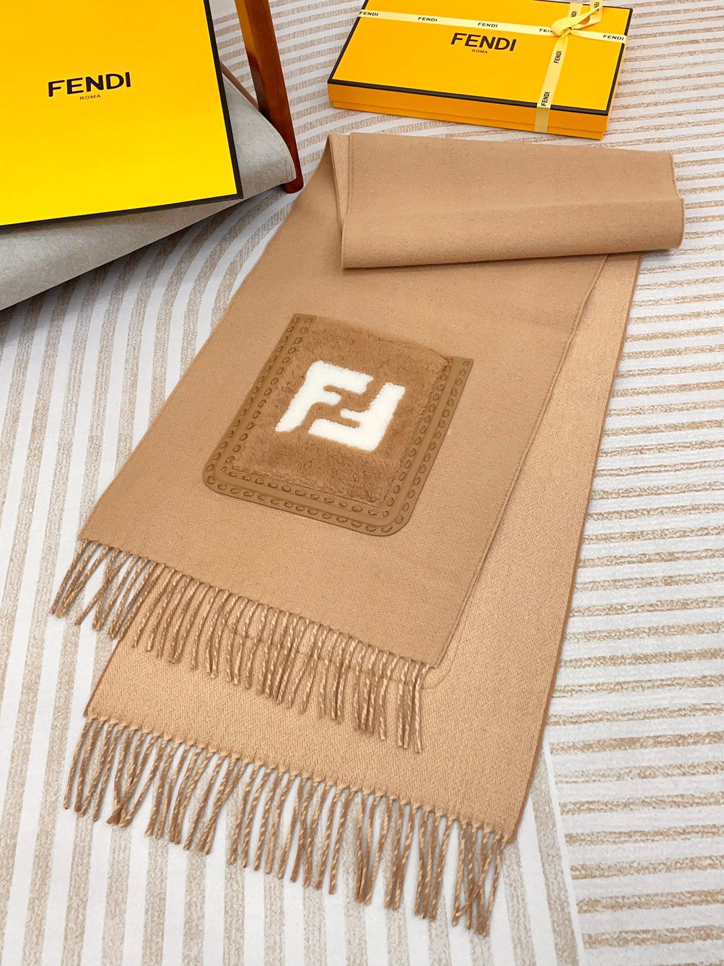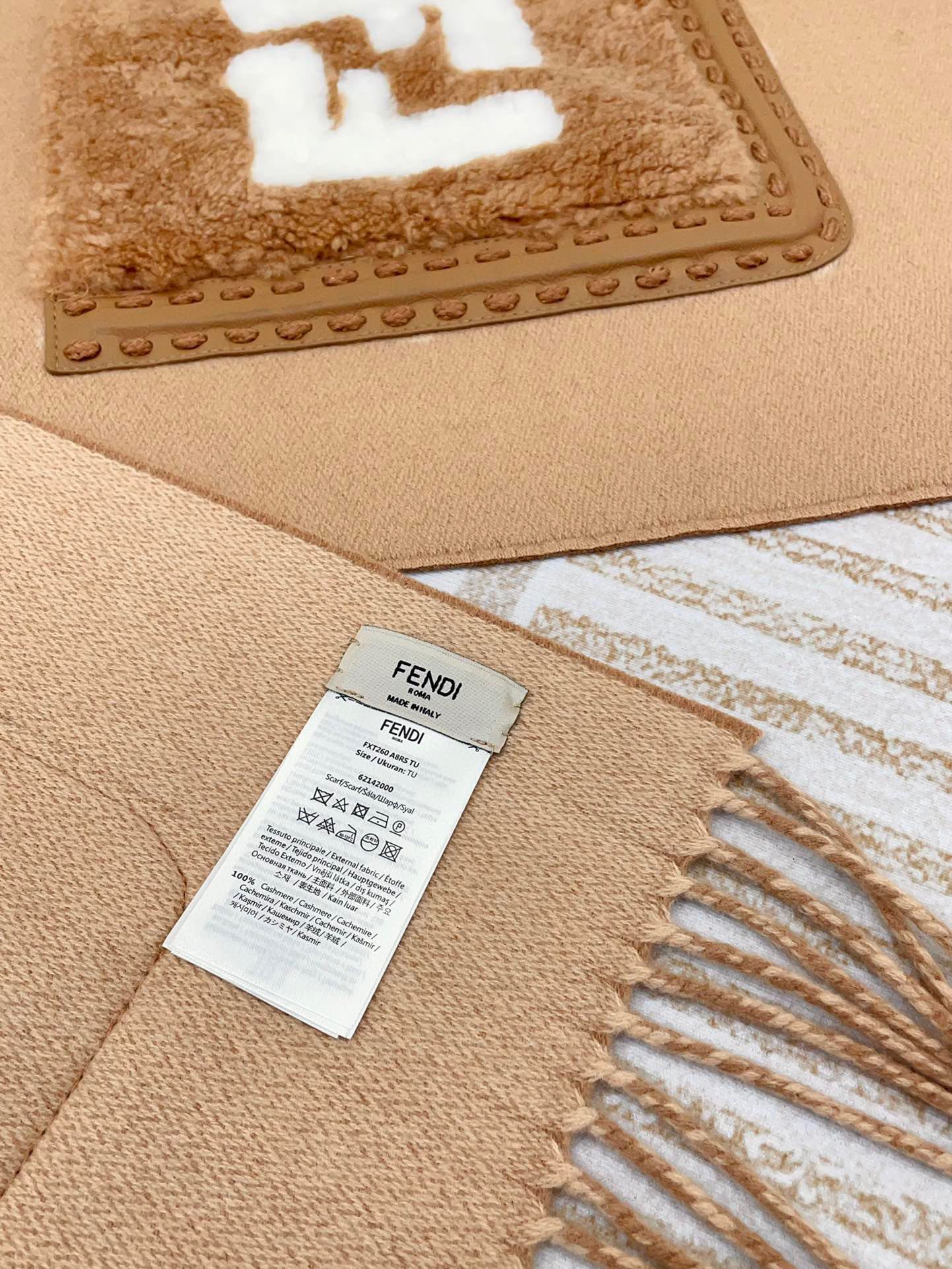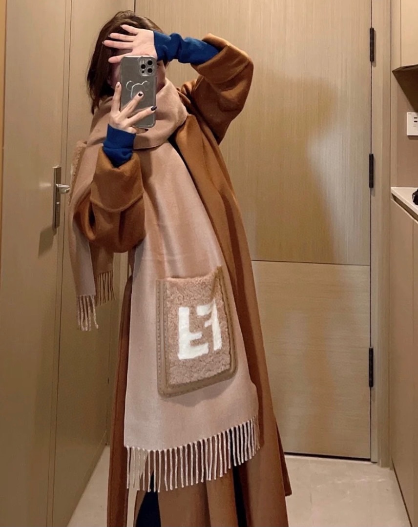 这款围巾是AAAAA 1:1 质量 (非常棒). 使用了和原版一模一样的材料. 商标部分也保持了和芬迪/Fendi一样. 图片拍摄是实物围巾拍摄, 您所收到的实物保证和我们图片一模一样.
