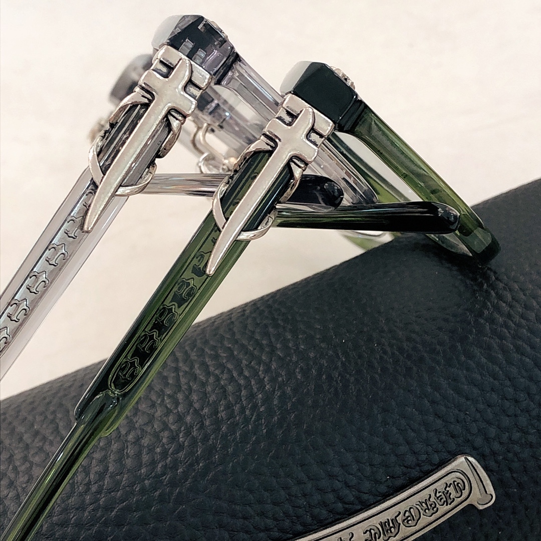 这款太阳眼镜是AAAAA 1:1 质量 (非常棒). 使用了和原版一模一样的材料. 商标部分也保持了和克罗心/Chrome Hearts一样. 图片拍摄是实物太阳眼镜拍摄, 您所收到的实物保证和我们图片一模一样.