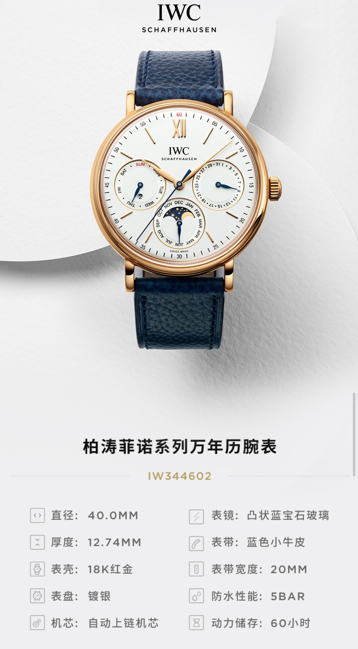 这款手表是AAAAA 1:1 质量 (非常棒). 使用了和原版一模一样的材料. 商标部分也保持了和万国表/IWC Schaffhausen一样. 图片拍摄是实物手表拍摄, 您所收到的实物保证和我们图片一模一样.