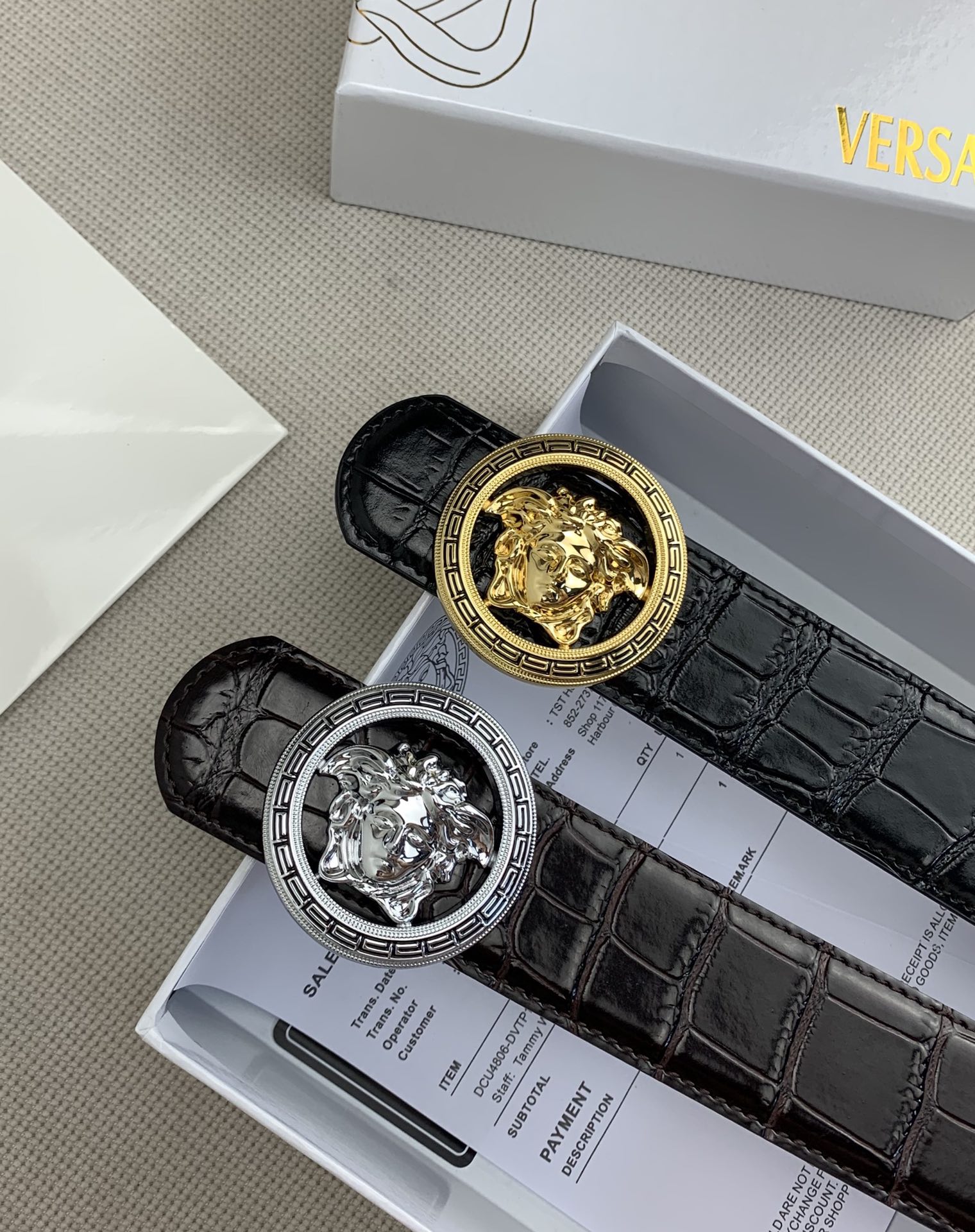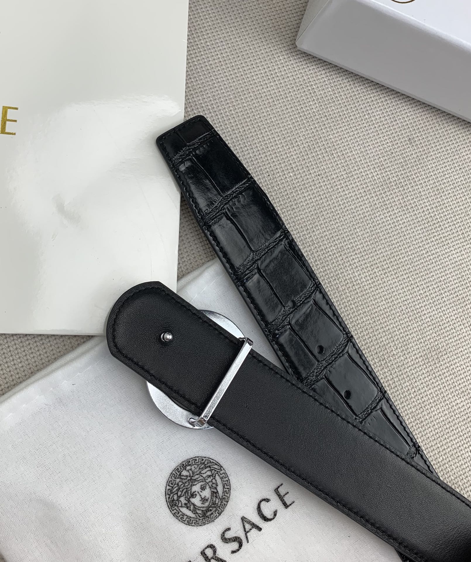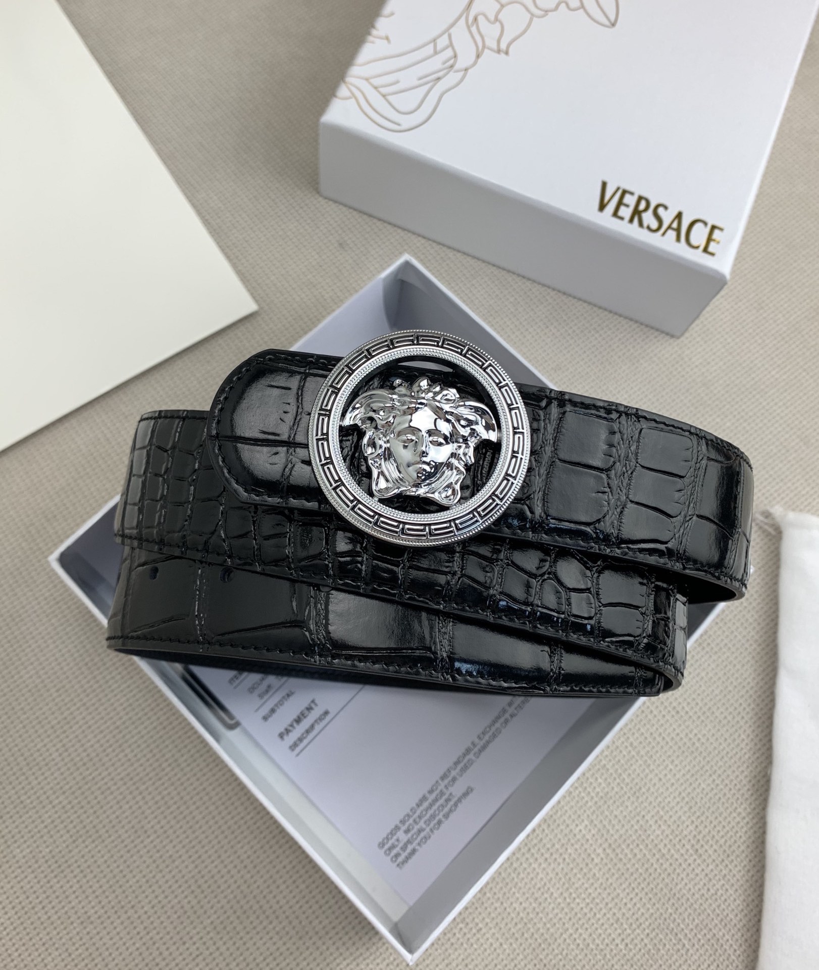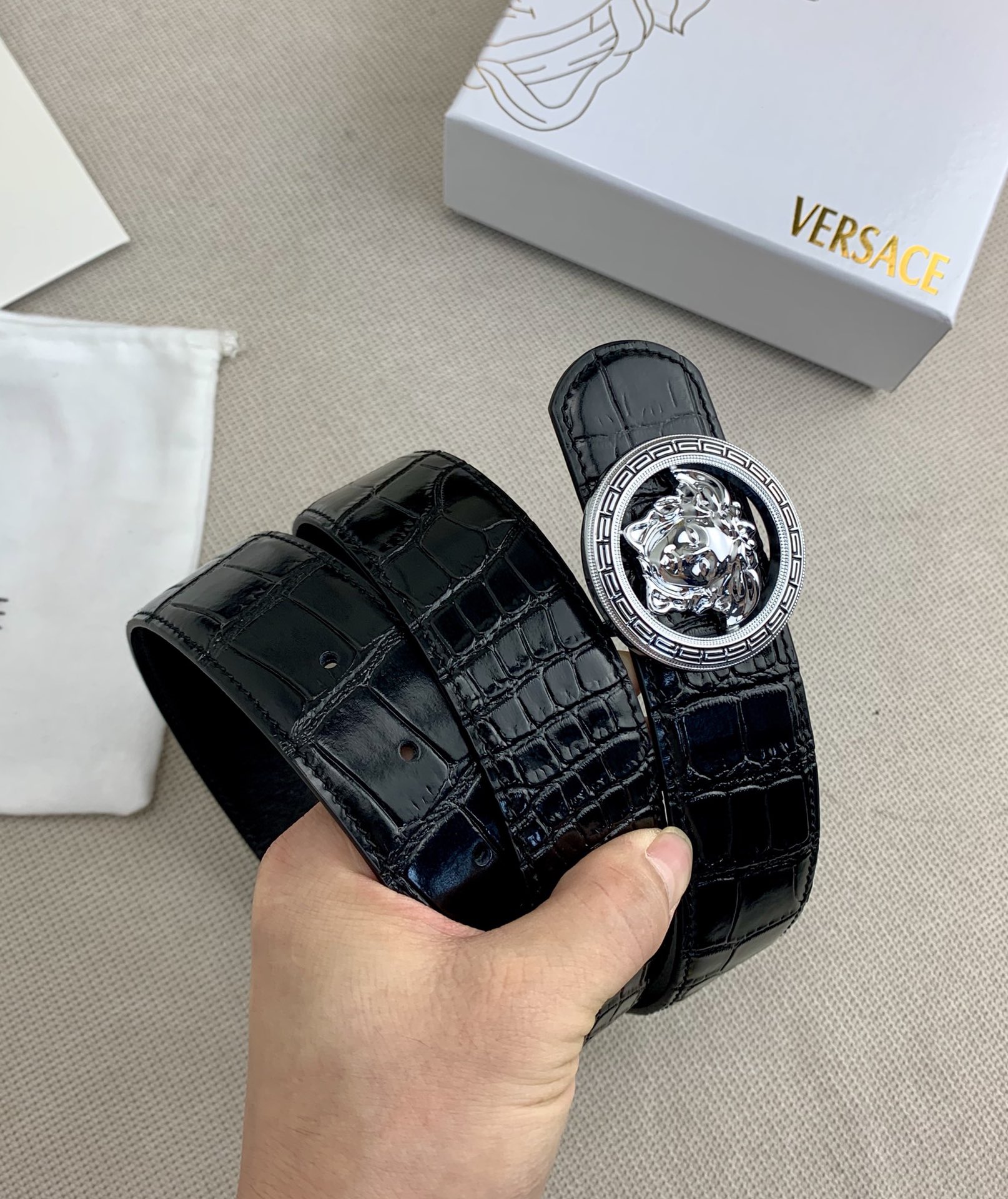 这款皮带是AAAAA 1:1 质量 (非常棒). 使用了和原版一模一样的材料. 商标部分也保持了和范思哲/Versace一样. 图片拍摄是实物皮带拍摄, 您所收到的实物保证和我们图片一模一样.