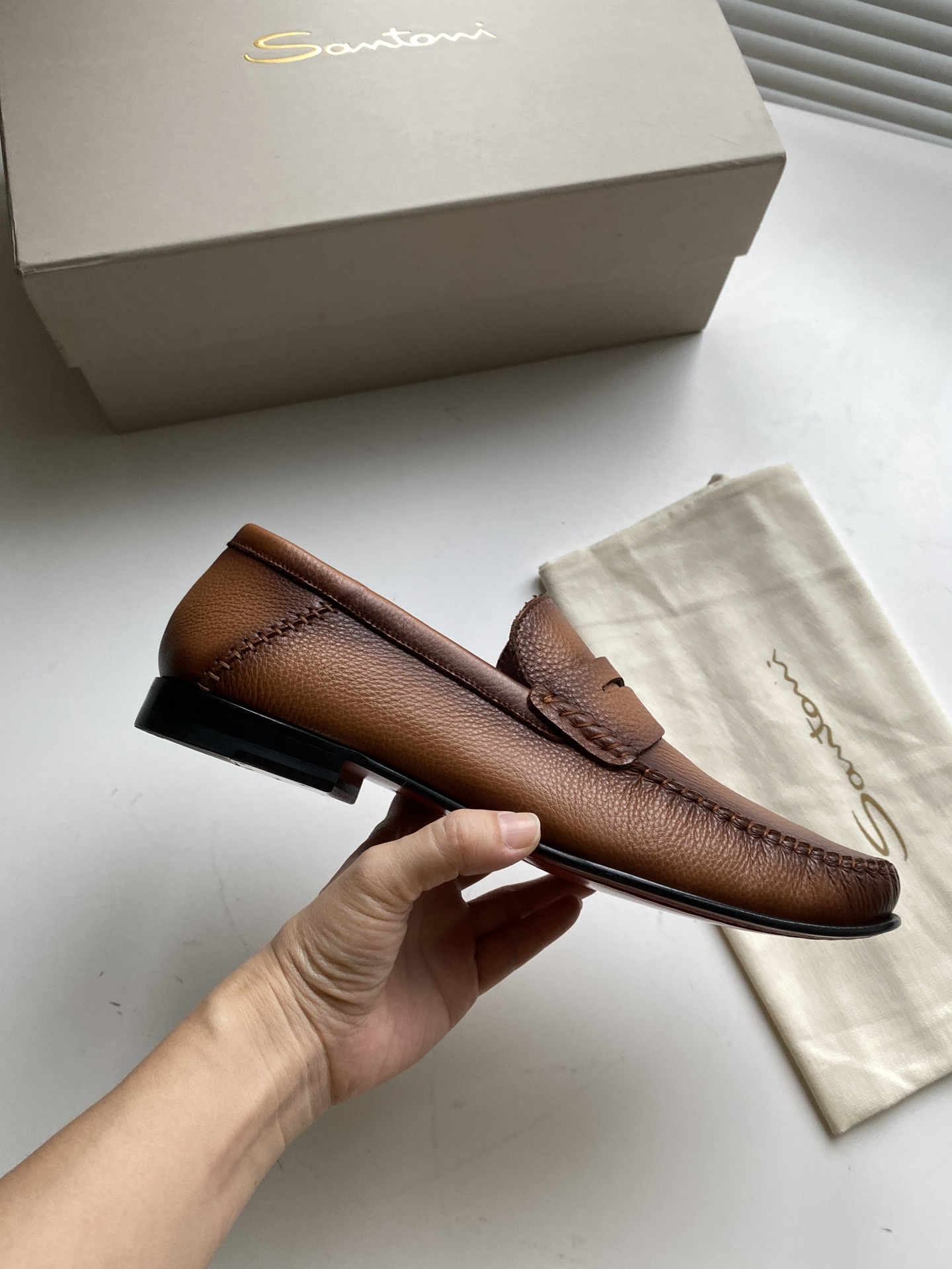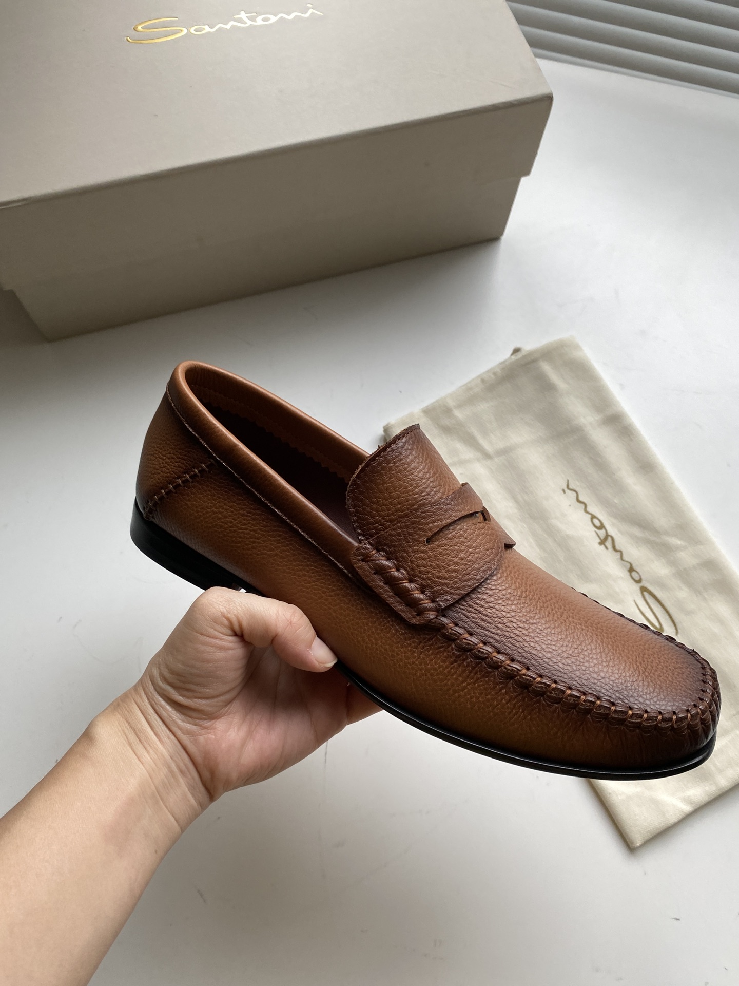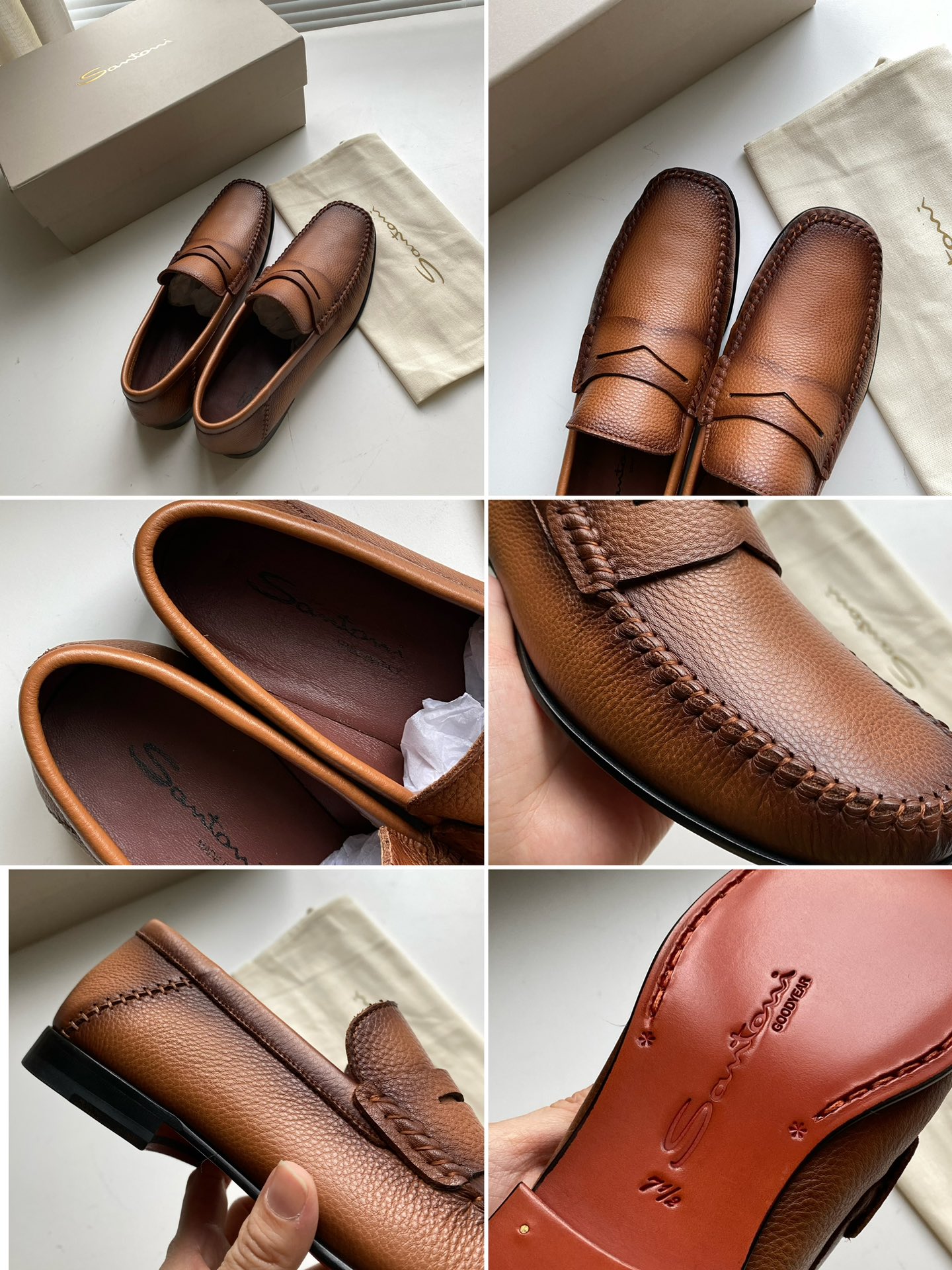 这款鞋子是AAAAA 1:1 质量 (非常棒). 使用了和原版一模一样的材料. 商标部分也保持了和Santoni一样. 图片拍摄是实物鞋子拍摄, 您所收到的实物保证和我们图片一模一样.