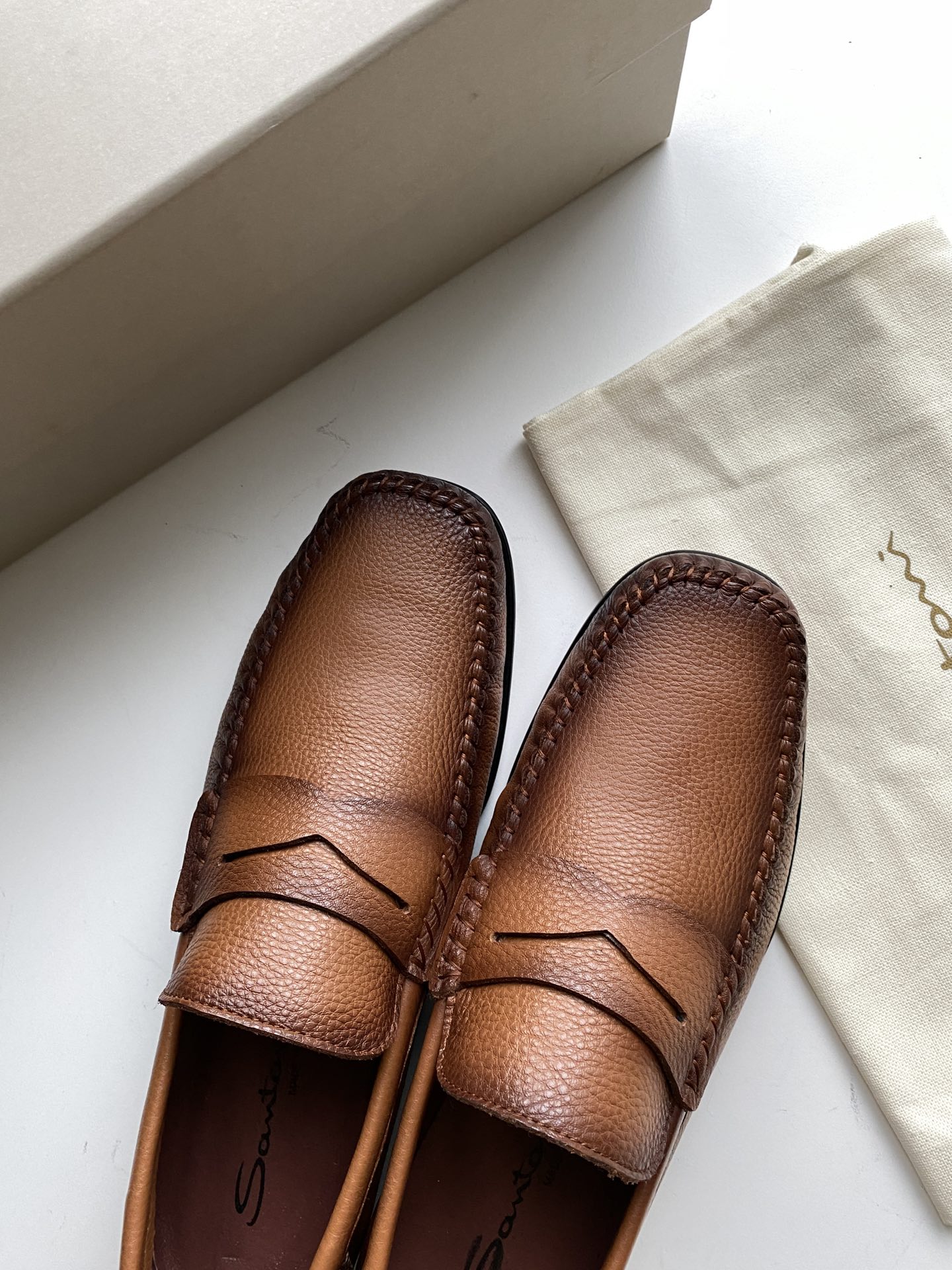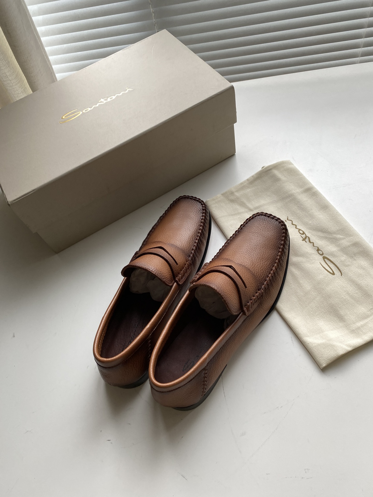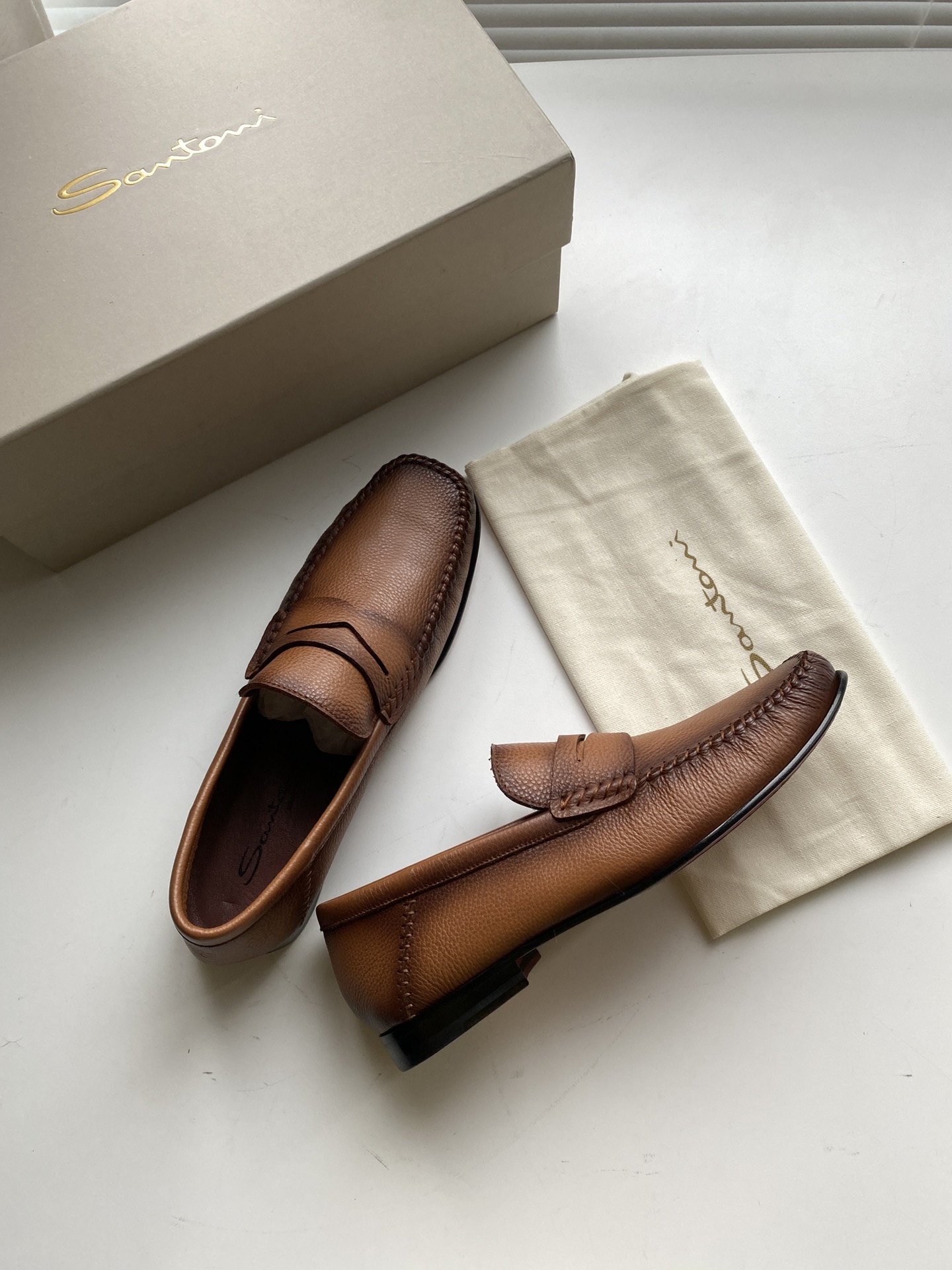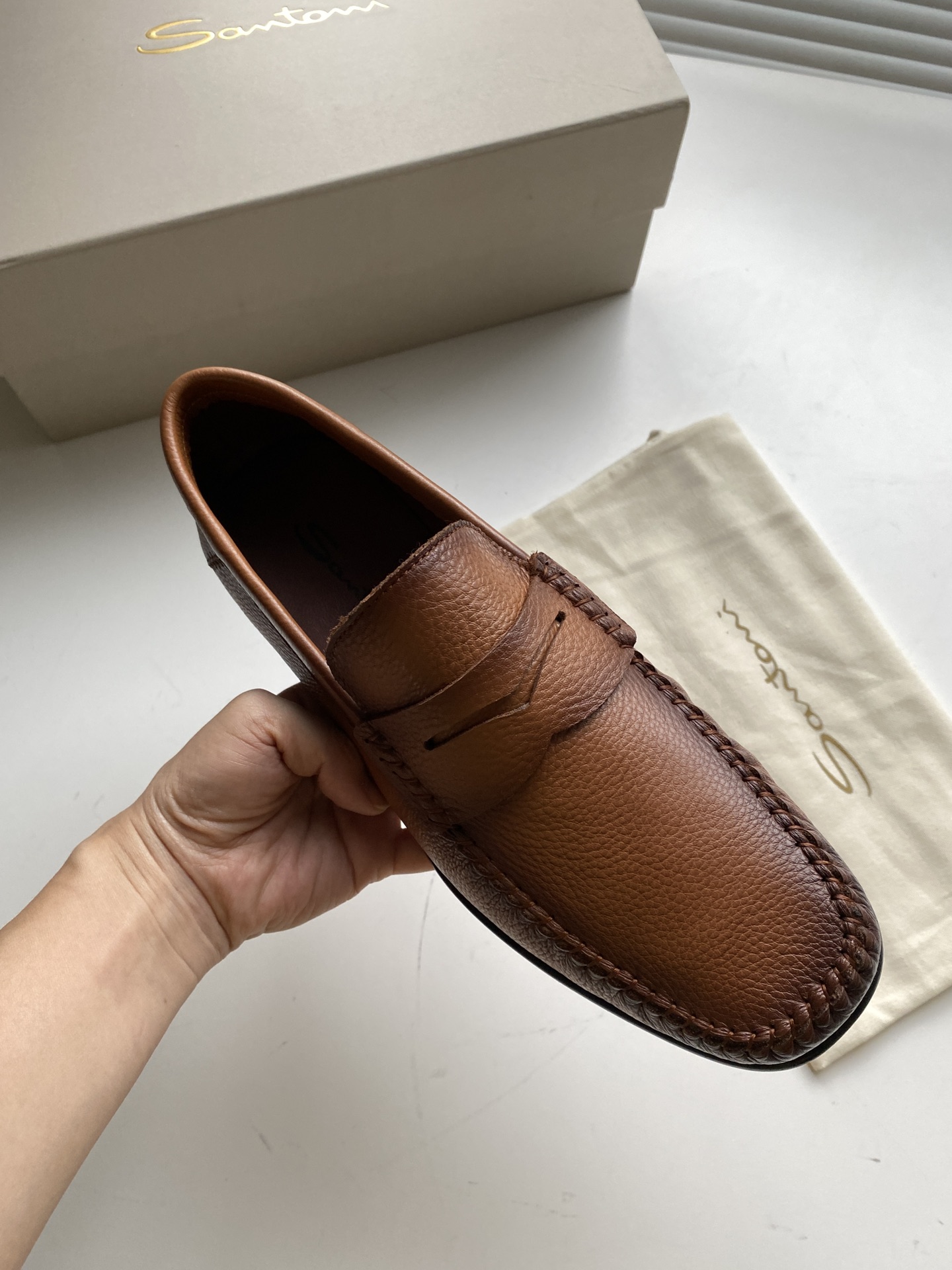 这款鞋子是AAAAA 1:1 质量 (非常棒). 使用了和原版一模一样的材料. 商标部分也保持了和Santoni一样. 图片拍摄是实物鞋子拍摄, 您所收到的实物保证和我们图片一模一样.