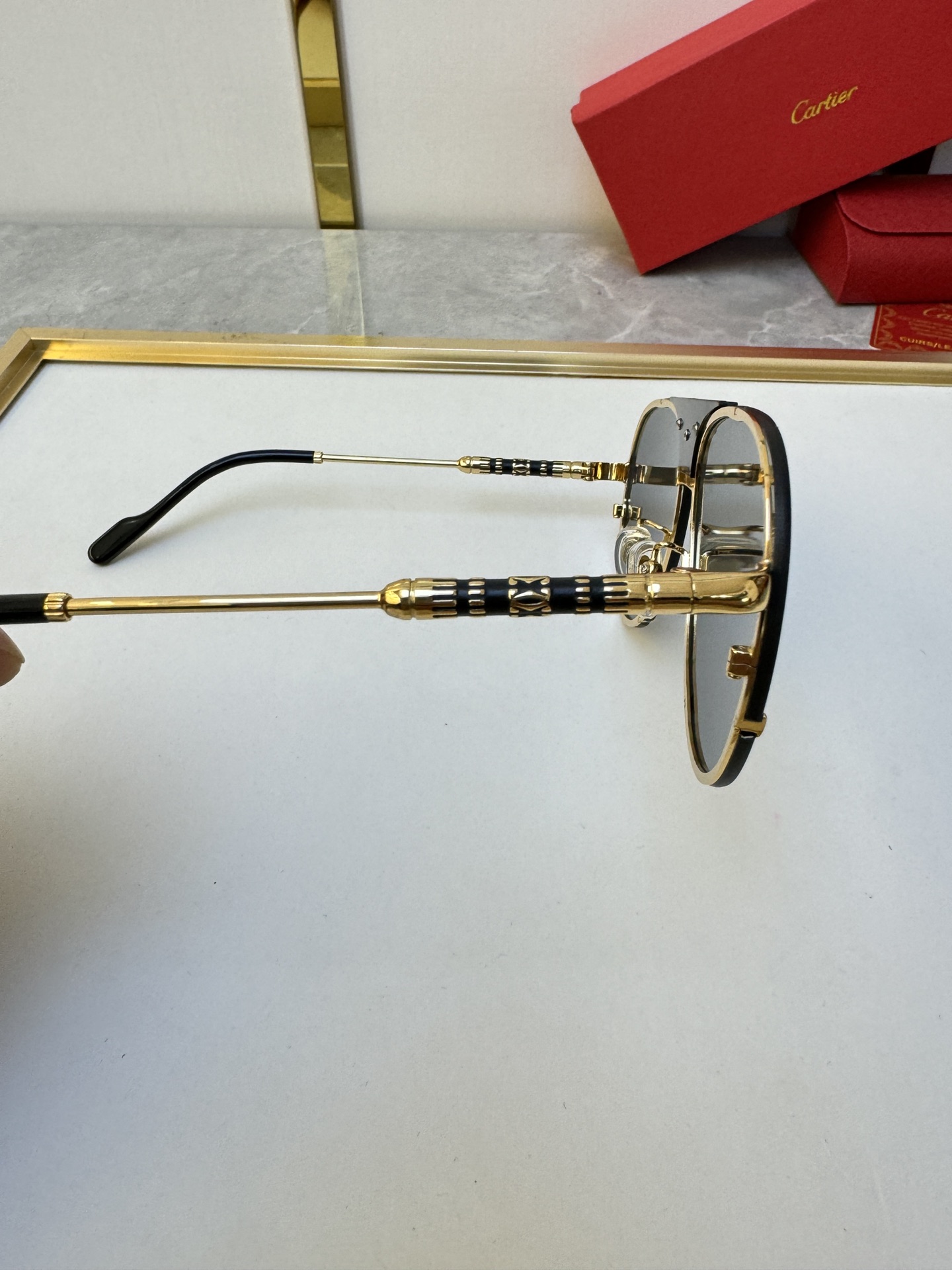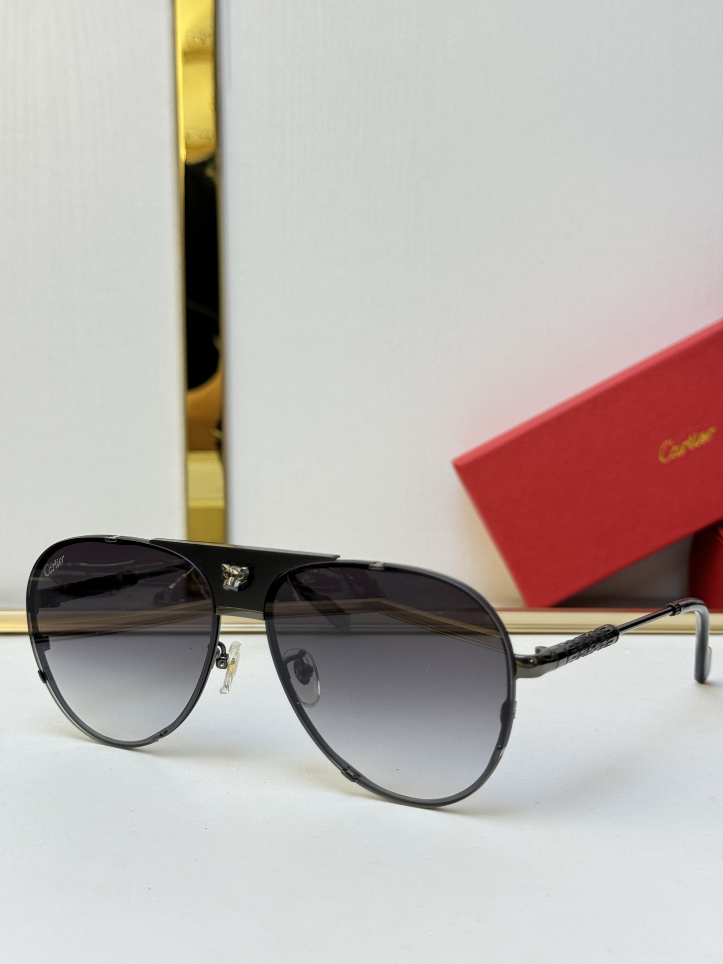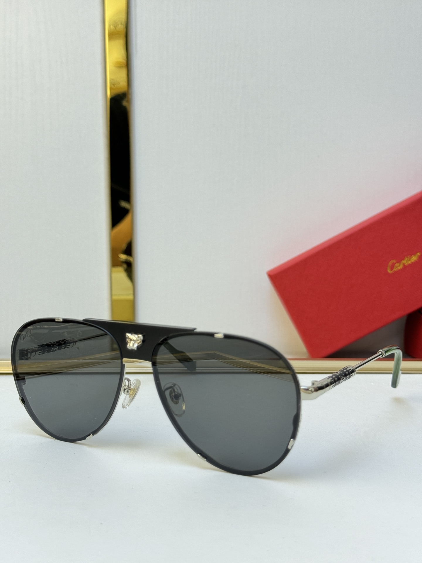 这款太阳眼镜是AAAAA 1:1 质量 (非常棒). 使用了和原版一模一样的材料. 商标部分也保持了和卡地亚/Cartier一样. 图片拍摄是实物太阳眼镜拍摄, 您所收到的实物保证和我们图片一模一样.