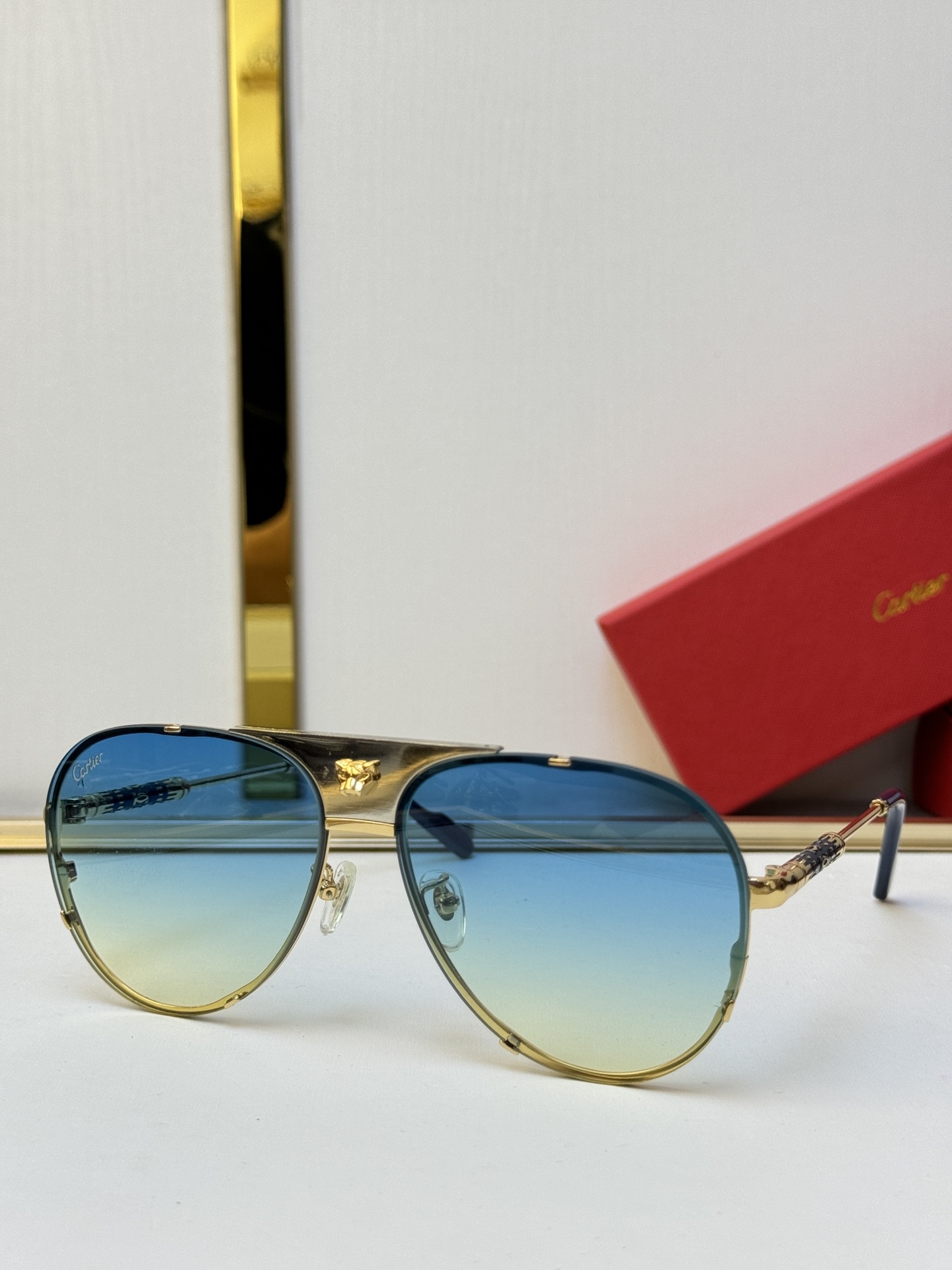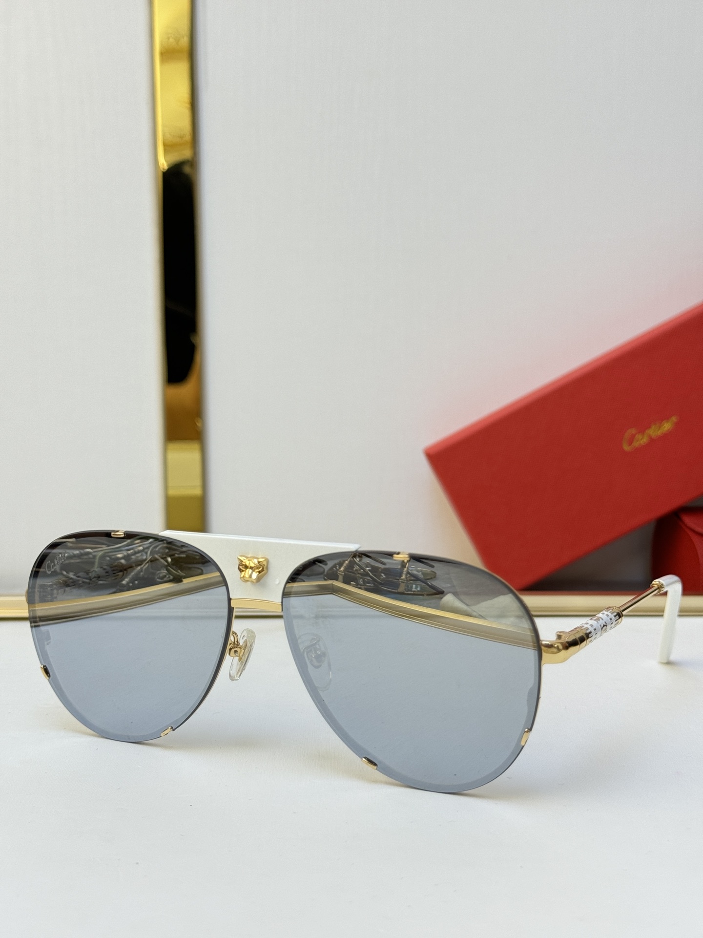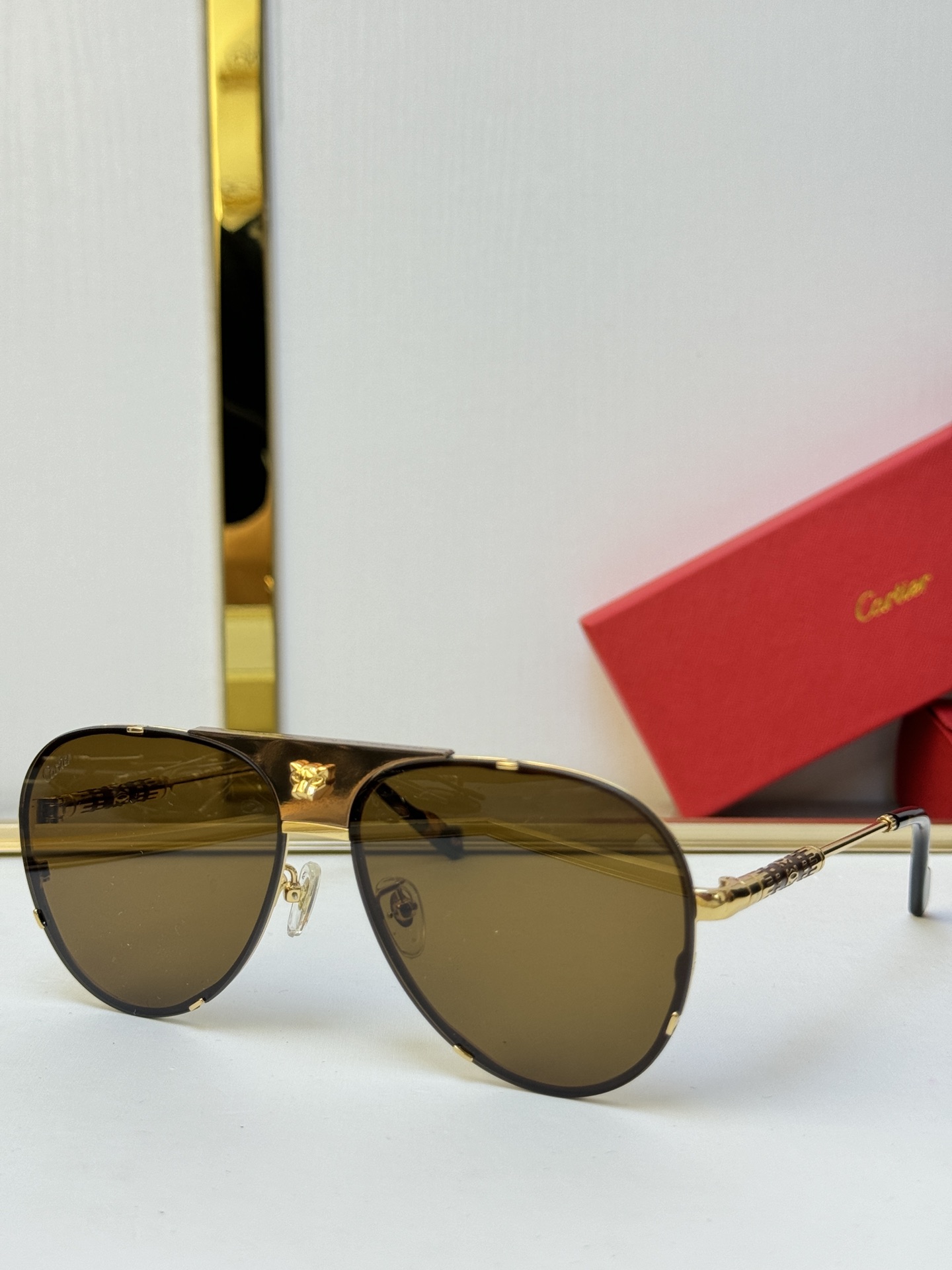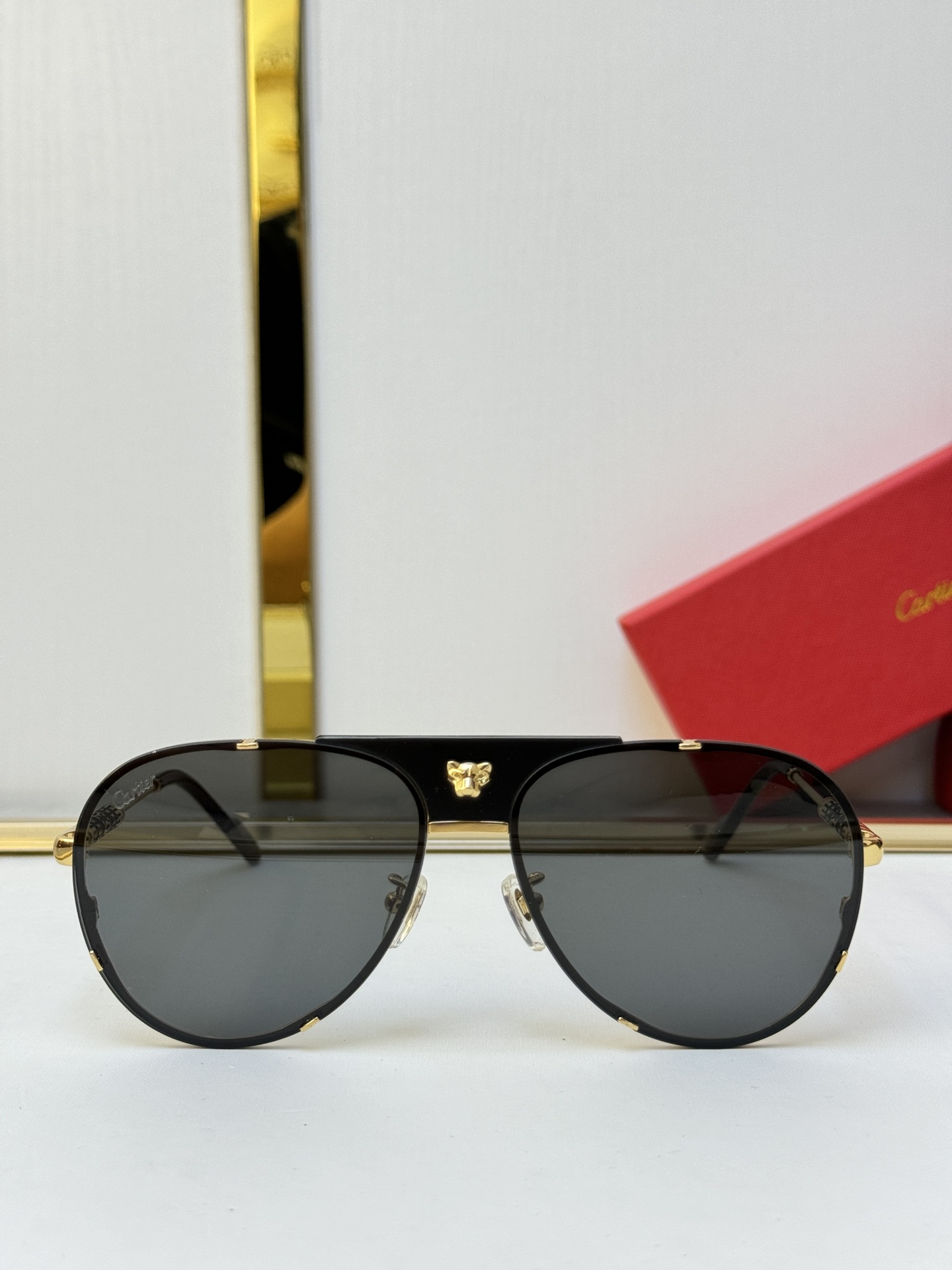 这款太阳眼镜是AAAAA 1:1 质量 (非常棒). 使用了和原版一模一样的材料. 商标部分也保持了和卡地亚/Cartier一样. 图片拍摄是实物太阳眼镜拍摄, 您所收到的实物保证和我们图片一模一样.
