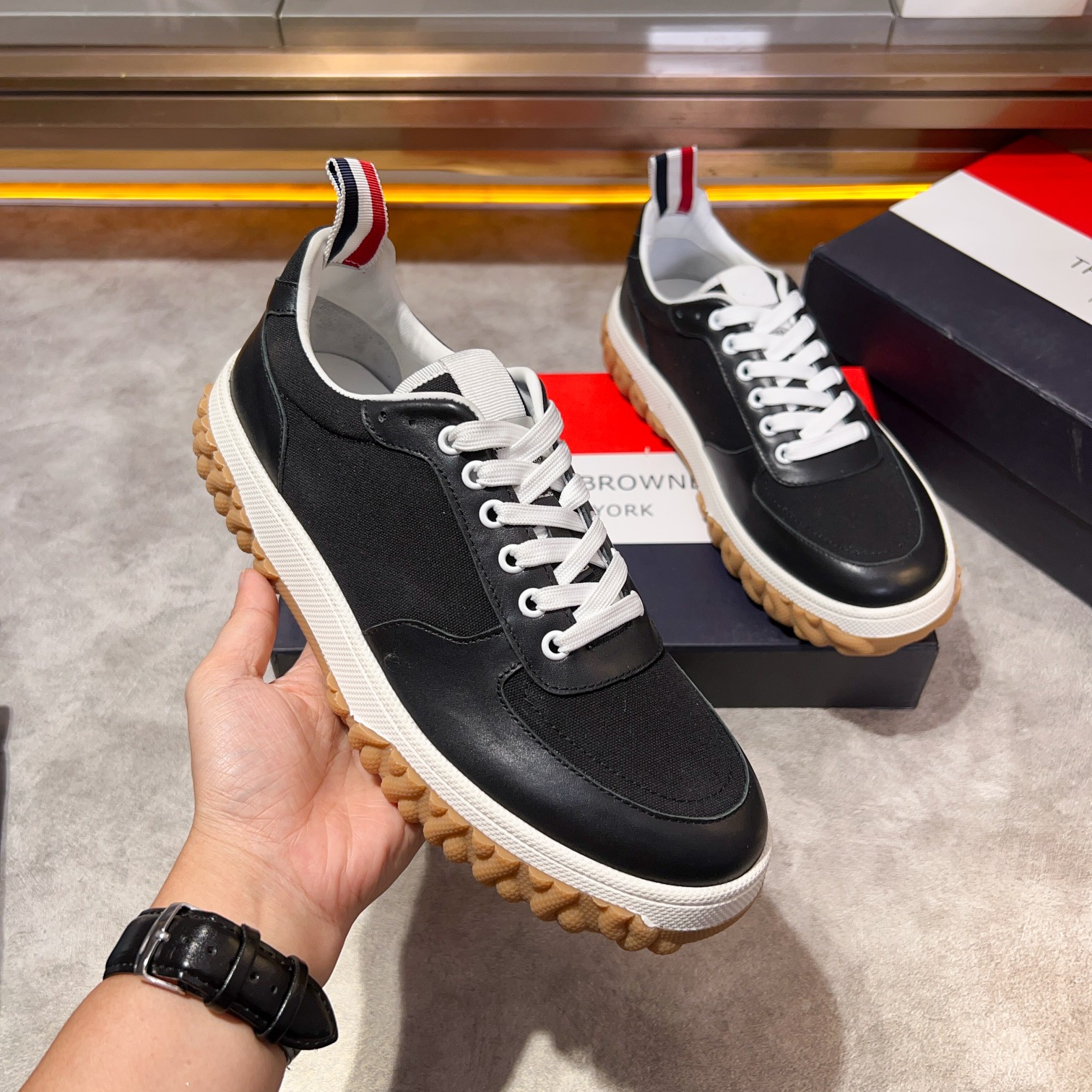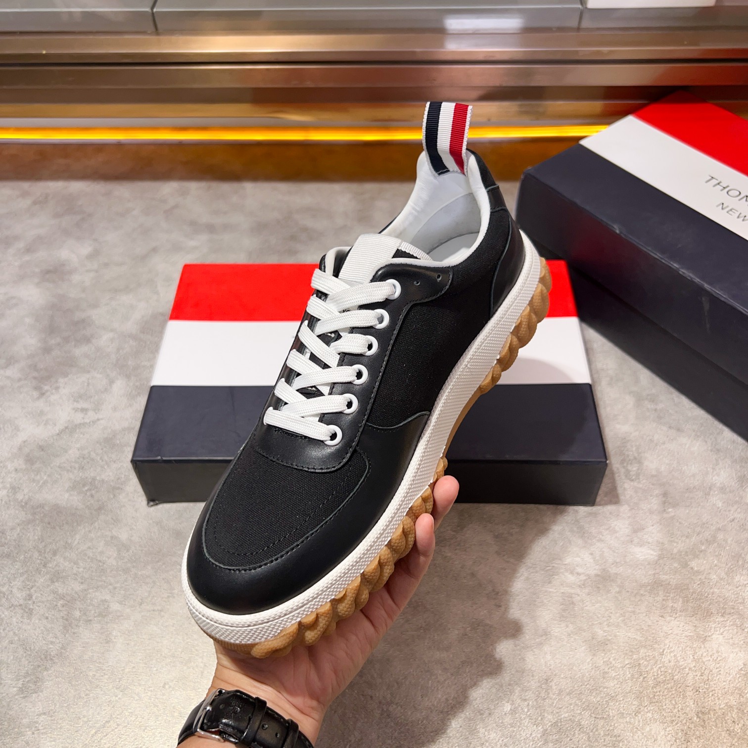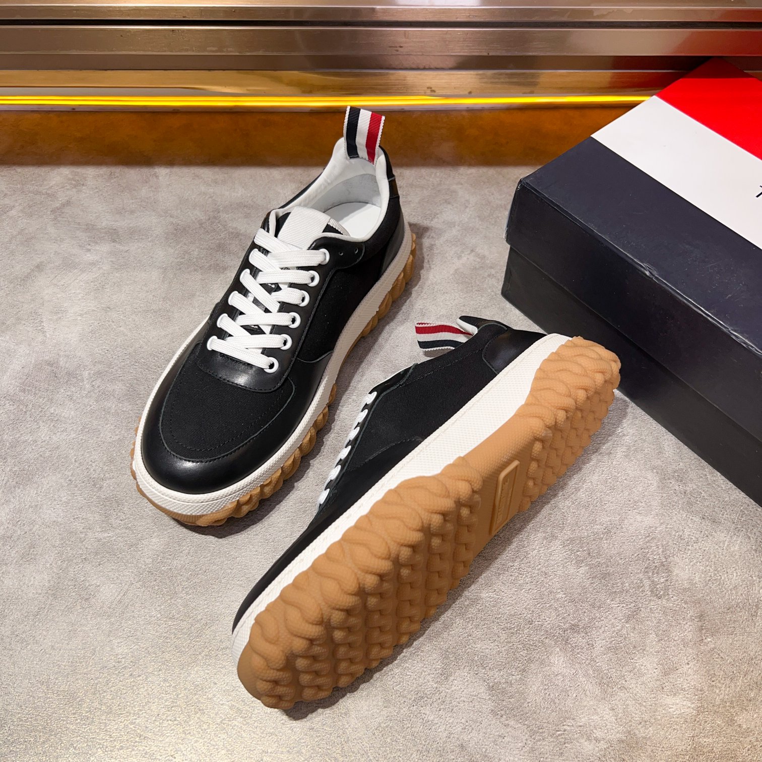 这款鞋子是AAAAA 1:1 质量 (非常棒). 使用了和原版一模一样的材料. 商标部分也保持了和汤姆布朗/Thom Browne一样. 图片拍摄是实物鞋子拍摄, 您所收到的实物保证和我们图片一模一样.