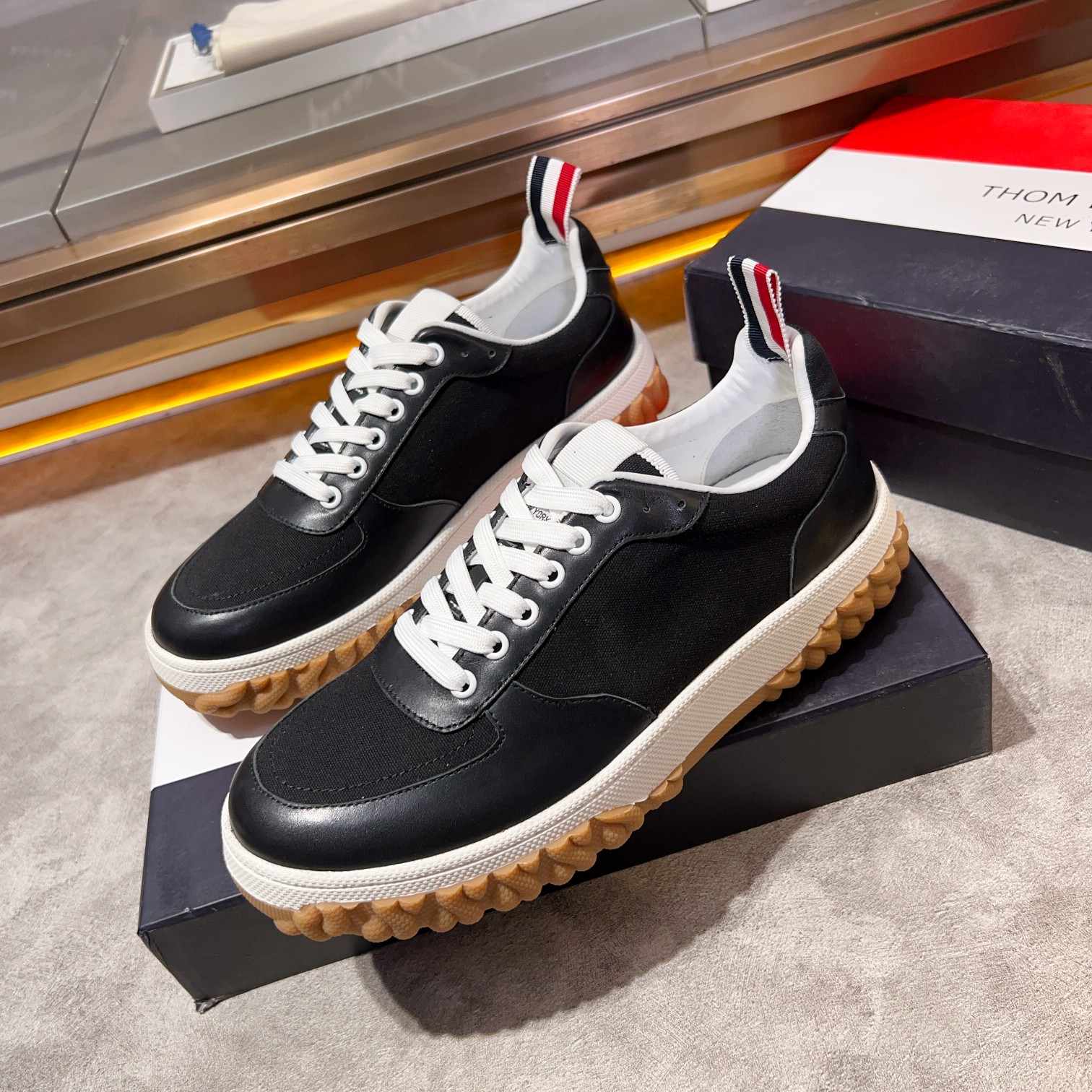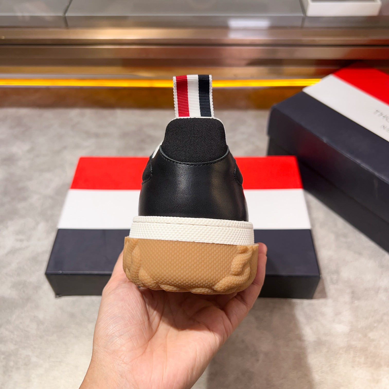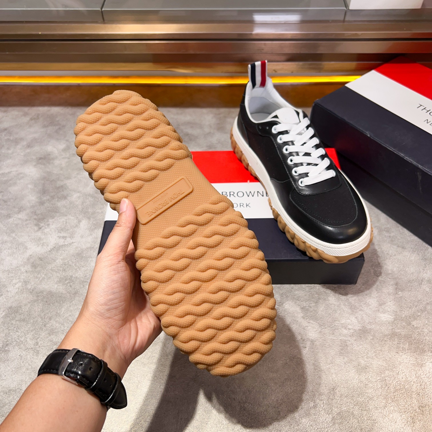 这款鞋子是AAAAA 1:1 质量 (非常棒). 使用了和原版一模一样的材料. 商标部分也保持了和汤姆布朗/Thom Browne一样. 图片拍摄是实物鞋子拍摄, 您所收到的实物保证和我们图片一模一样.