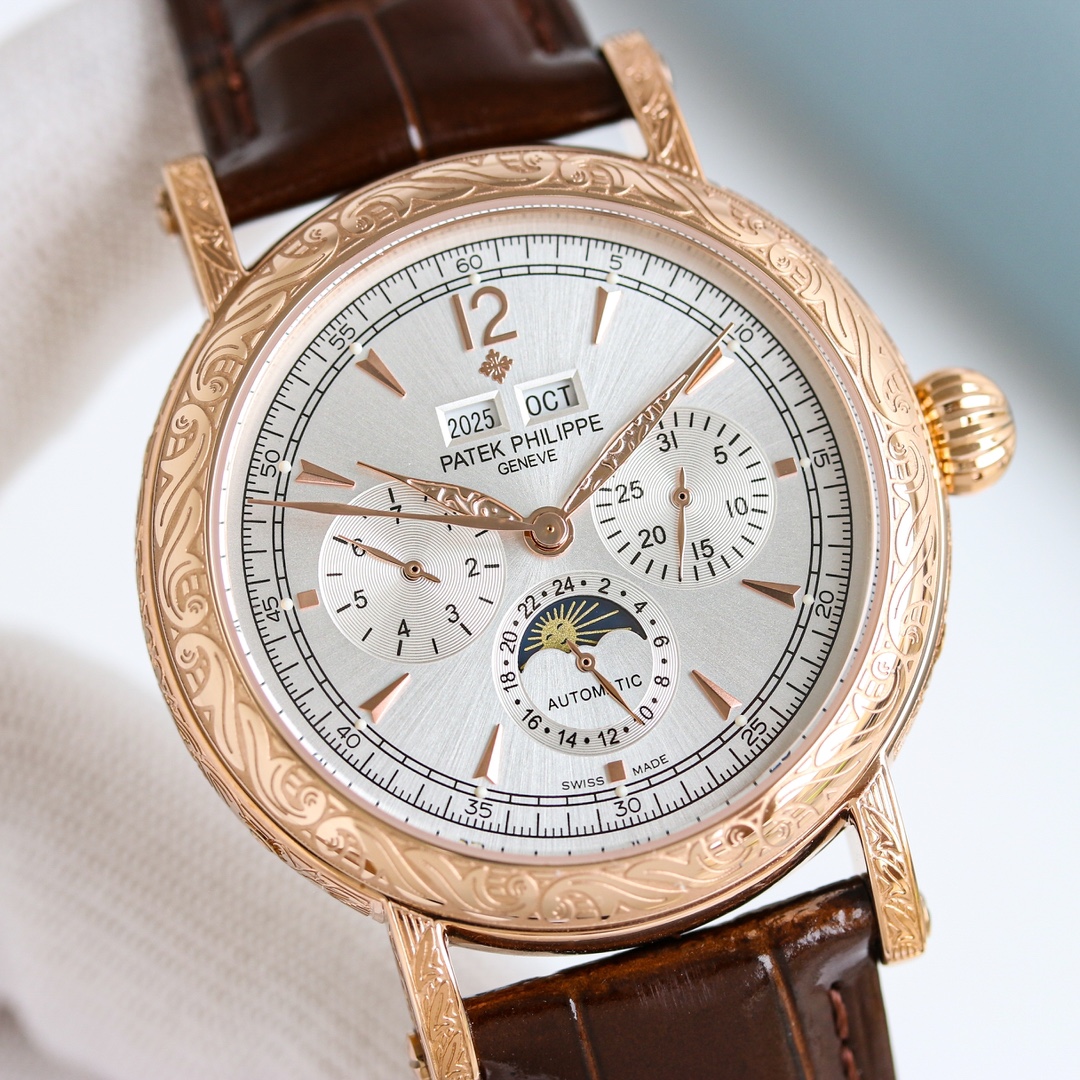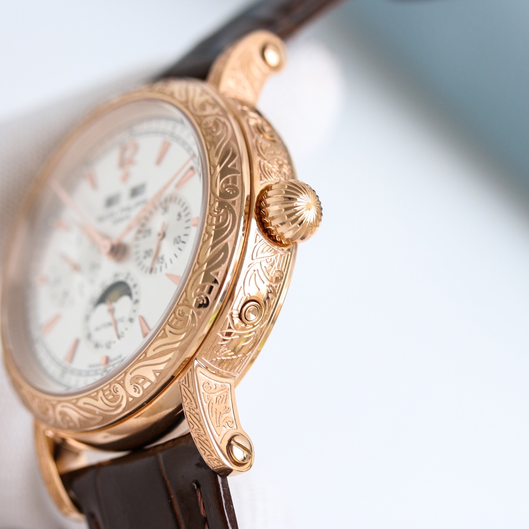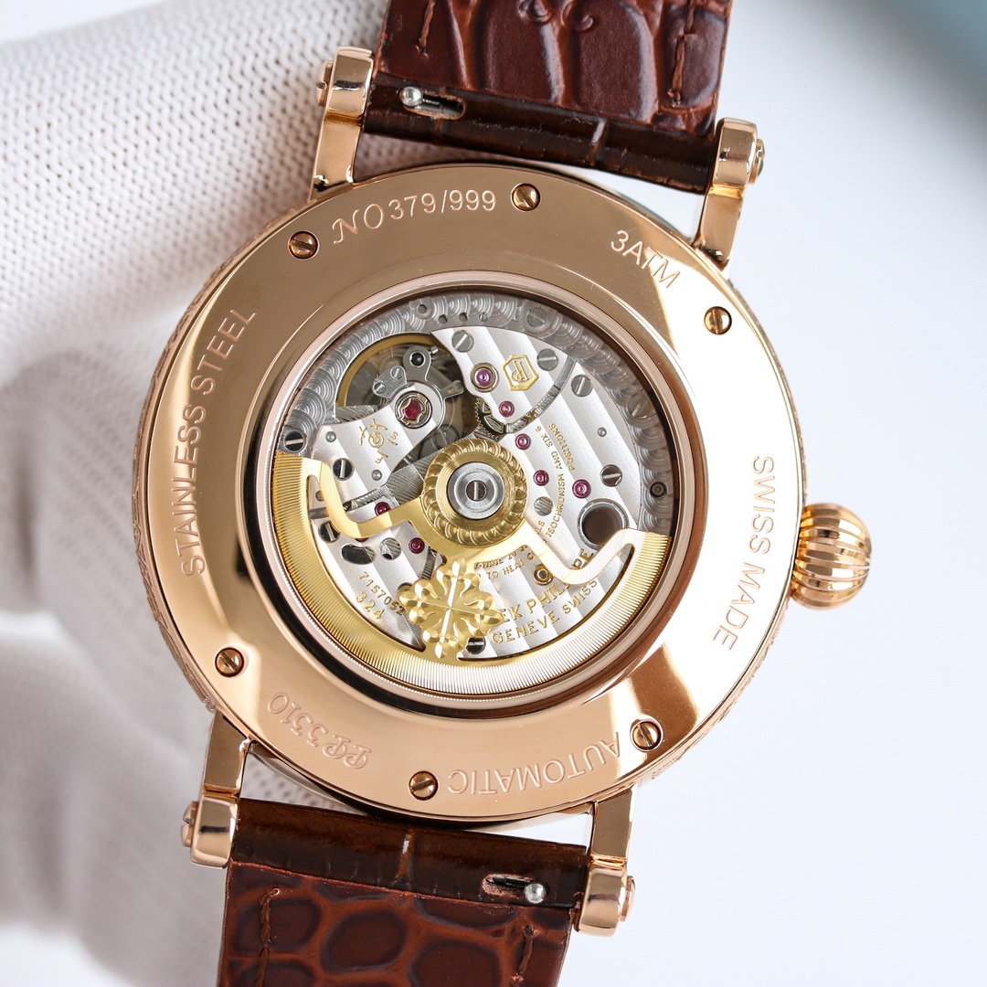 这款手表是AAAAA 1:1 质量 (非常棒). 使用了和原版一模一样的材料. 商标部分也保持了和百达翡丽/Patek Philippe一样. 图片拍摄是实物手表拍摄, 您所收到的实物保证和我们图片一模一样.