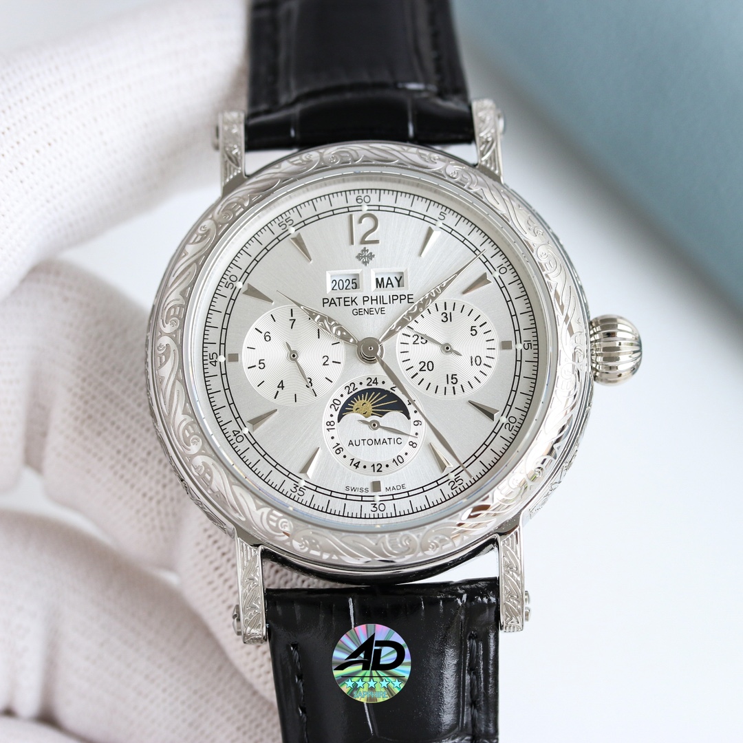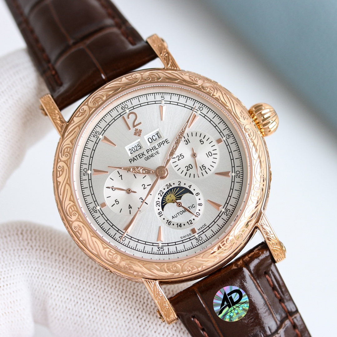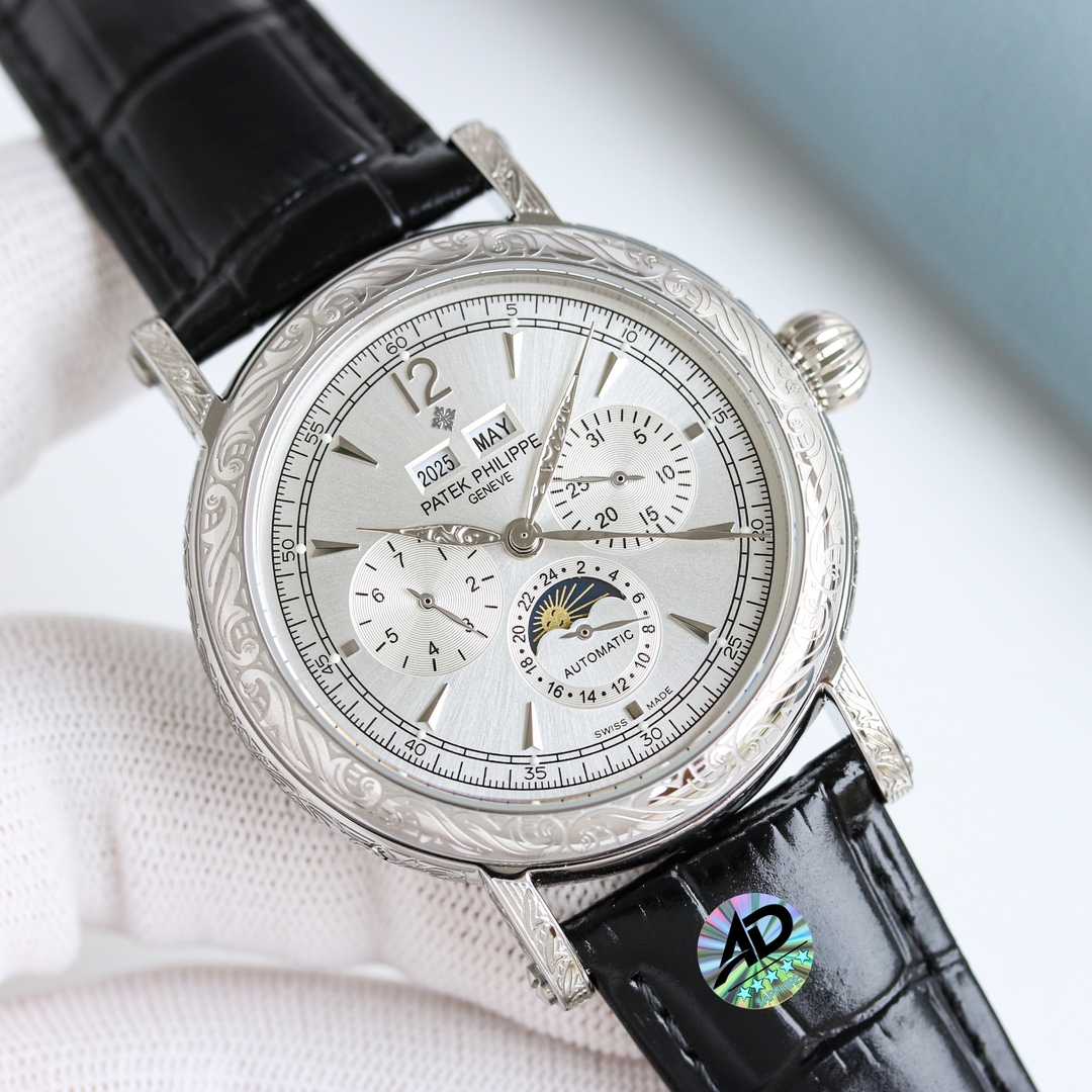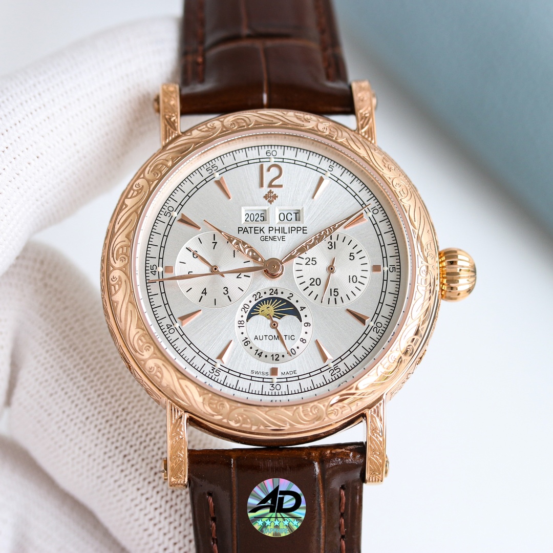 这款手表是AAAAA 1:1 质量 (非常棒). 使用了和原版一模一样的材料. 商标部分也保持了和百达翡丽/Patek Philippe一样. 图片拍摄是实物手表拍摄, 您所收到的实物保证和我们图片一模一样.