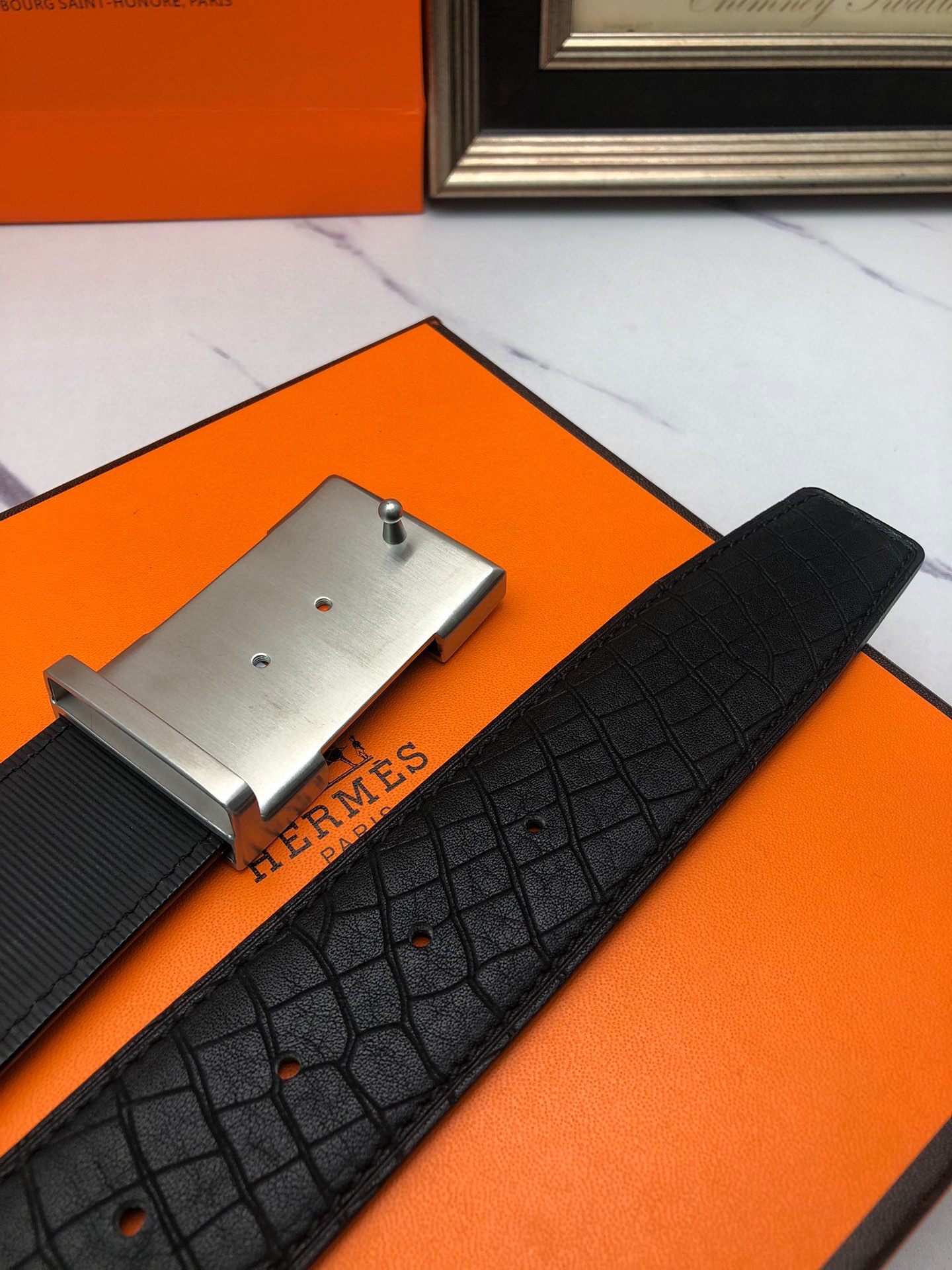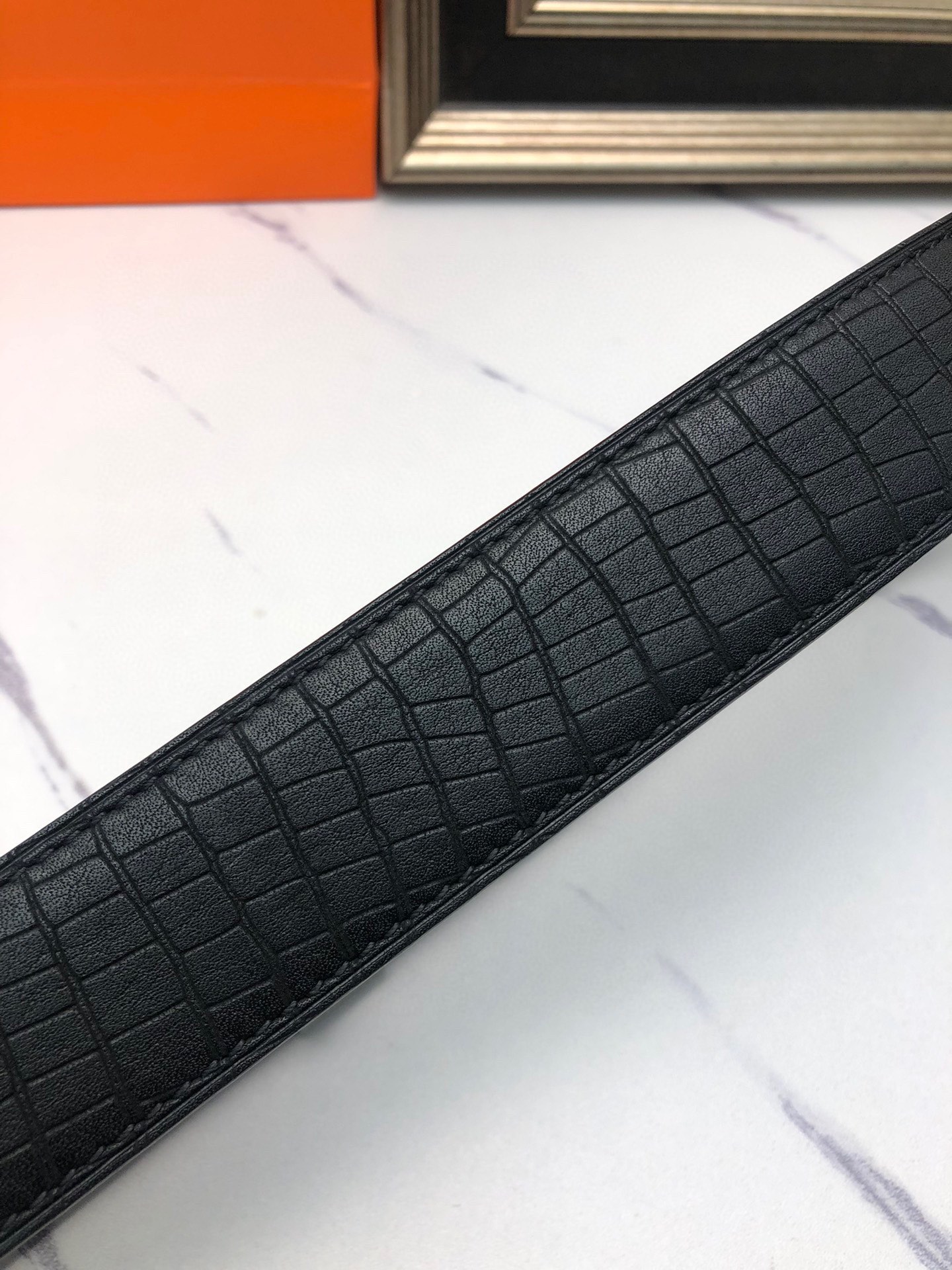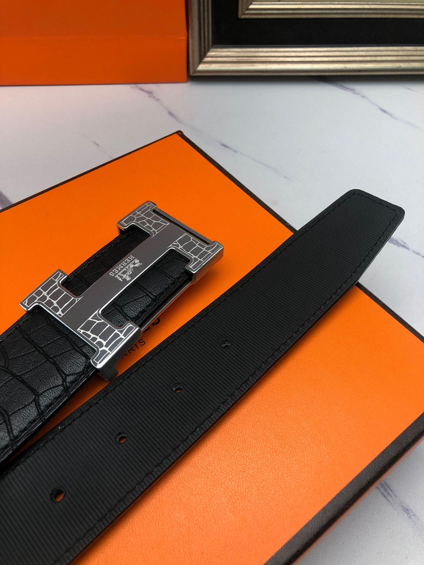 这款皮带是AAAAA 1:1 质量 (非常棒). 使用了和原版一模一样的材料. 商标部分也保持了和爱马仕/Hermes一样. 图片拍摄是实物皮带拍摄, 您所收到的实物保证和我们图片一模一样.