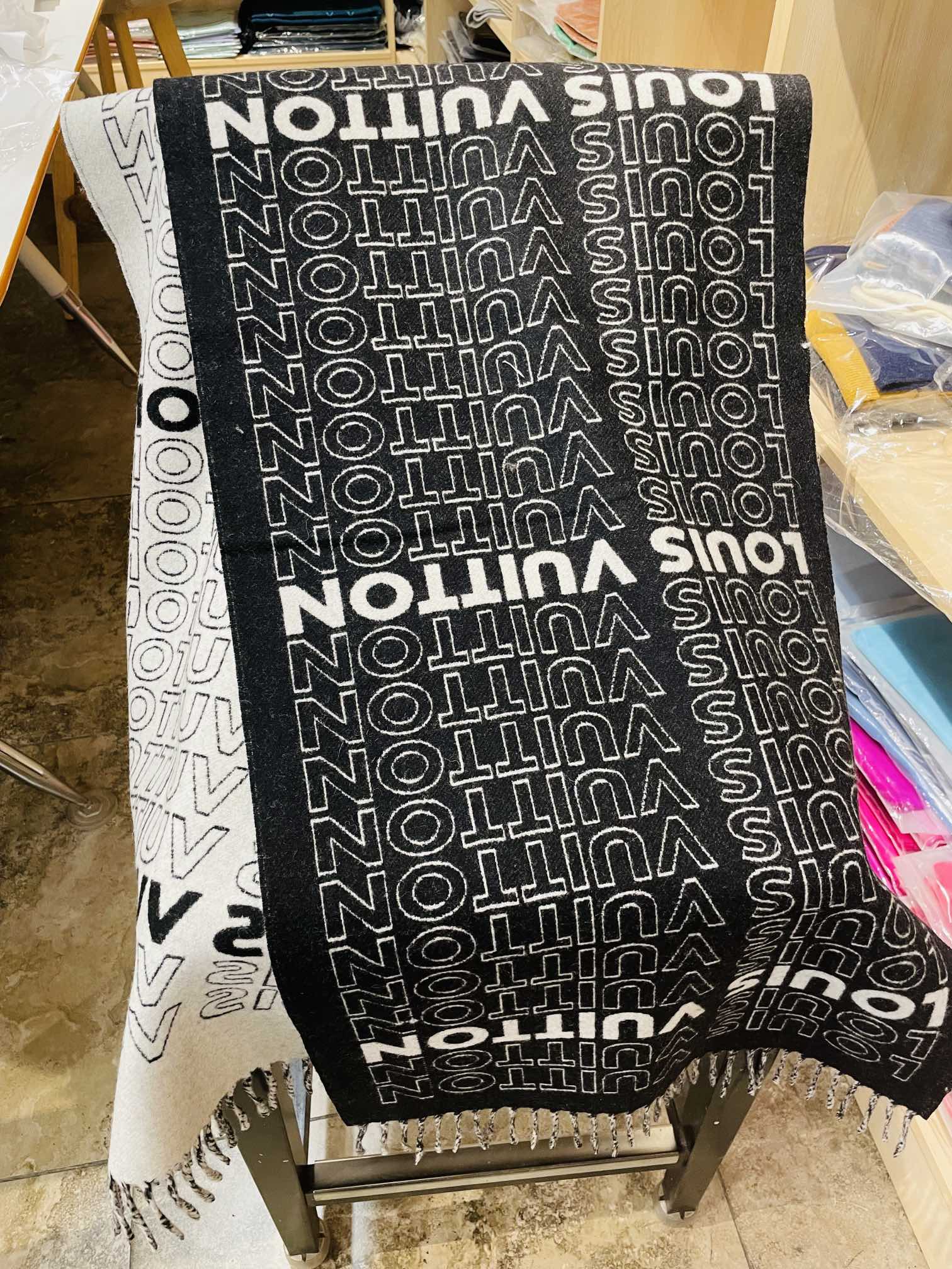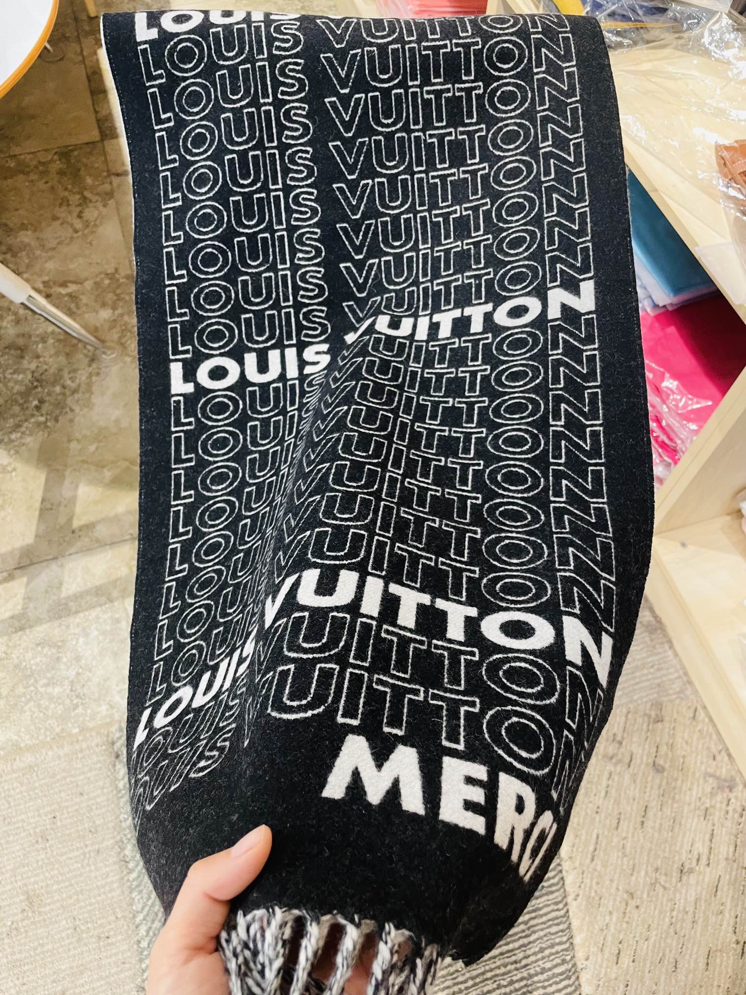 这款围巾是AAAAA 1:1 质量 (非常棒). 使用了和原版一模一样的材料. 商标部分也保持了和路易威登/Louis Vuitton一样. 图片拍摄是实物围巾拍摄, 您所收到的实物保证和我们图片一模一样.