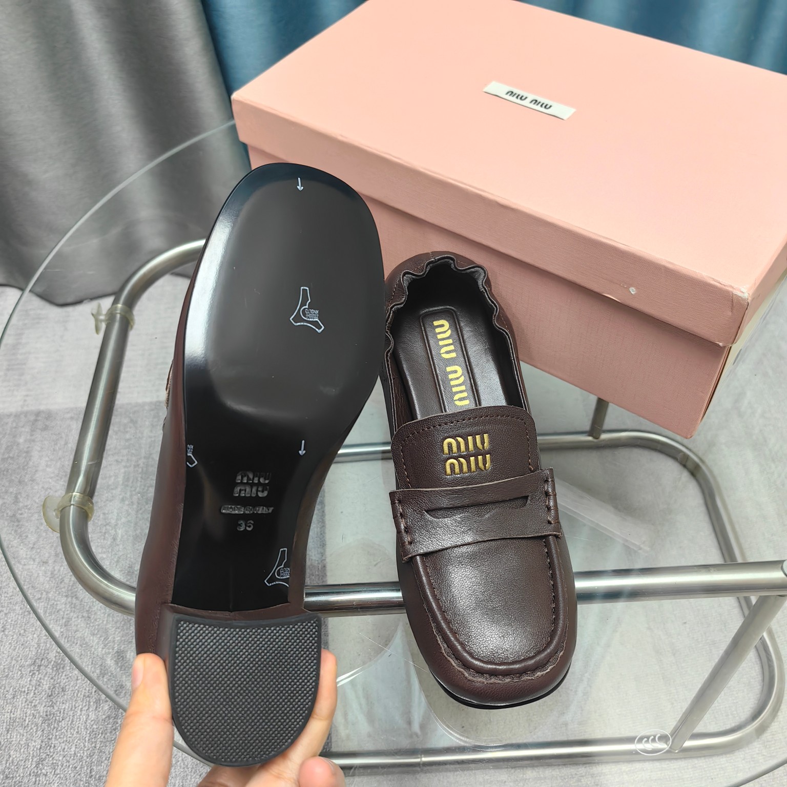这款鞋子是AAAAA 1:1 质量 (非常棒). 使用了和原版一模一样的材料. 商标部分也保持了和缪缪/Miu Miu一样. 图片拍摄是实物鞋子拍摄, 您所收到的实物保证和我们图片一模一样.