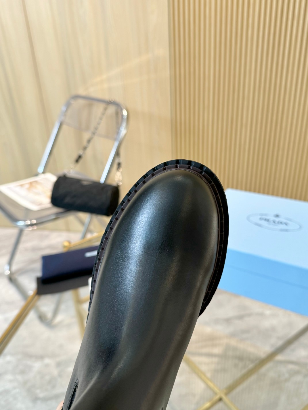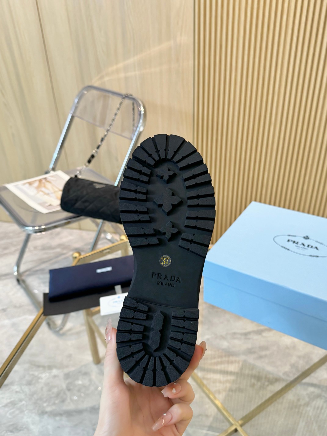 这款鞋子是AAAAA 1:1 质量 (非常棒). 使用了和原版一模一样的材料. 商标部分也保持了和普拉达/Prada一样. 图片拍摄是实物鞋子拍摄, 您所收到的实物保证和我们图片一模一样.