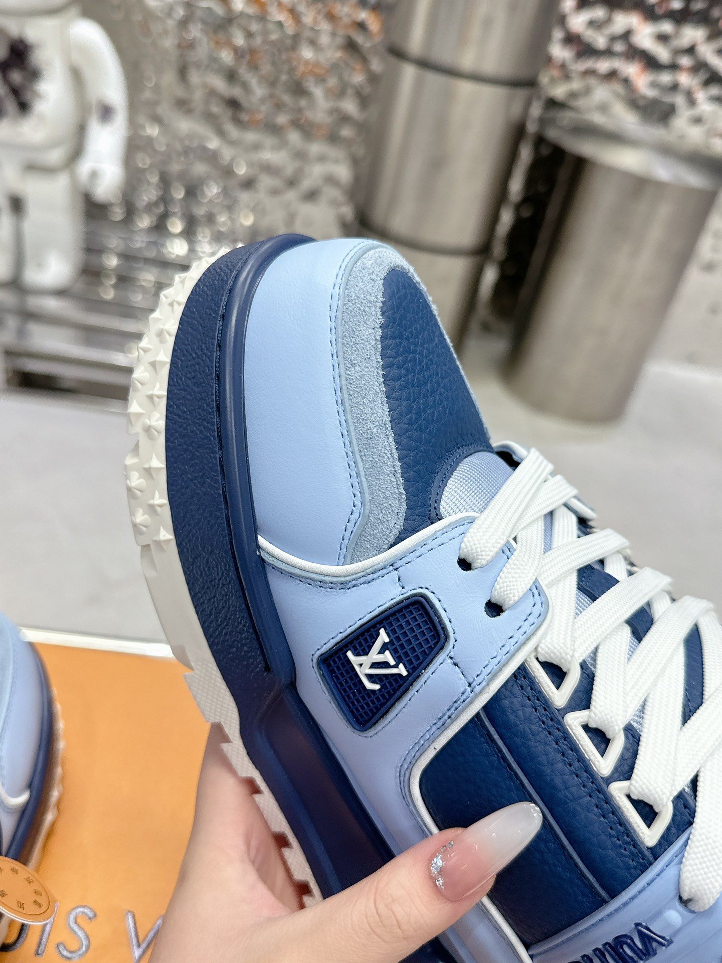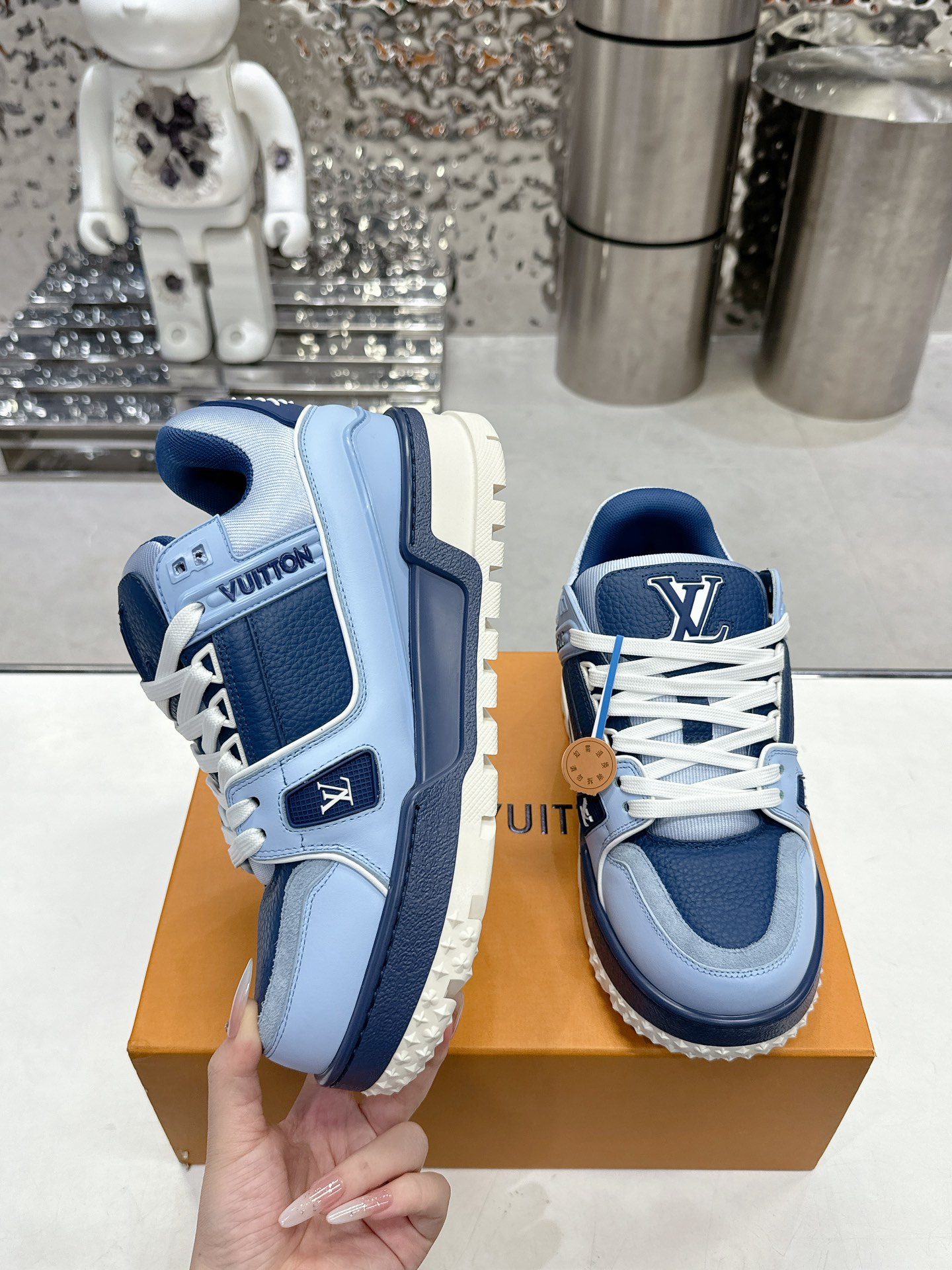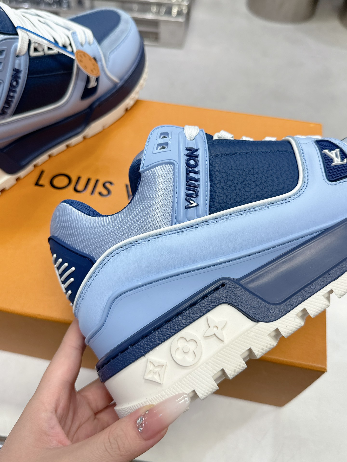 这款鞋子是AAAAA 1:1 质量 (非常棒). 使用了和原版一模一样的材料. 商标部分也保持了和路易威登/Louis Vuitton一样. 图片拍摄是实物鞋子拍摄, 您所收到的实物保证和我们图片一模一样.