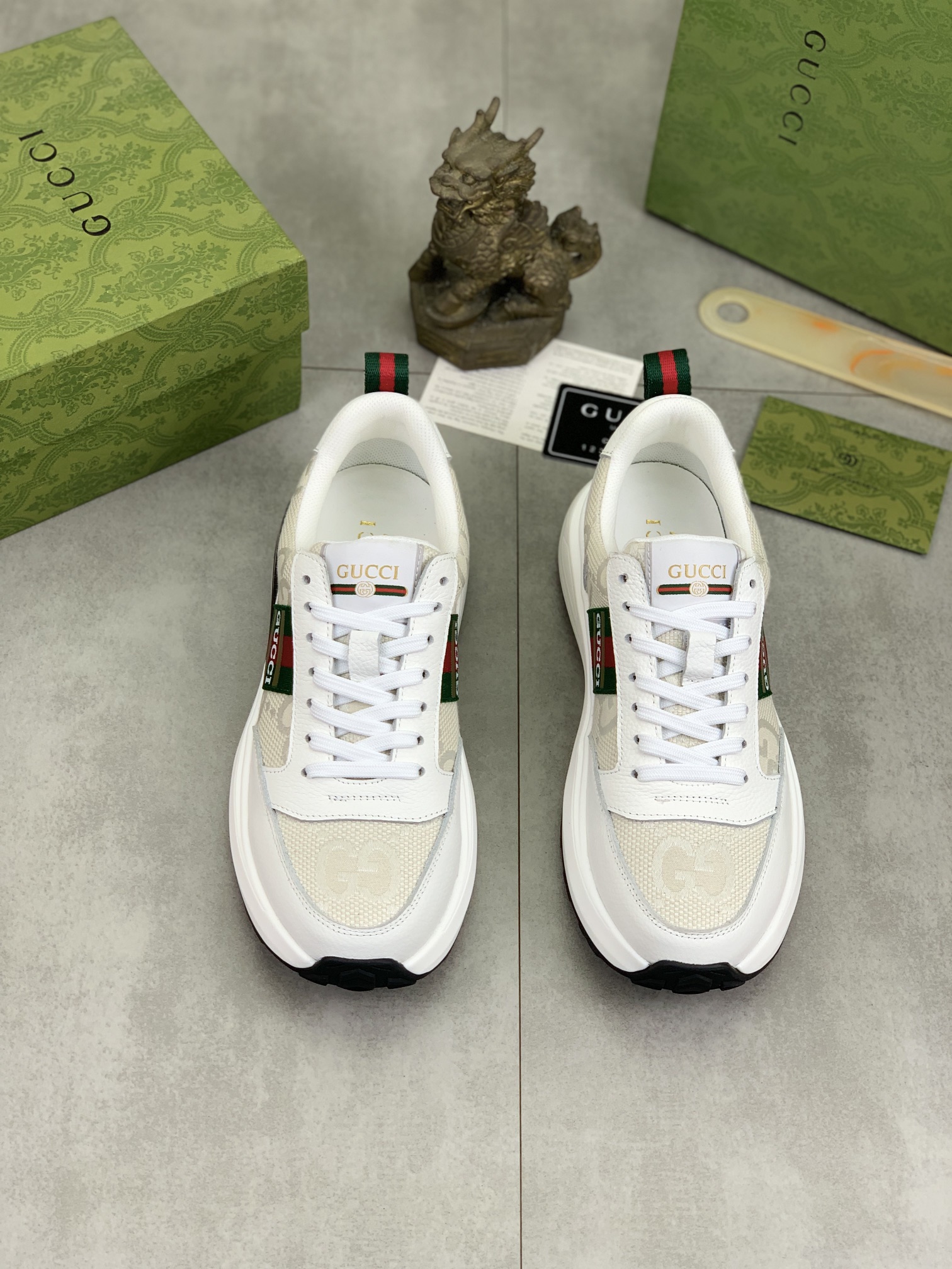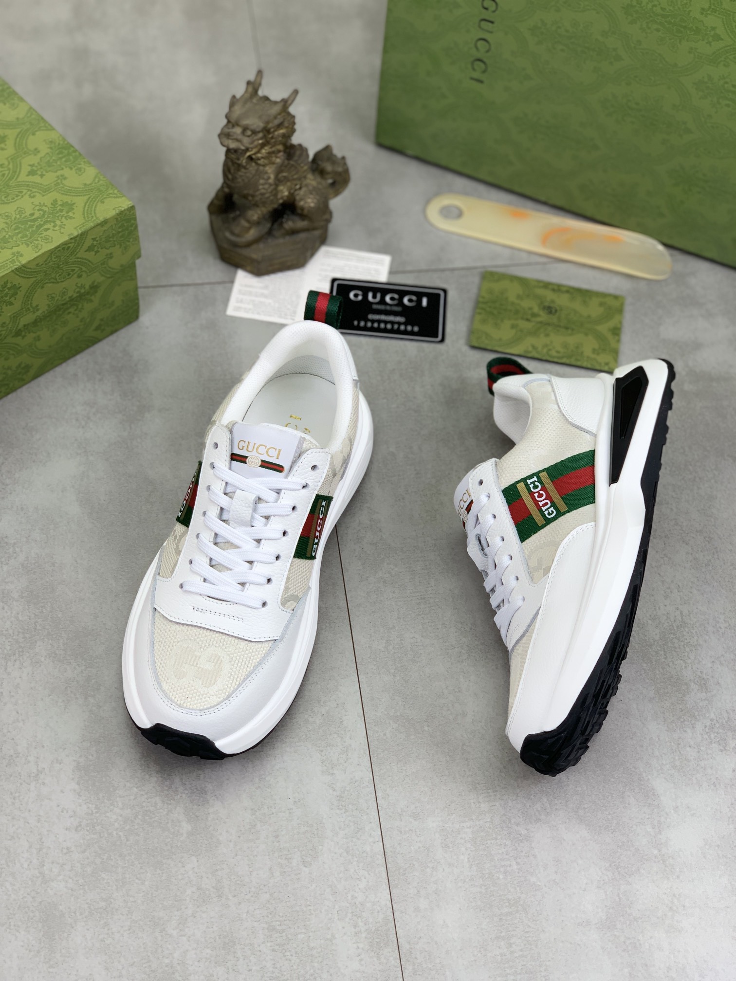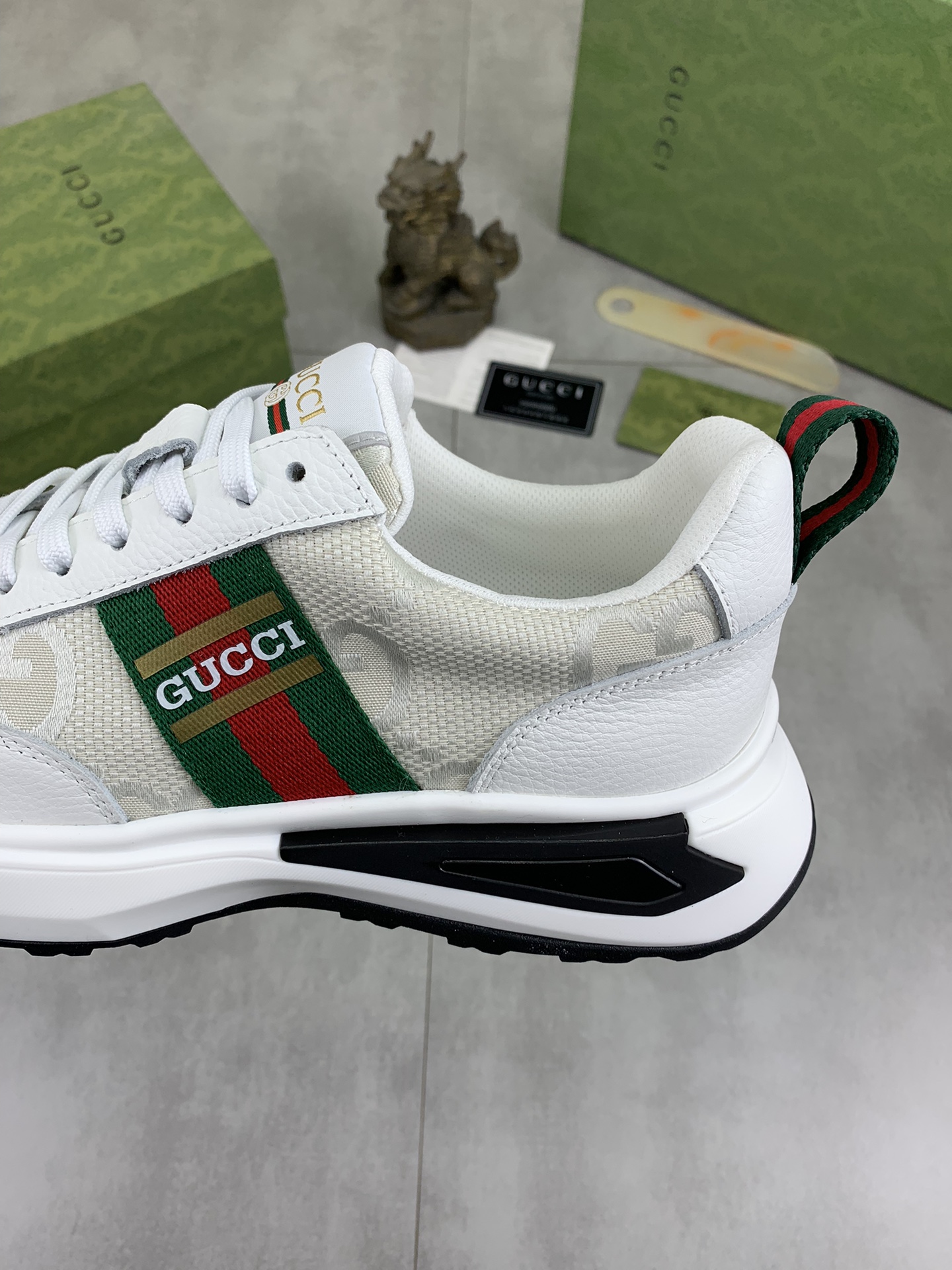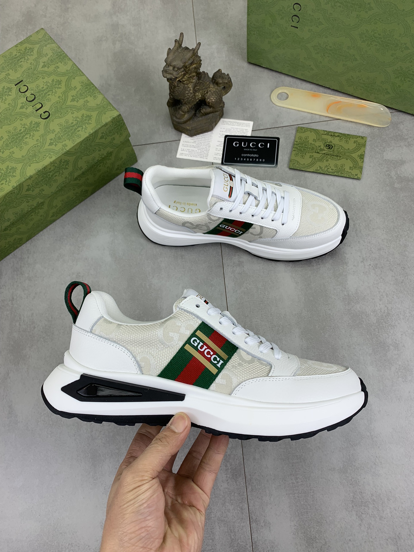 这款鞋子是AAAAA 1:1 质量 (非常棒). 使用了和原版一模一样的材料. 商标部分也保持了和古奇/Gucci一样. 图片拍摄是实物鞋子拍摄, 您所收到的实物保证和我们图片一模一样.