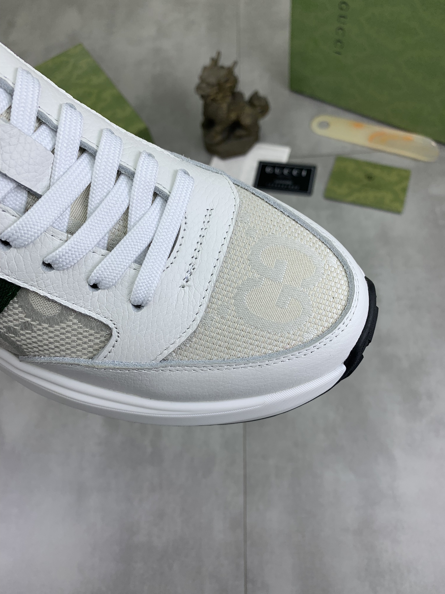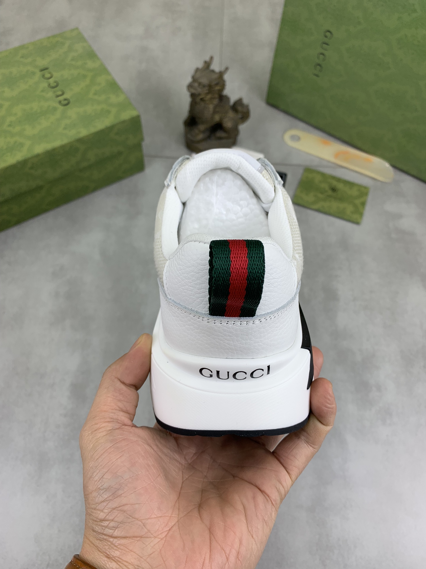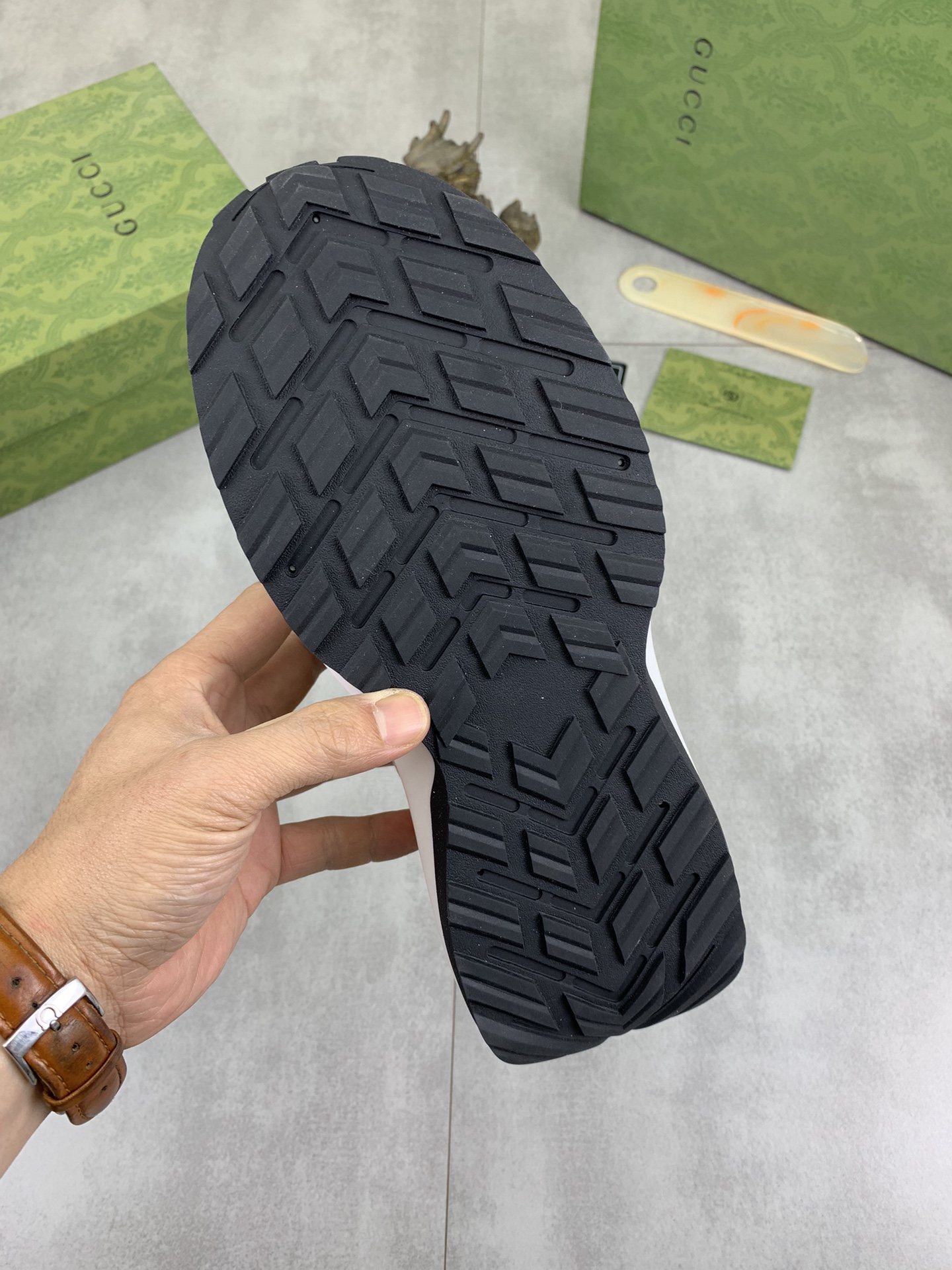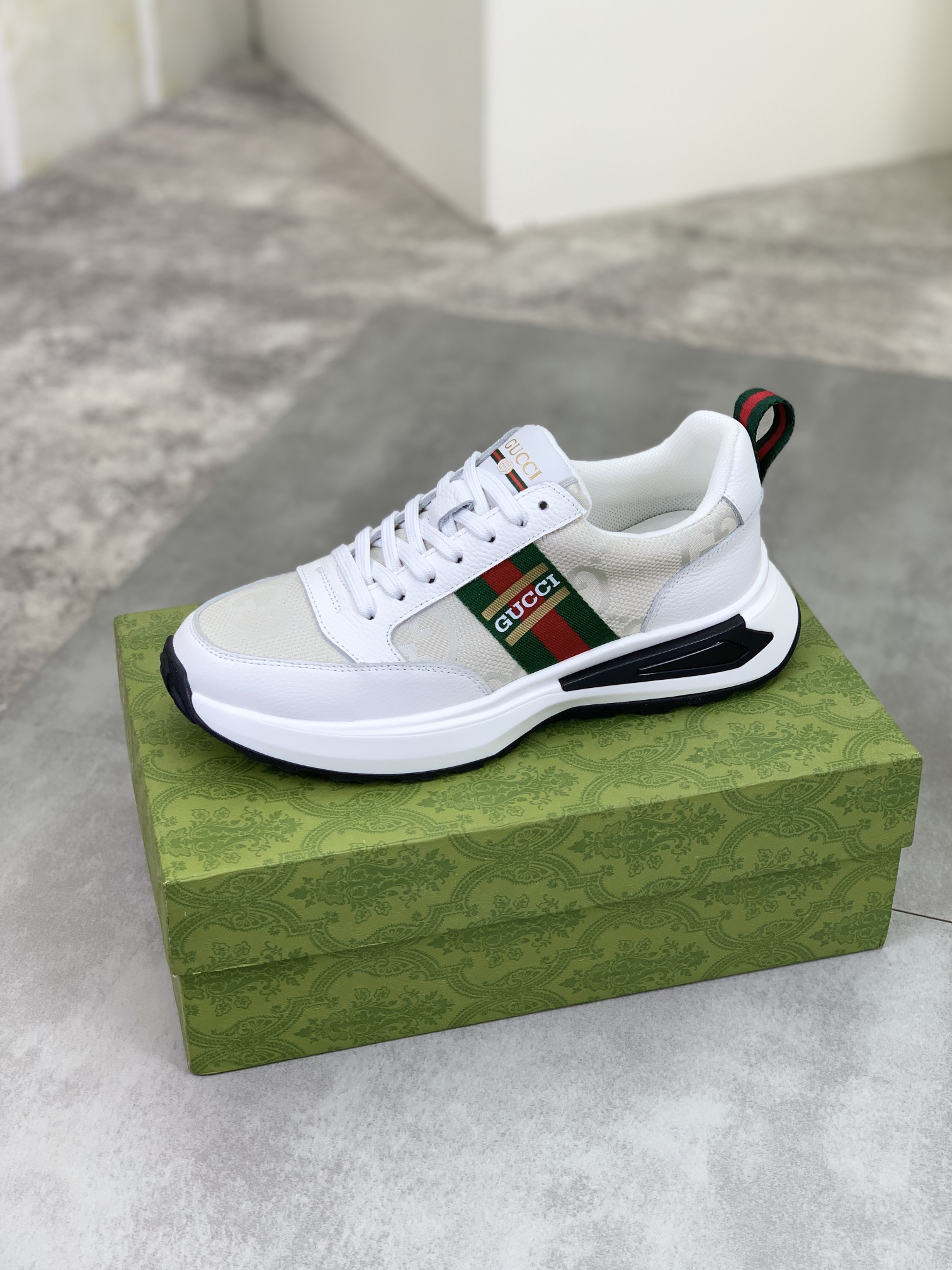 这款鞋子是AAAAA 1:1 质量 (非常棒). 使用了和原版一模一样的材料. 商标部分也保持了和古奇/Gucci一样. 图片拍摄是实物鞋子拍摄, 您所收到的实物保证和我们图片一模一样.