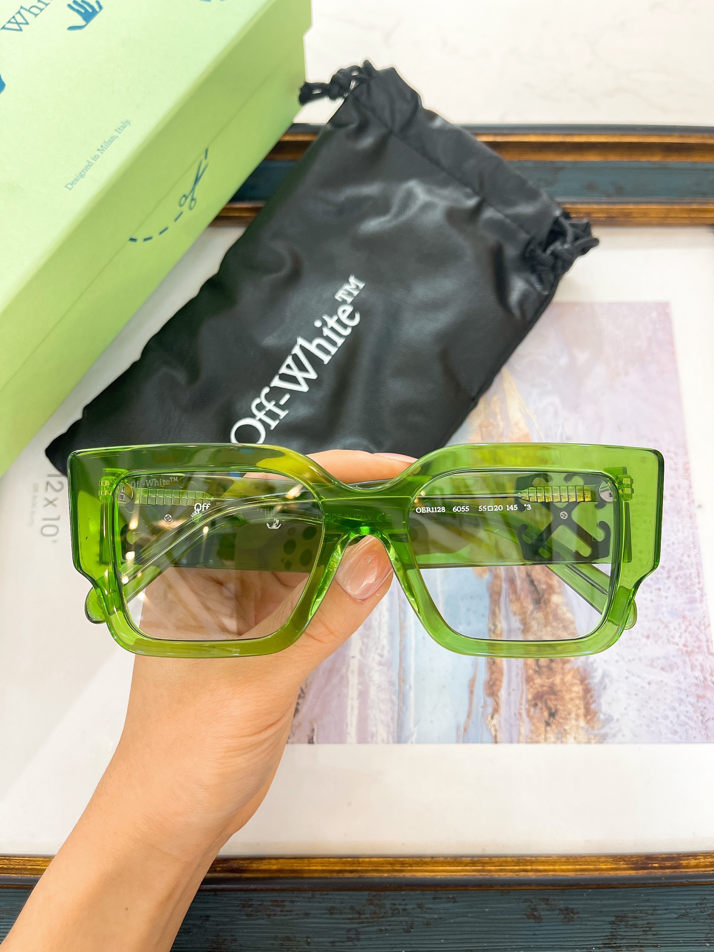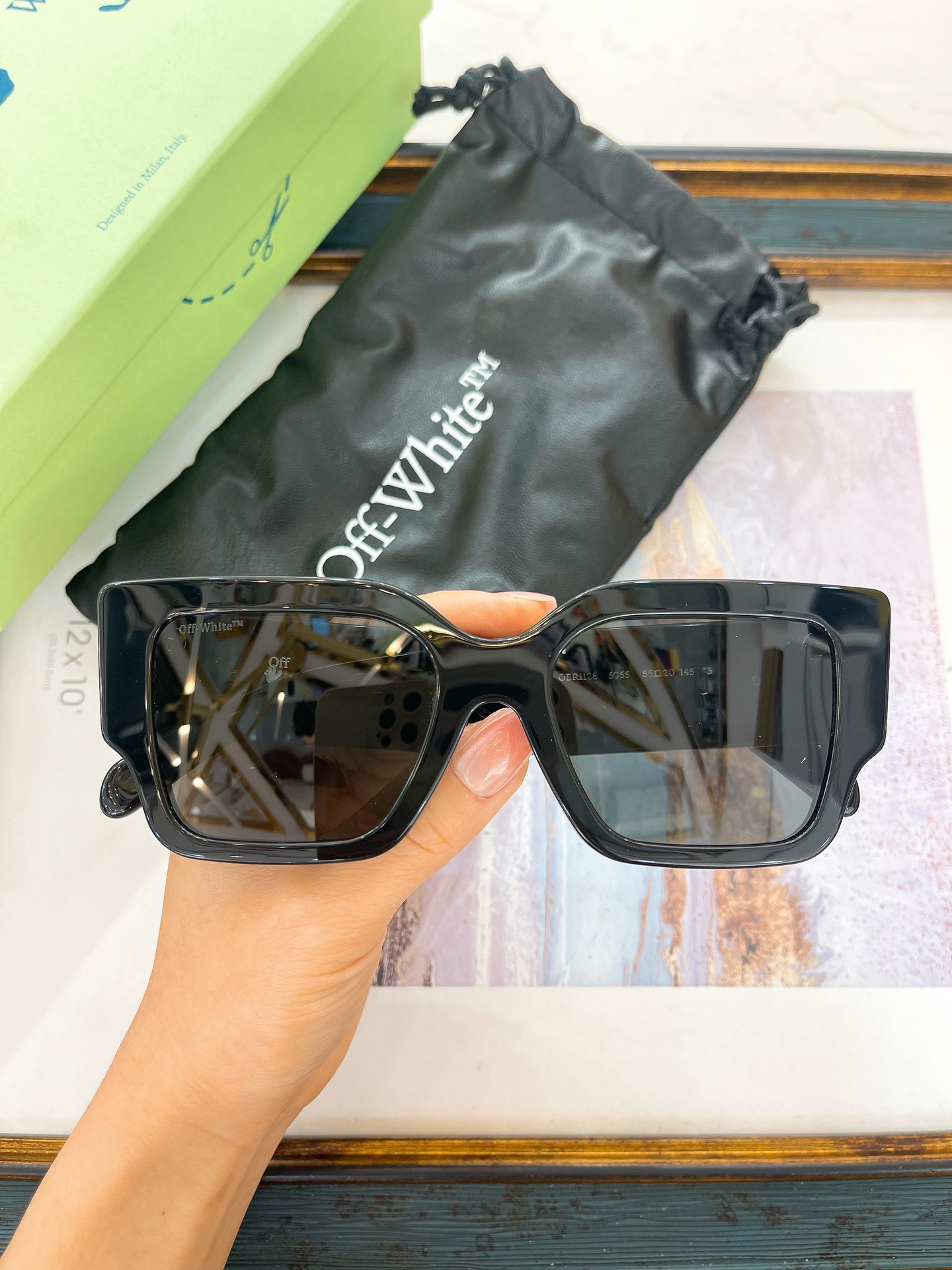 这款太阳眼镜是AAAAA 1:1 质量 (非常棒). 使用了和原版一模一样的材料. 商标部分也保持了和OFF WHITE一样. 图片拍摄是实物太阳眼镜拍摄, 您所收到的实物保证和我们图片一模一样.