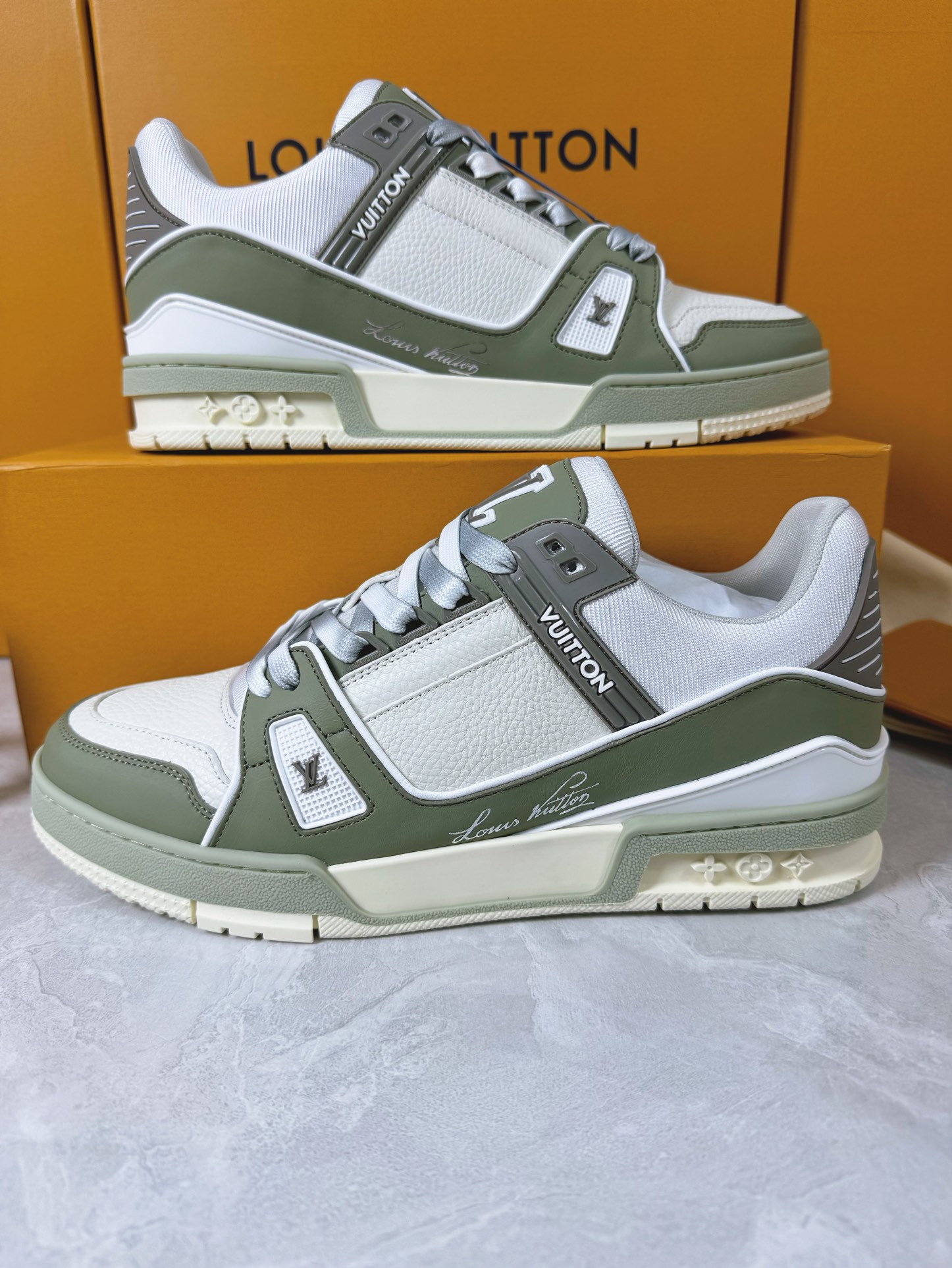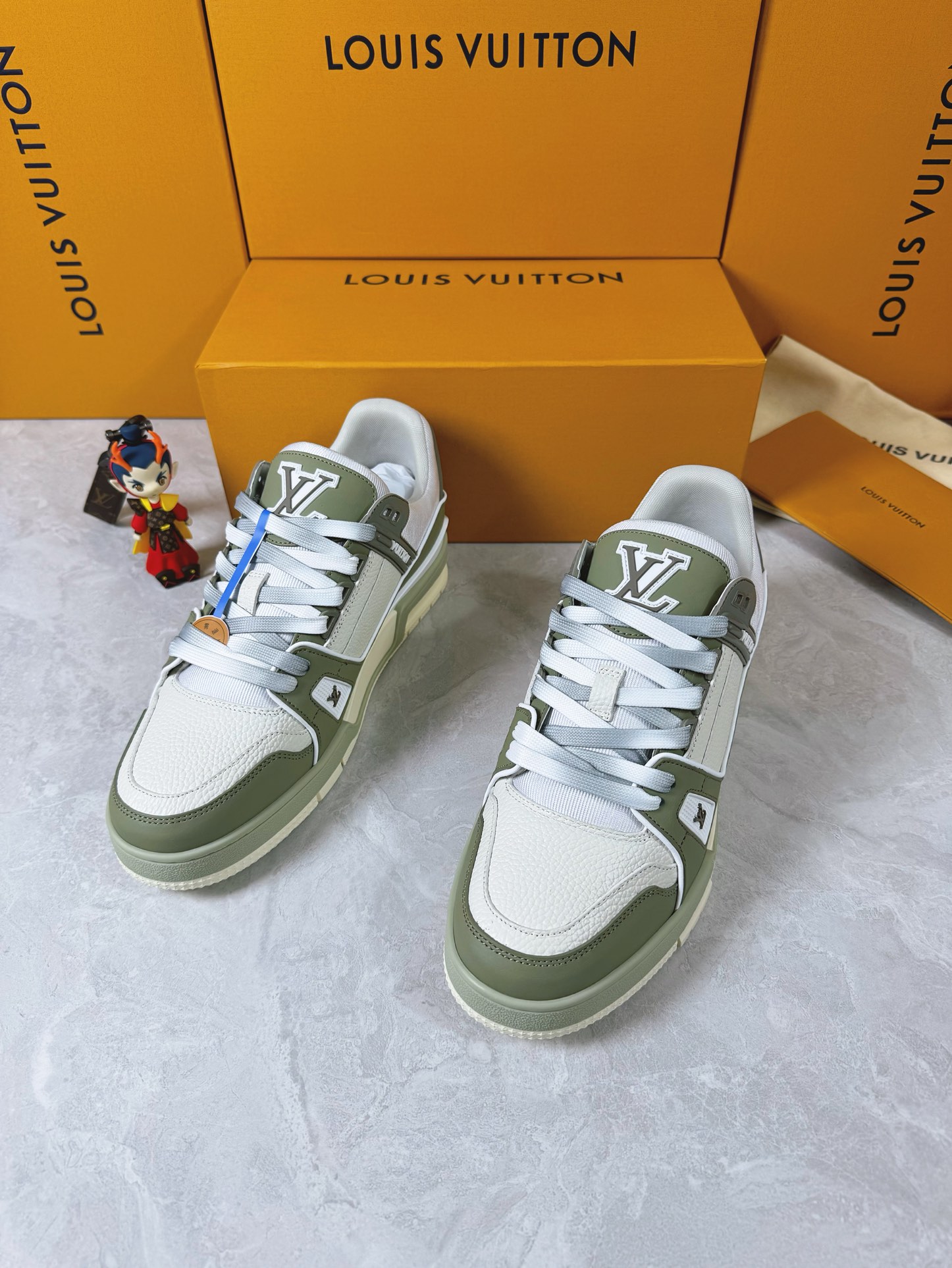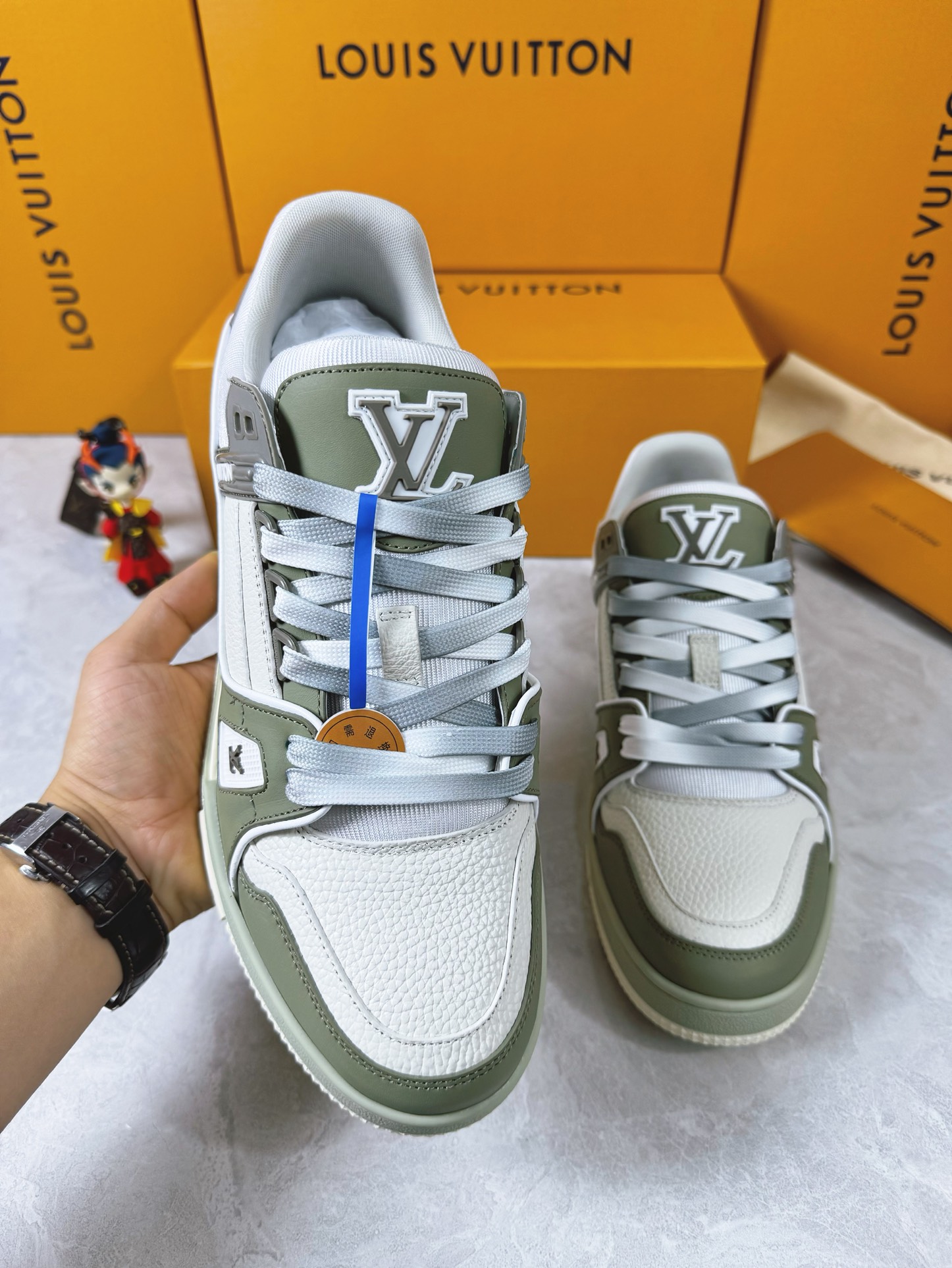 这款鞋子是AAAAA 1:1 质量 (非常棒). 使用了和原版一模一样的材料. 商标部分也保持了和路易威登/Louis Vuitton一样. 图片拍摄是实物鞋子拍摄, 您所收到的实物保证和我们图片一模一样.