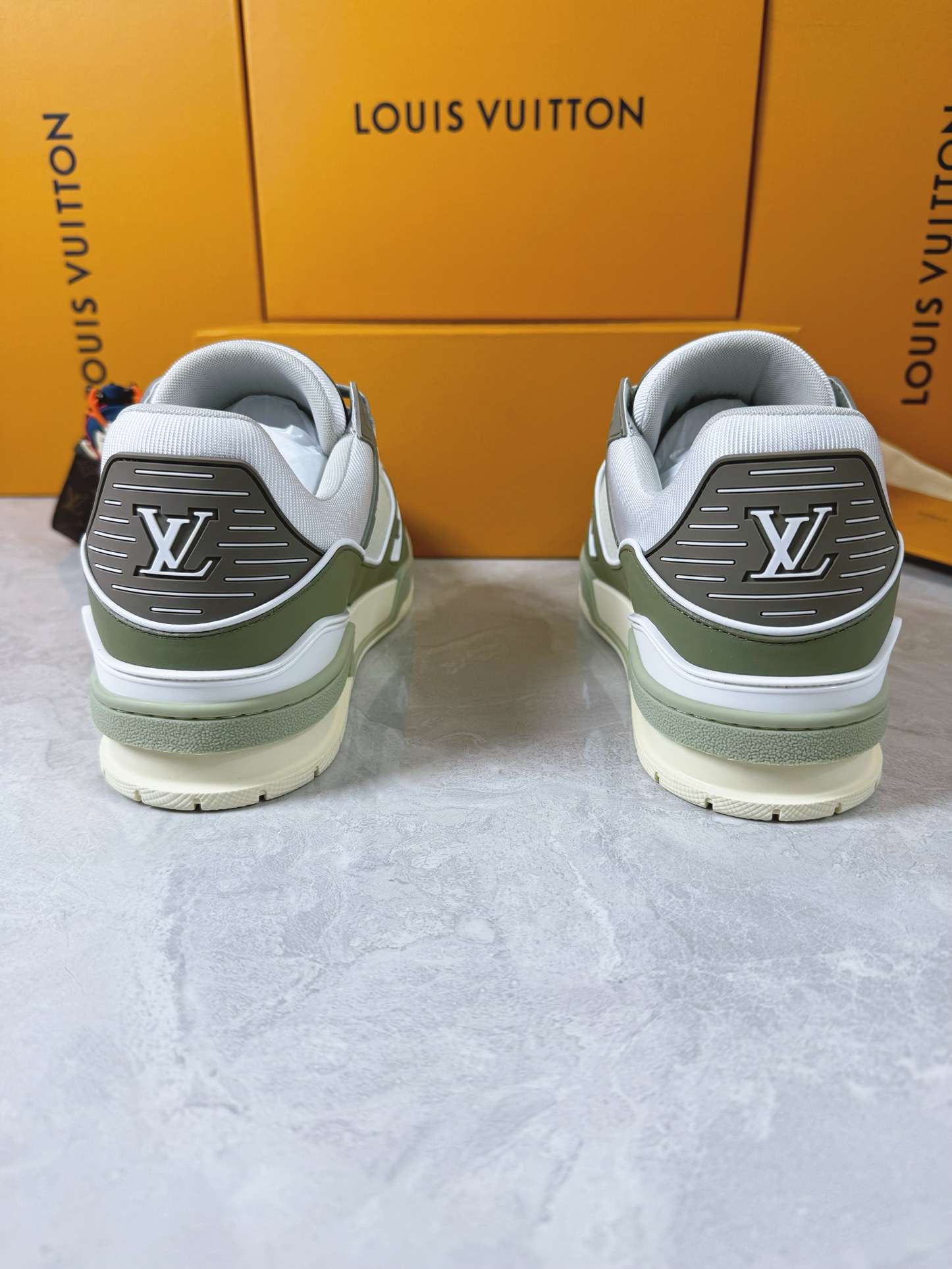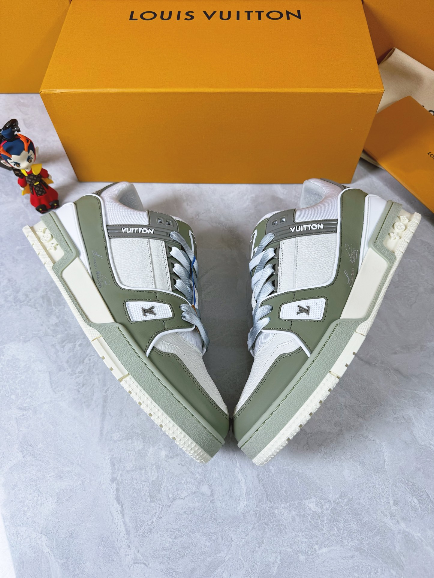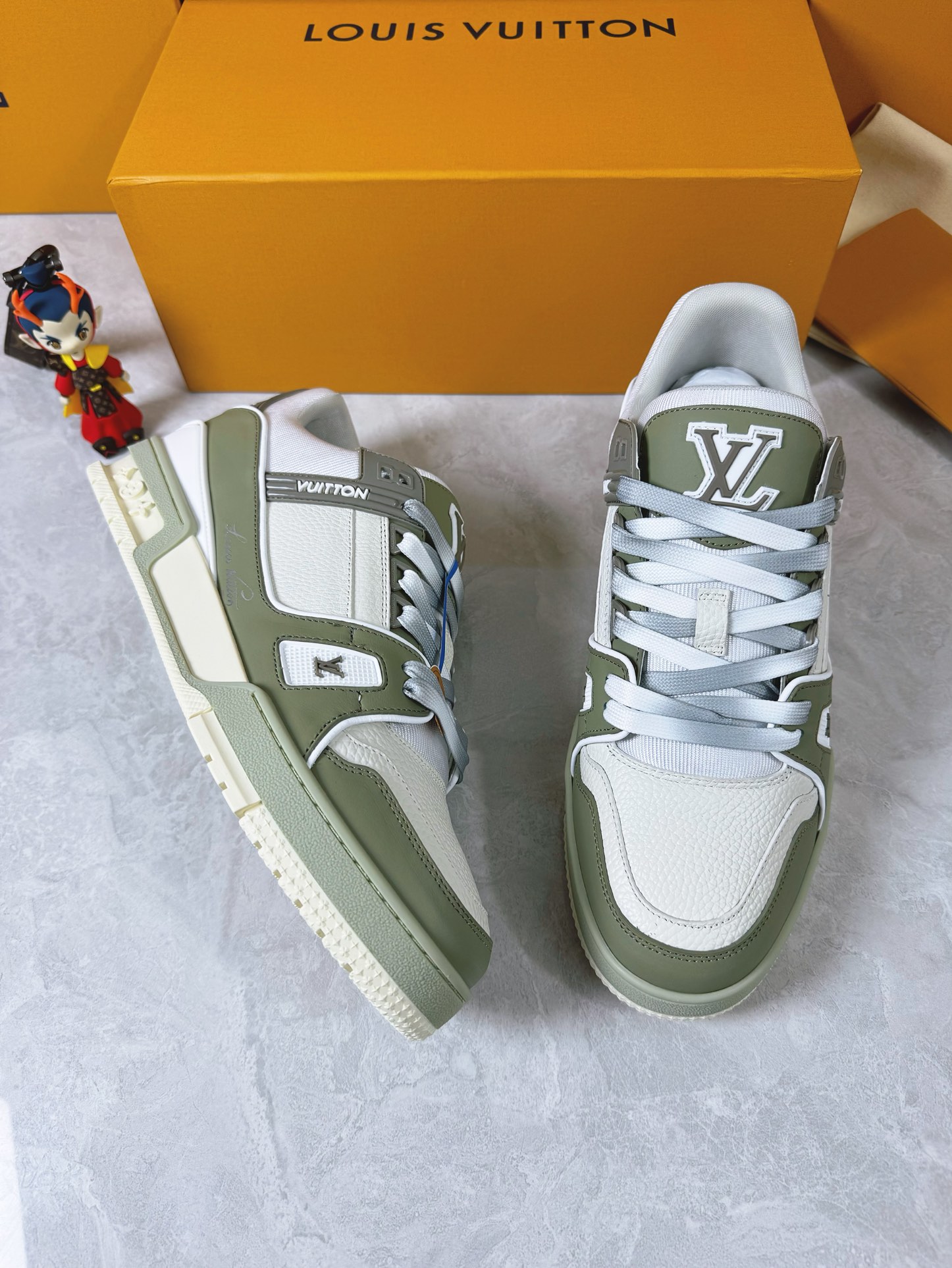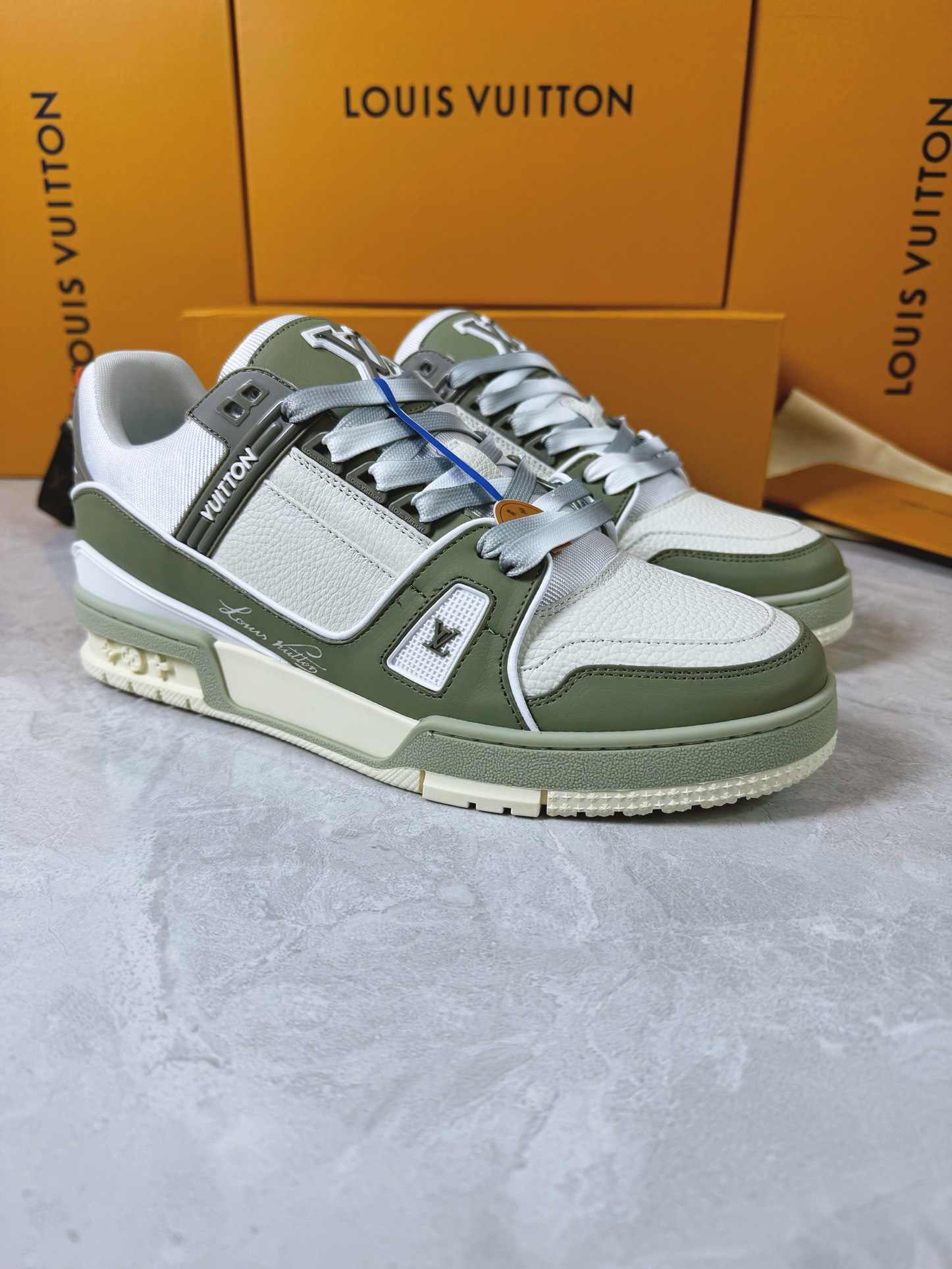 这款鞋子是AAAAA 1:1 质量 (非常棒). 使用了和原版一模一样的材料. 商标部分也保持了和路易威登/Louis Vuitton一样. 图片拍摄是实物鞋子拍摄, 您所收到的实物保证和我们图片一模一样.