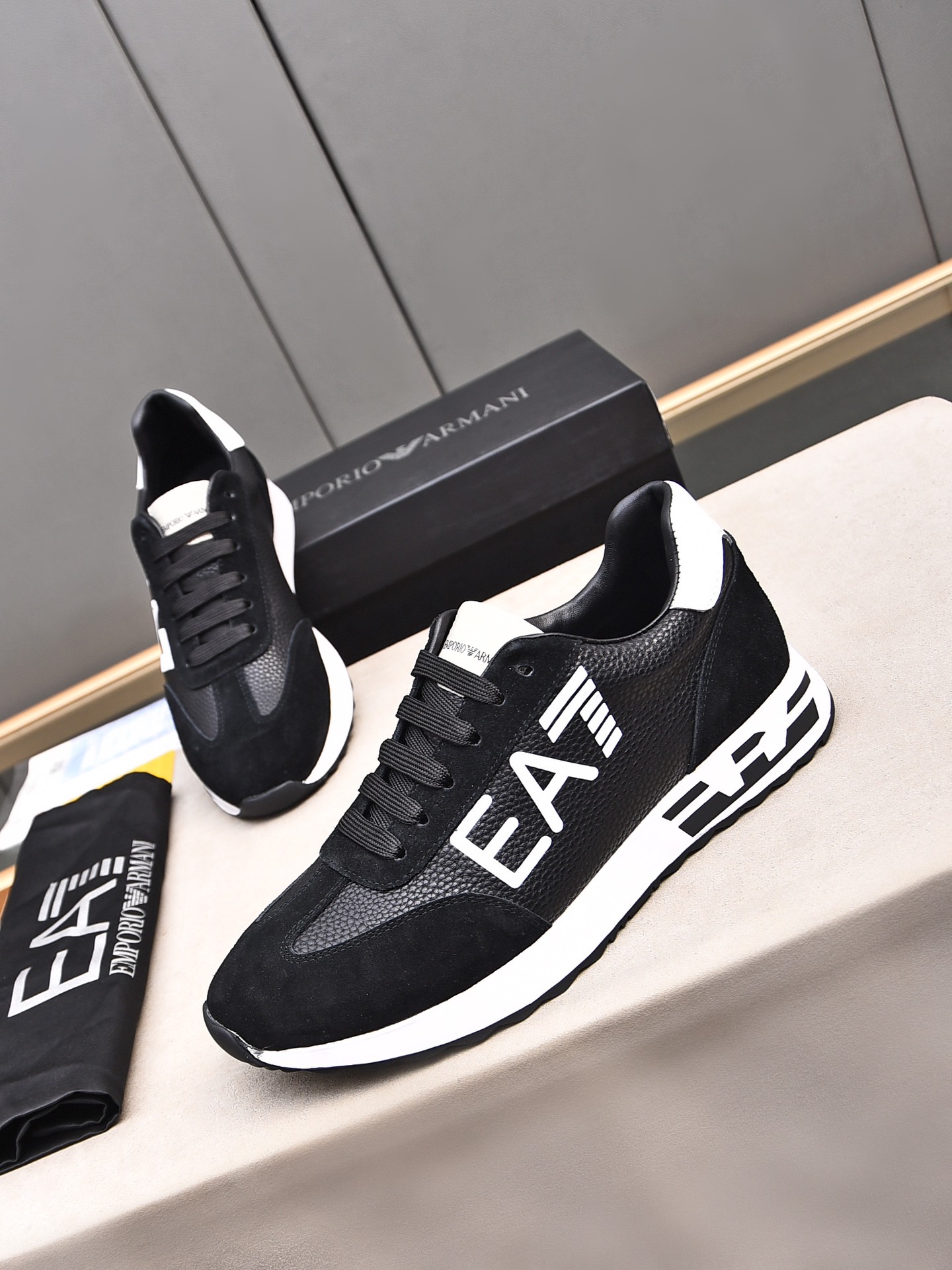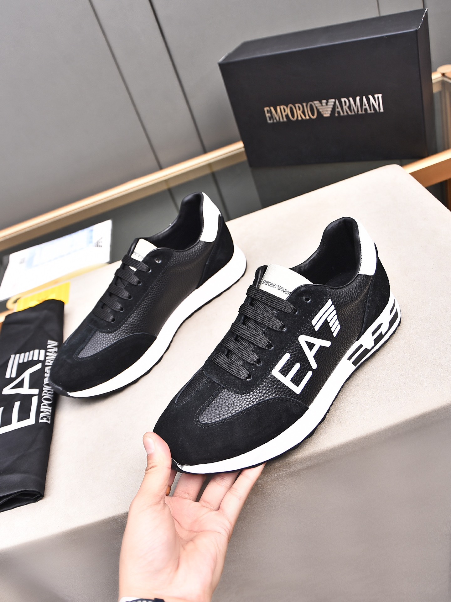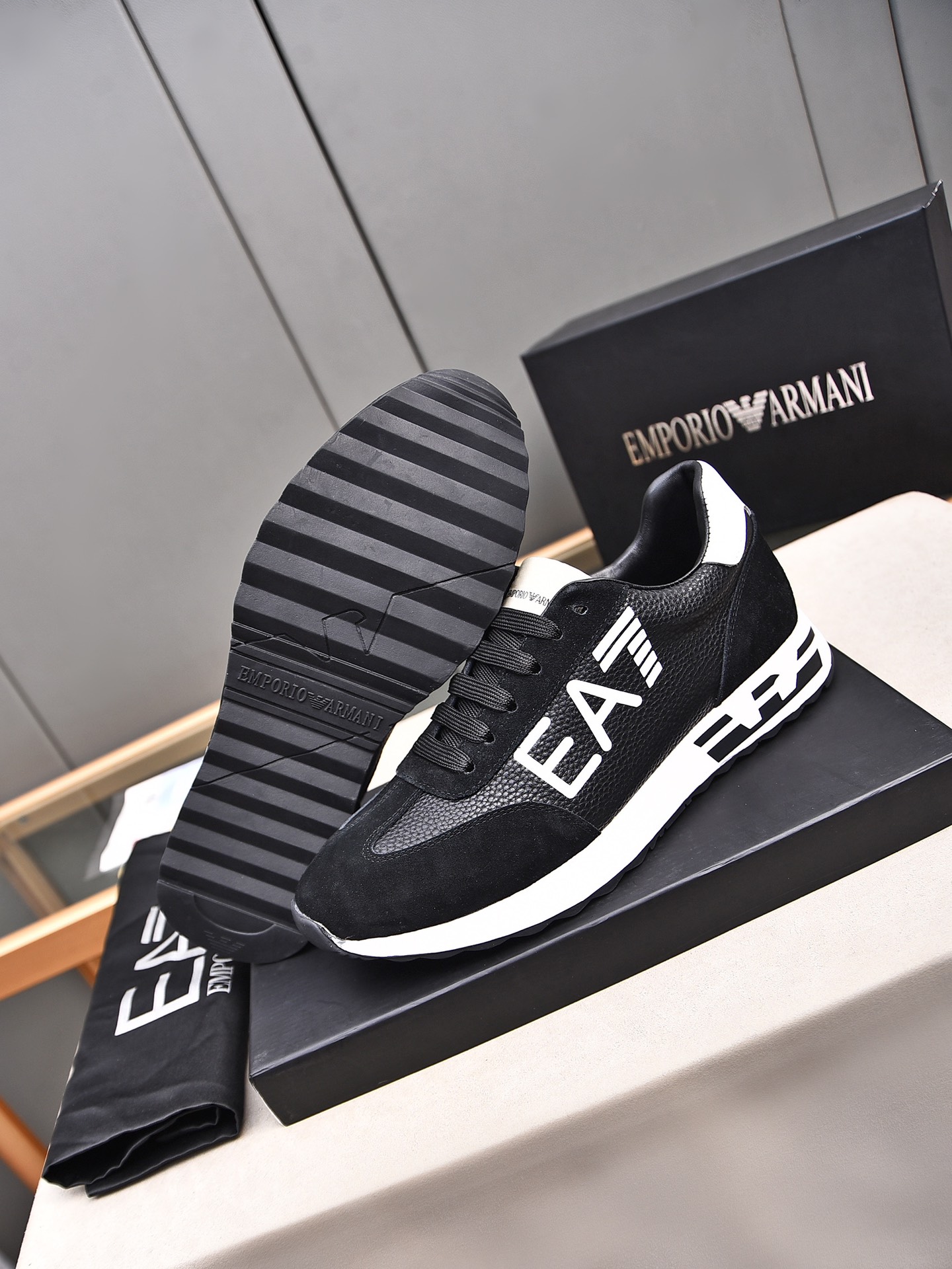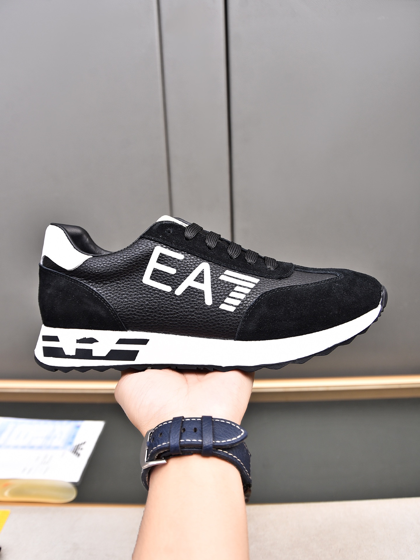 这款鞋子是AAAAA 1:1 质量 (非常棒). 使用了和原版一模一样的材料. 商标部分也保持了和阿玛尼/Armani一样. 图片拍摄是实物鞋子拍摄, 您所收到的实物保证和我们图片一模一样.
