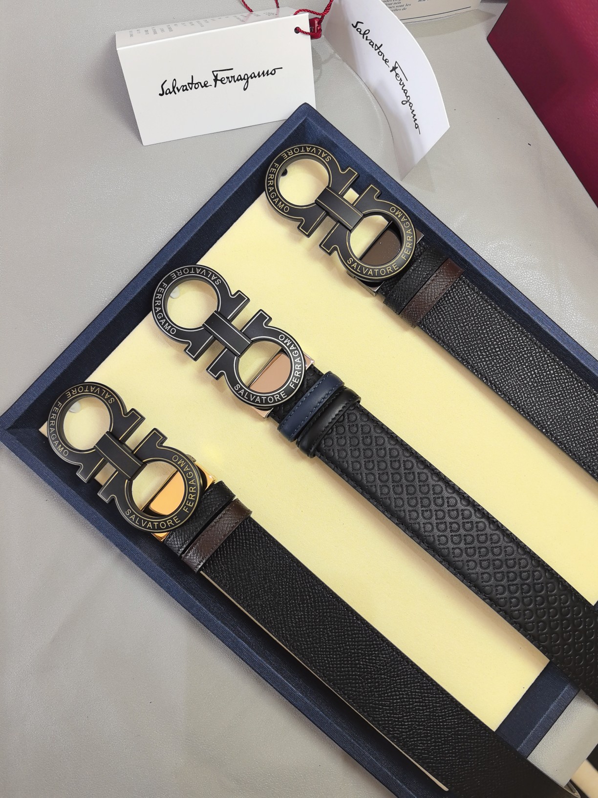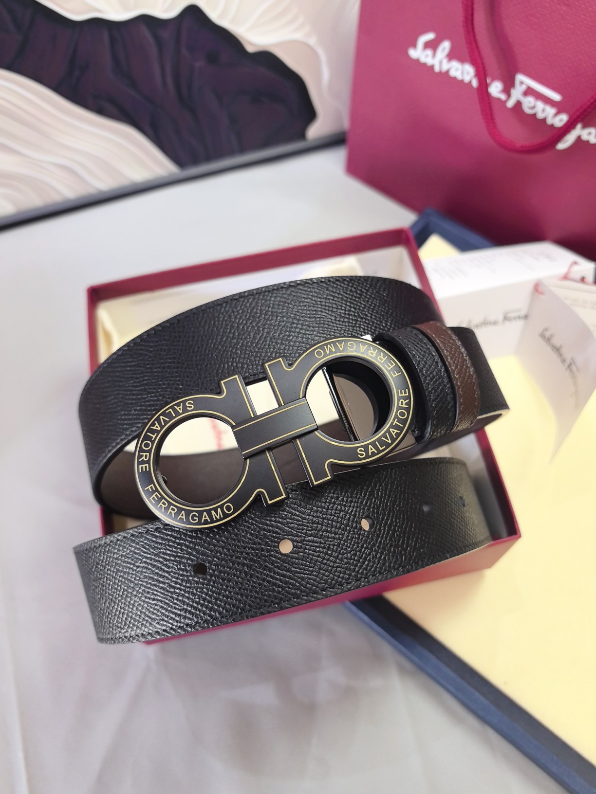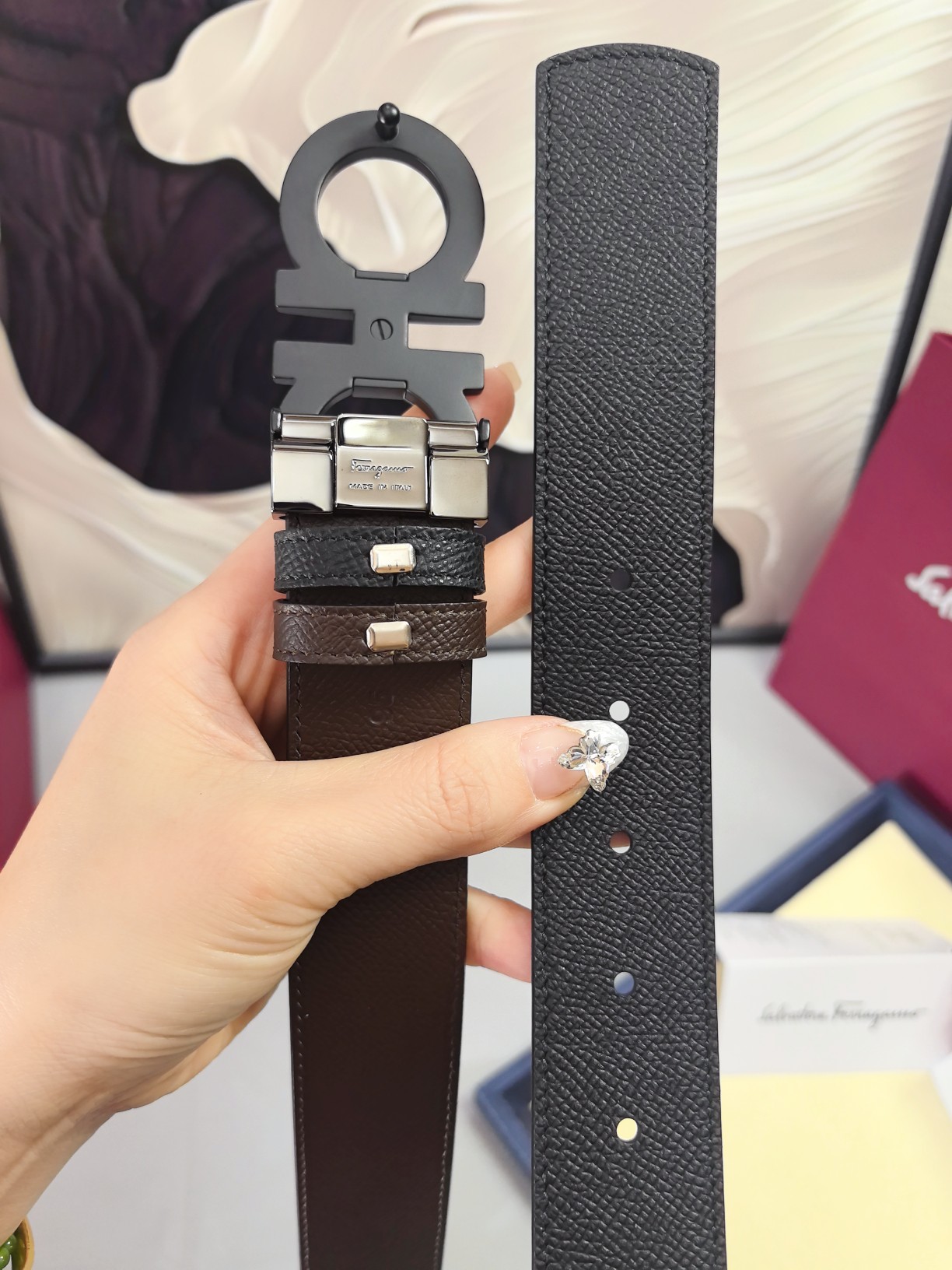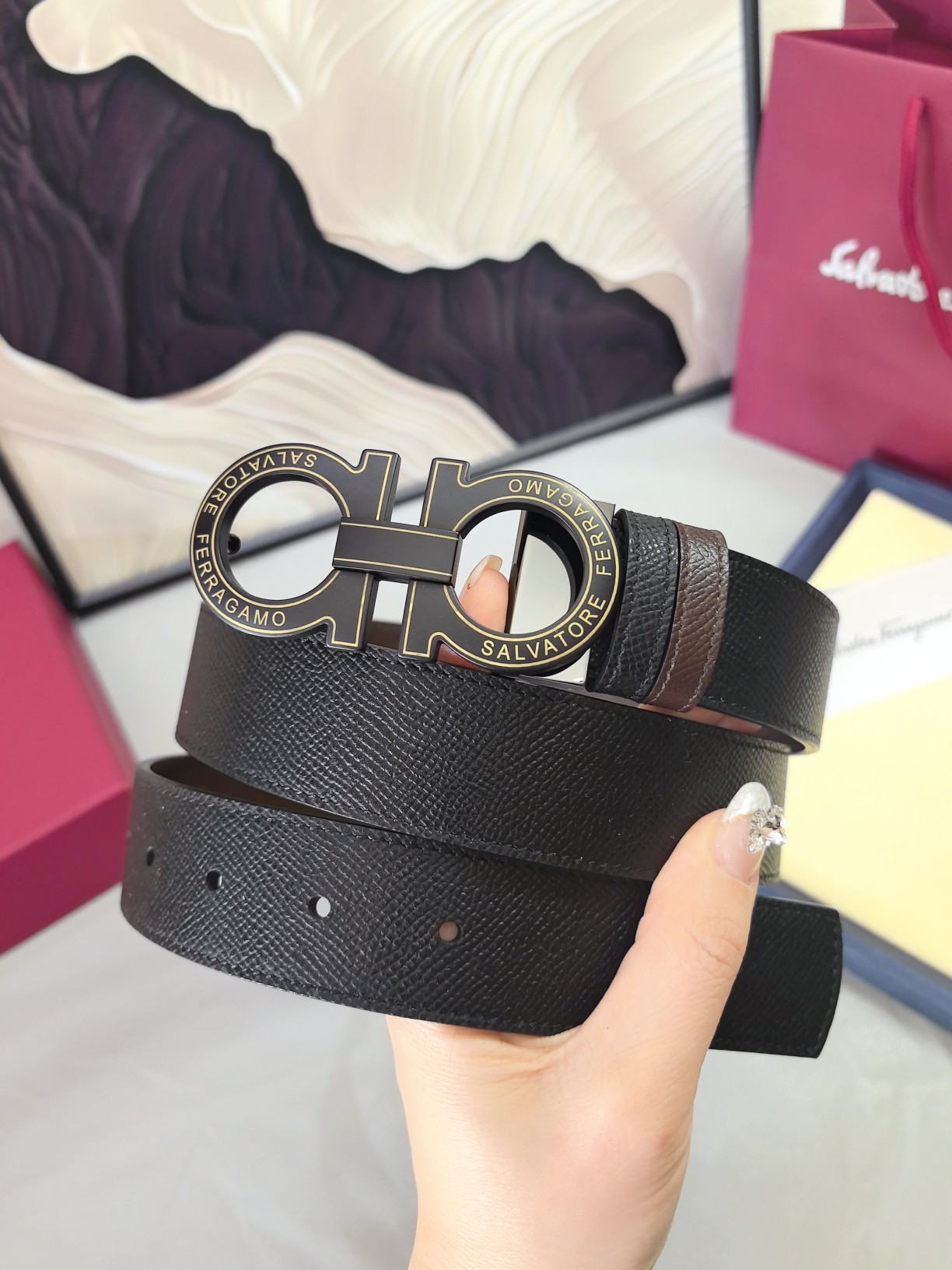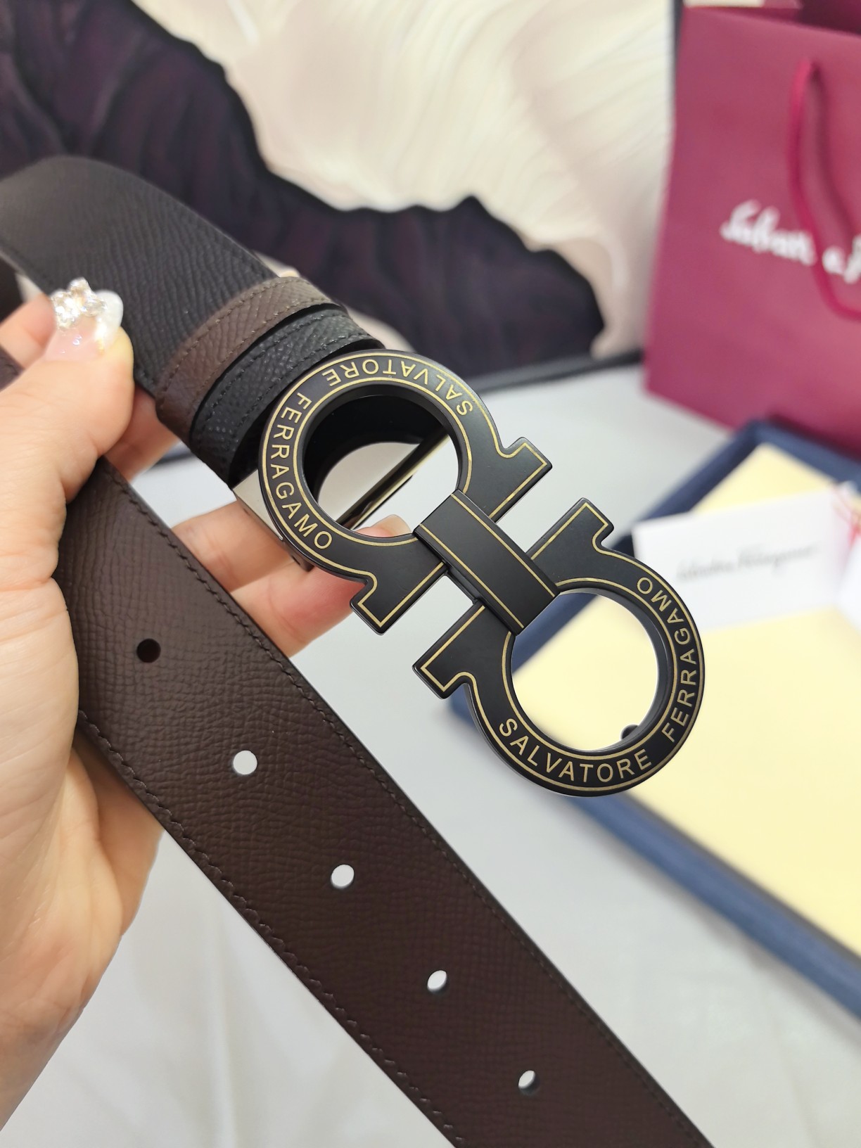 这款皮带是AAAAA 1:1 质量 (非常棒). 使用了和原版一模一样的材料. 商标部分也保持了和菲拉格慕/Salvatore Ferragamo一样. 图片拍摄是实物皮带拍摄, 您所收到的实物保证和我们图片一模一样.