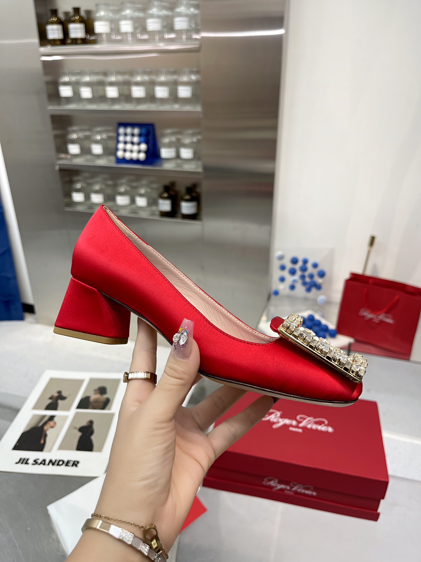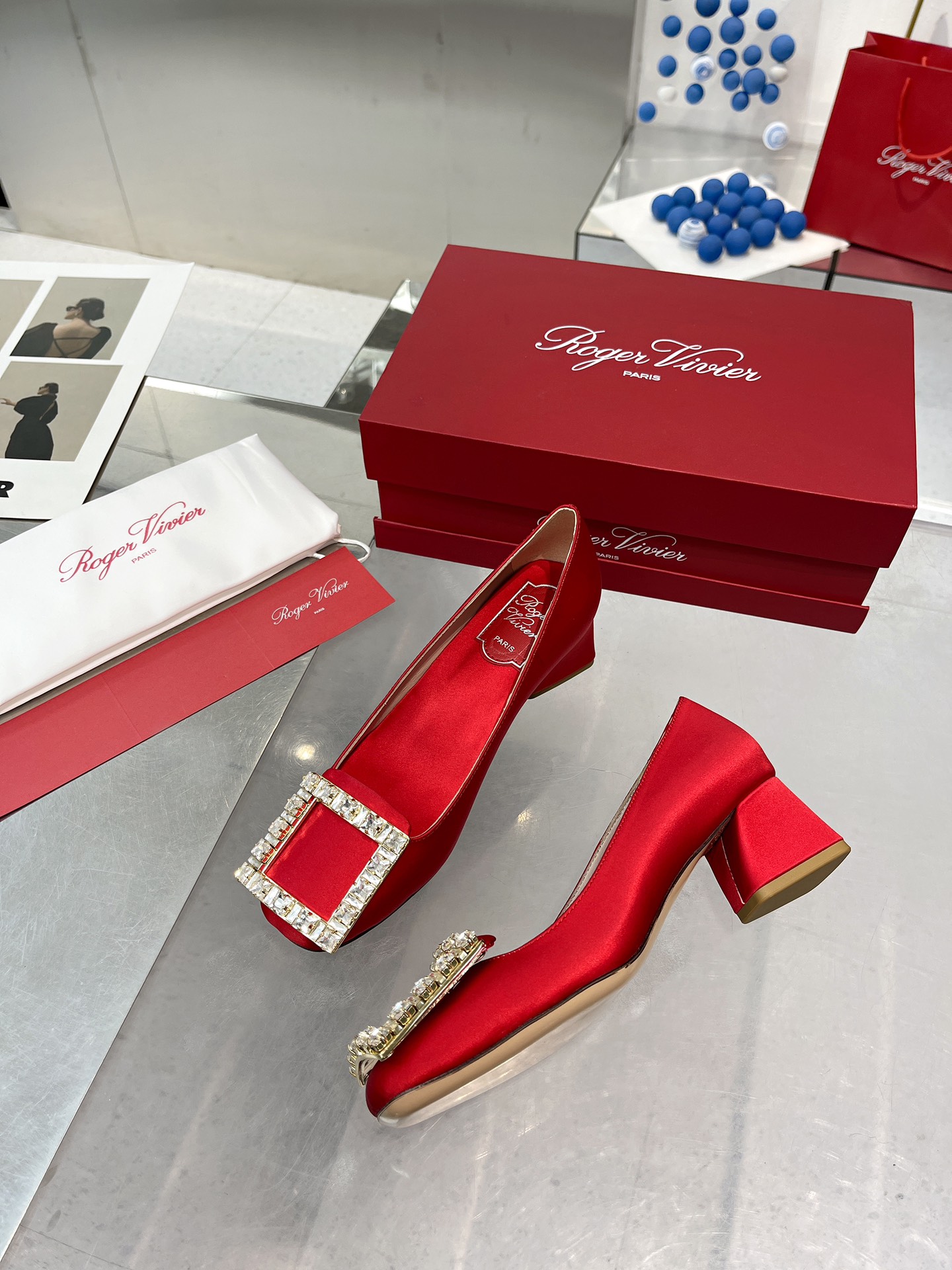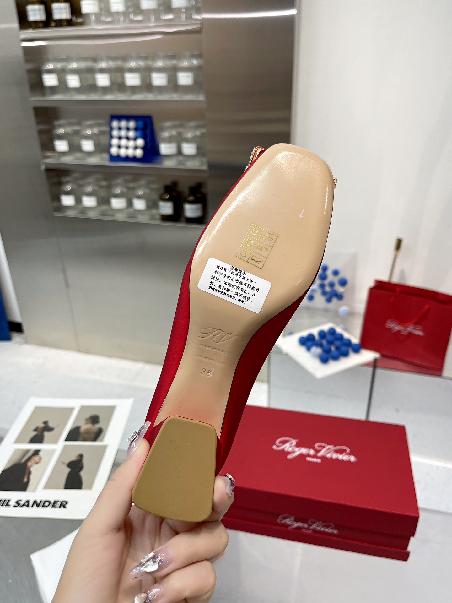 这款鞋子是AAAAA 1:1 质量 (非常棒). 使用了和原版一模一样的材料. 商标部分也保持了和罗杰维维耶/Roger Vivier一样. 图片拍摄是实物鞋子拍摄, 您所收到的实物保证和我们图片一模一样.