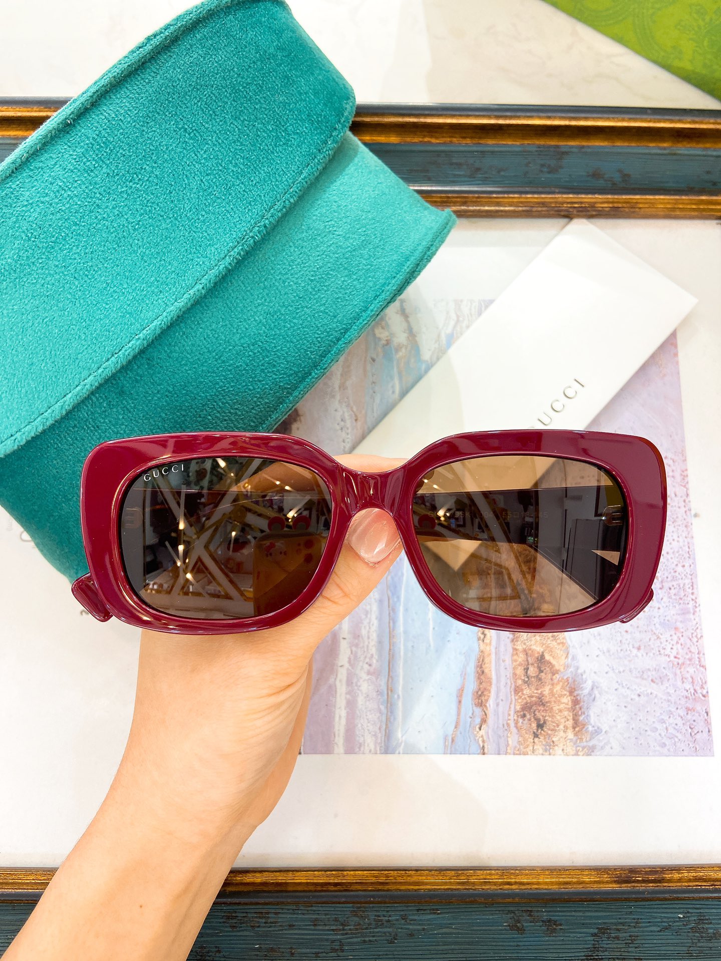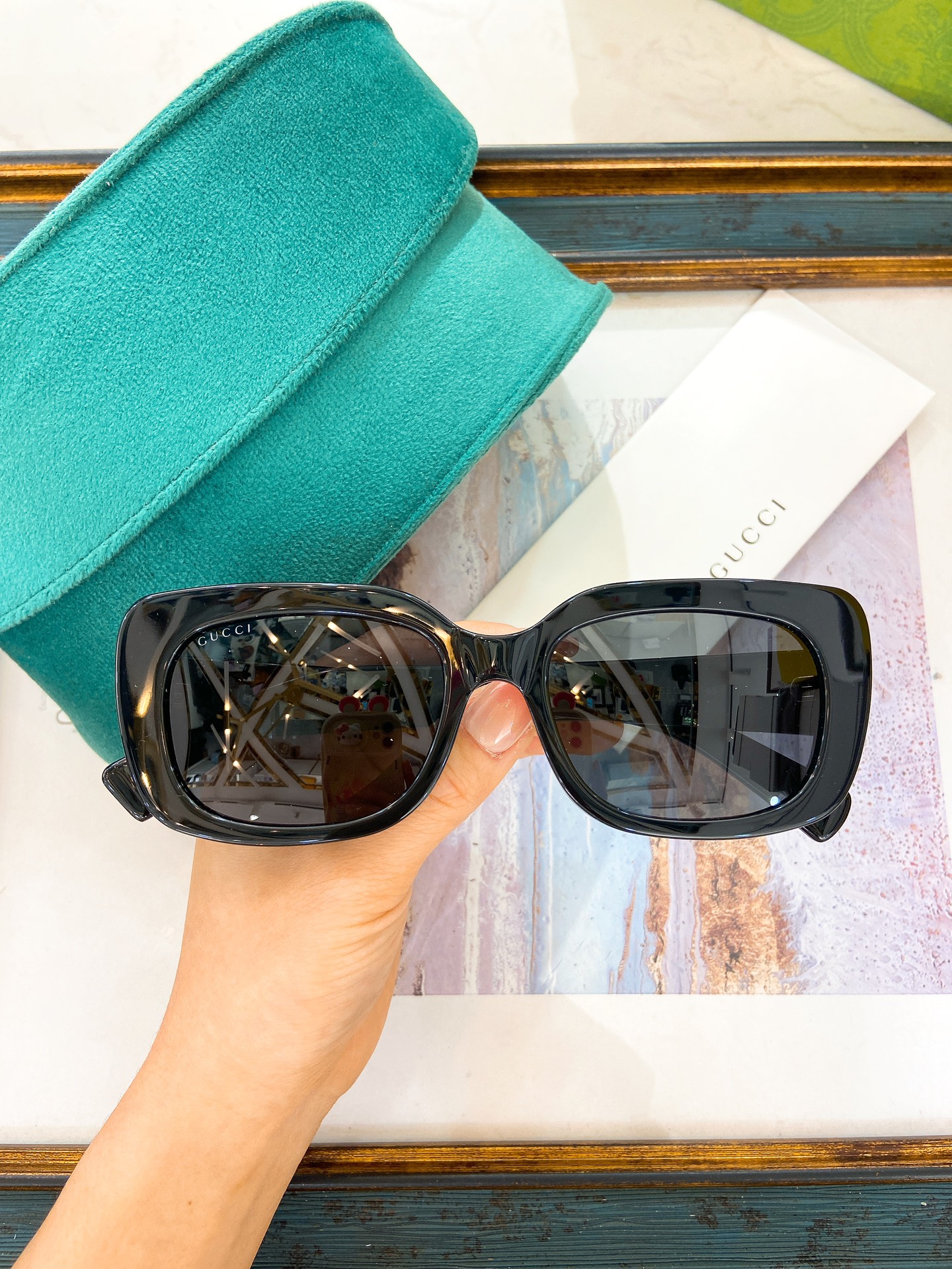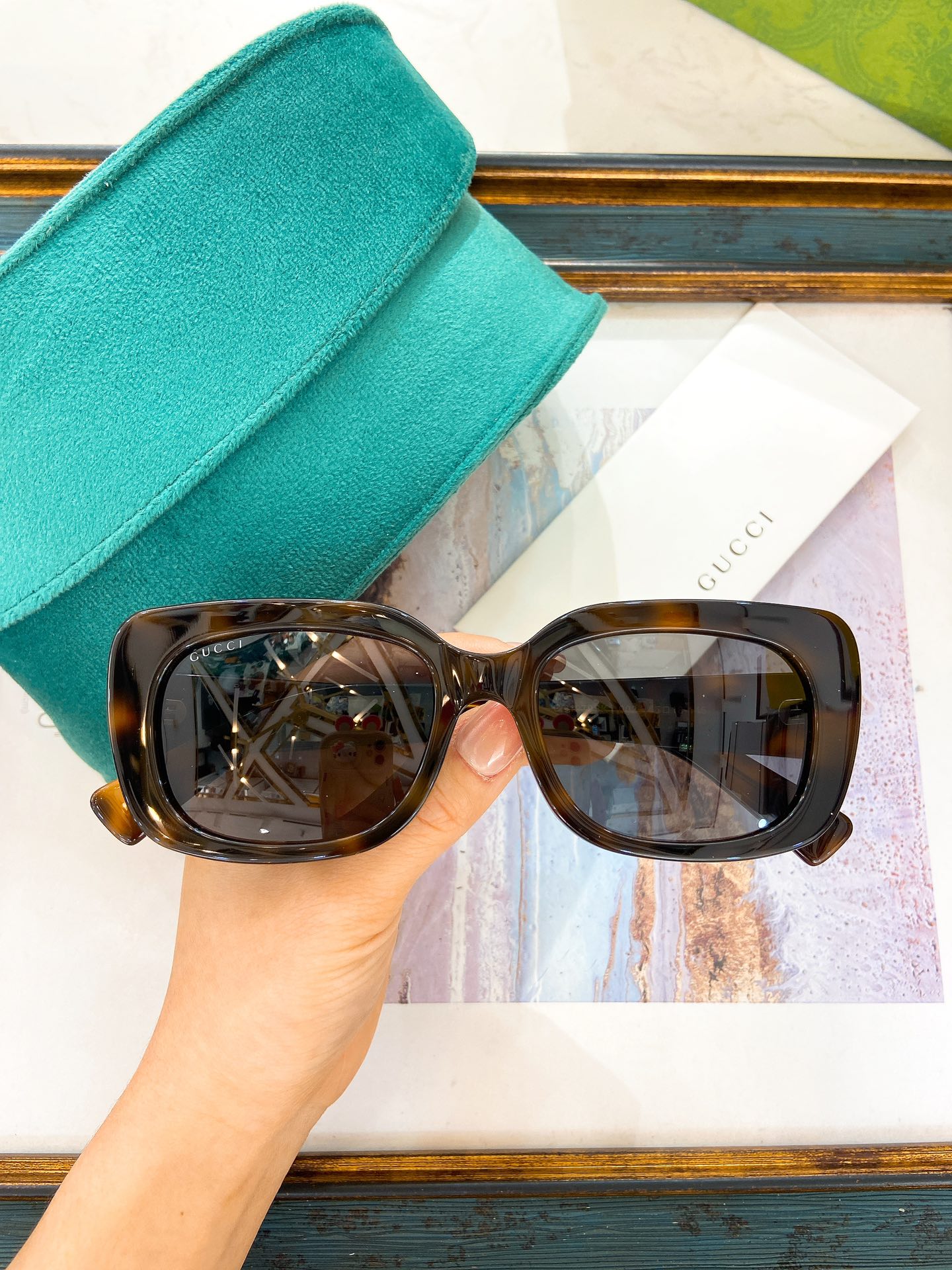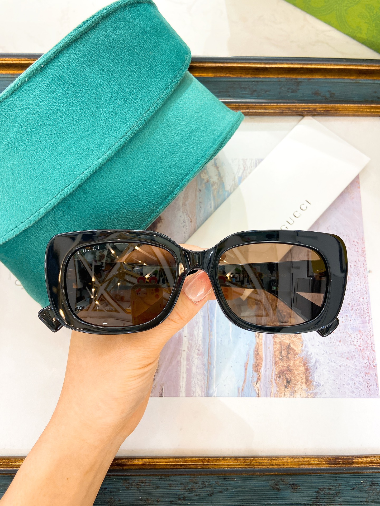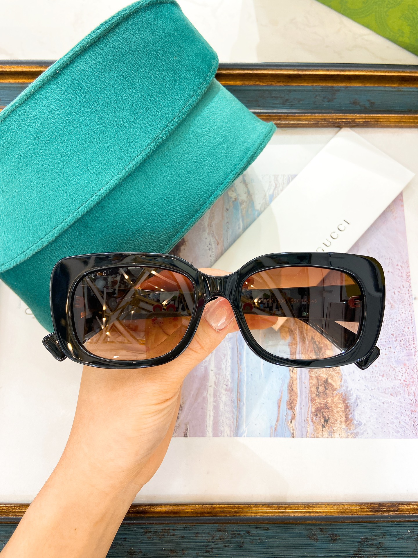 这款太阳眼镜是AAAAA 1:1 质量 (非常棒). 使用了和原版一模一样的材料. 商标部分也保持了和古奇/Gucci一样. 图片拍摄是实物太阳眼镜拍摄, 您所收到的实物保证和我们图片一模一样.