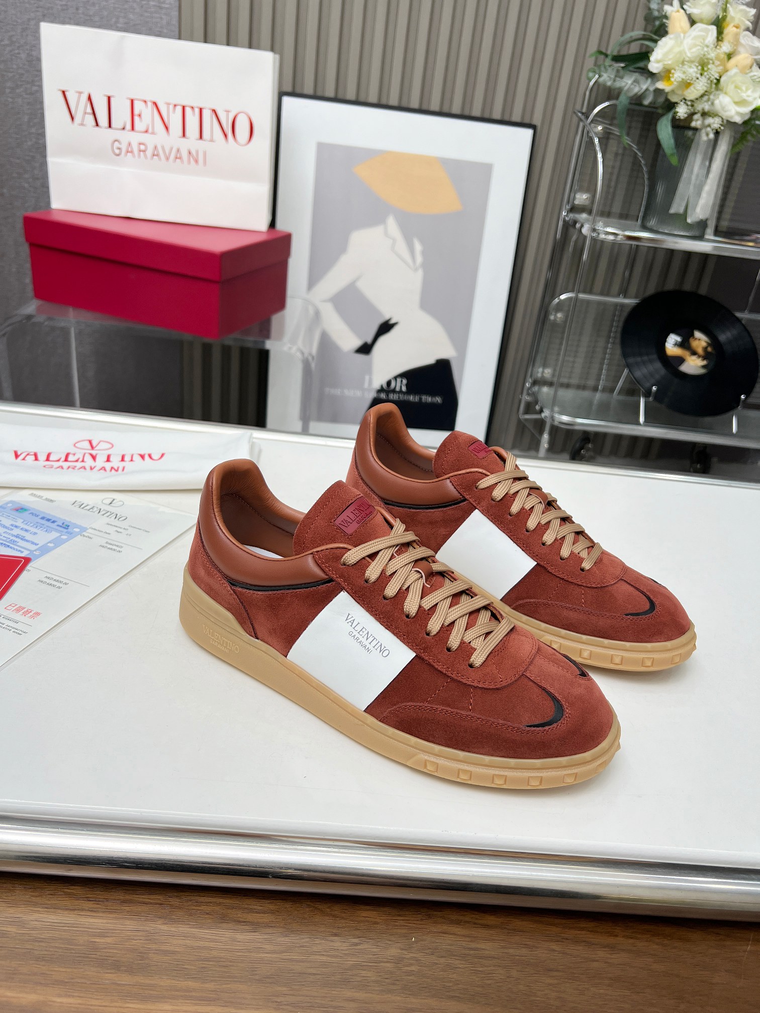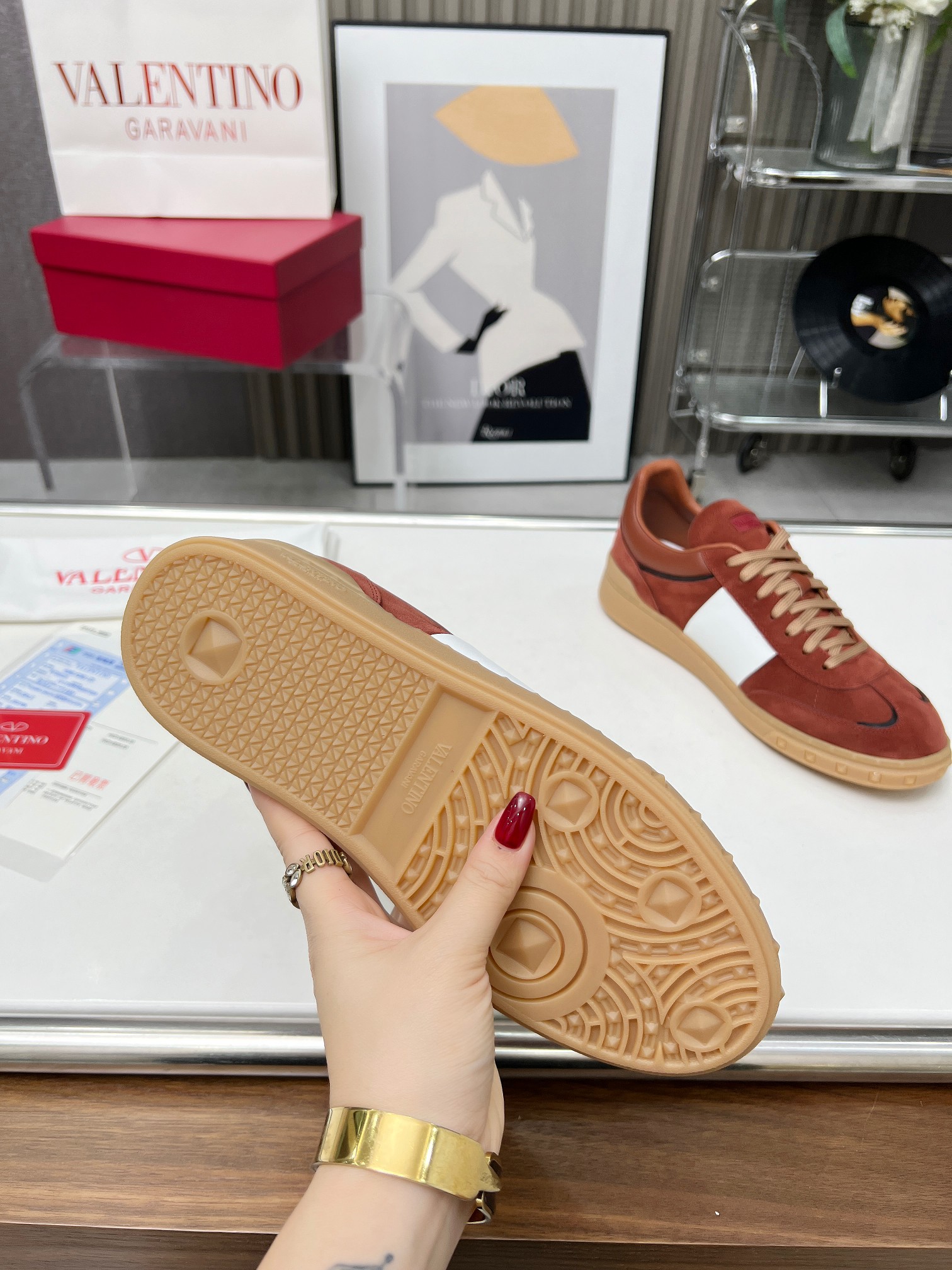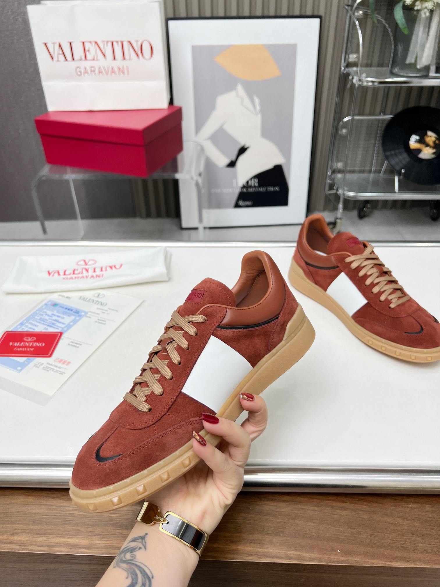 这款鞋子是AAAAA 1:1 质量 (非常棒). 使用了和原版一模一样的材料. 商标部分也保持了和华伦天奴/Valentino一样. 图片拍摄是实物鞋子拍摄, 您所收到的实物保证和我们图片一模一样.